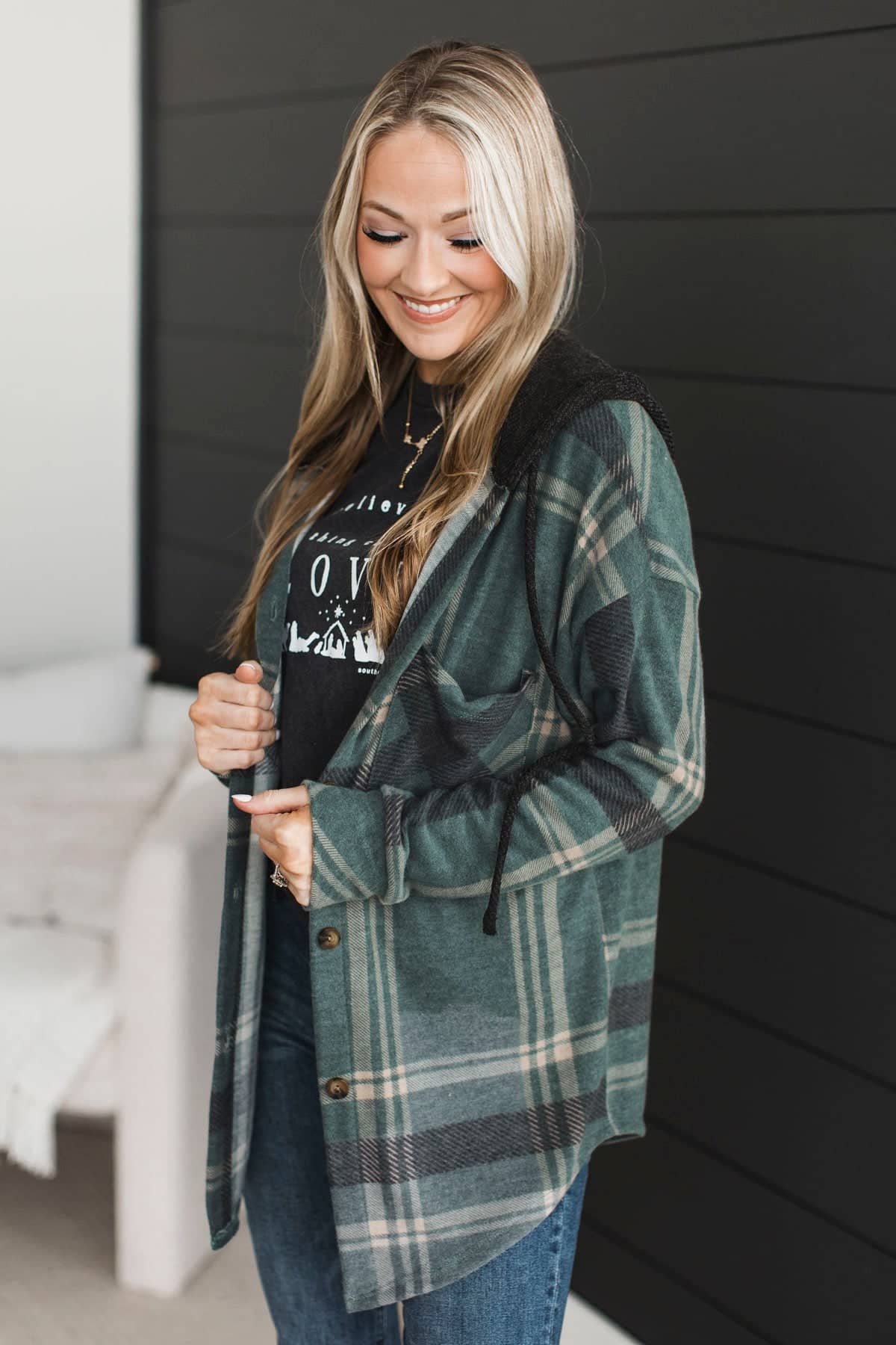 Hopeful Smiles Hooded Plaid Button Top- Dusty Jade & Black