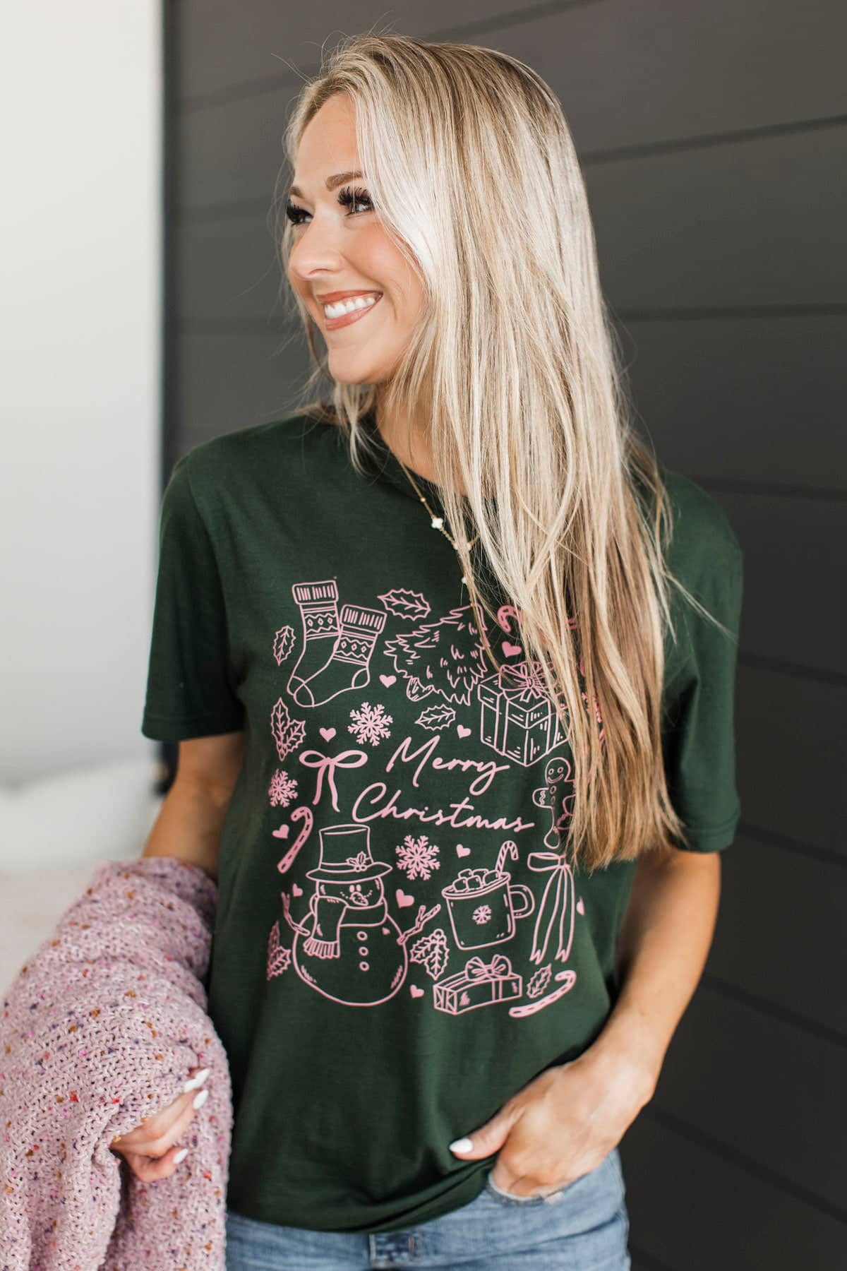 "Merry Christmas" Graphic Tee- Wintergreen & Pink