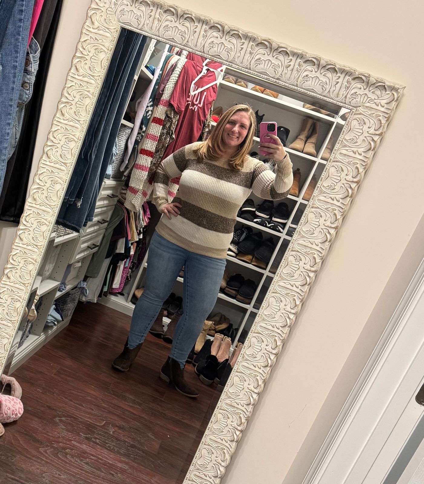 Love the color and style of this sweater. It was a little longer and less fitted but my usual size small fit good enough to where I didn’t return it.