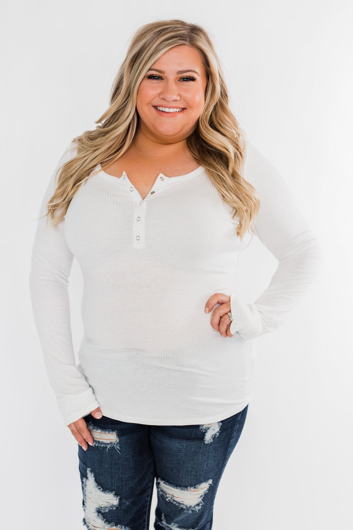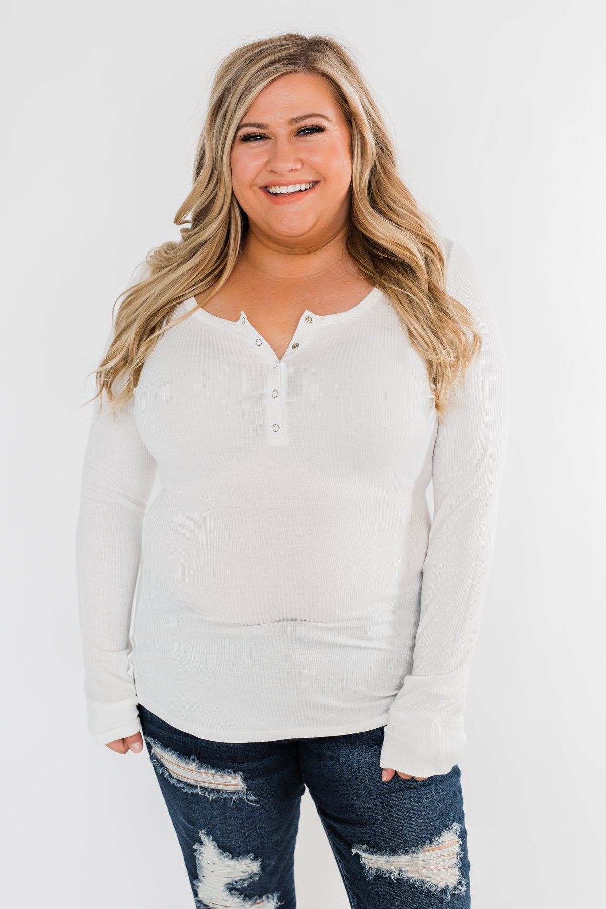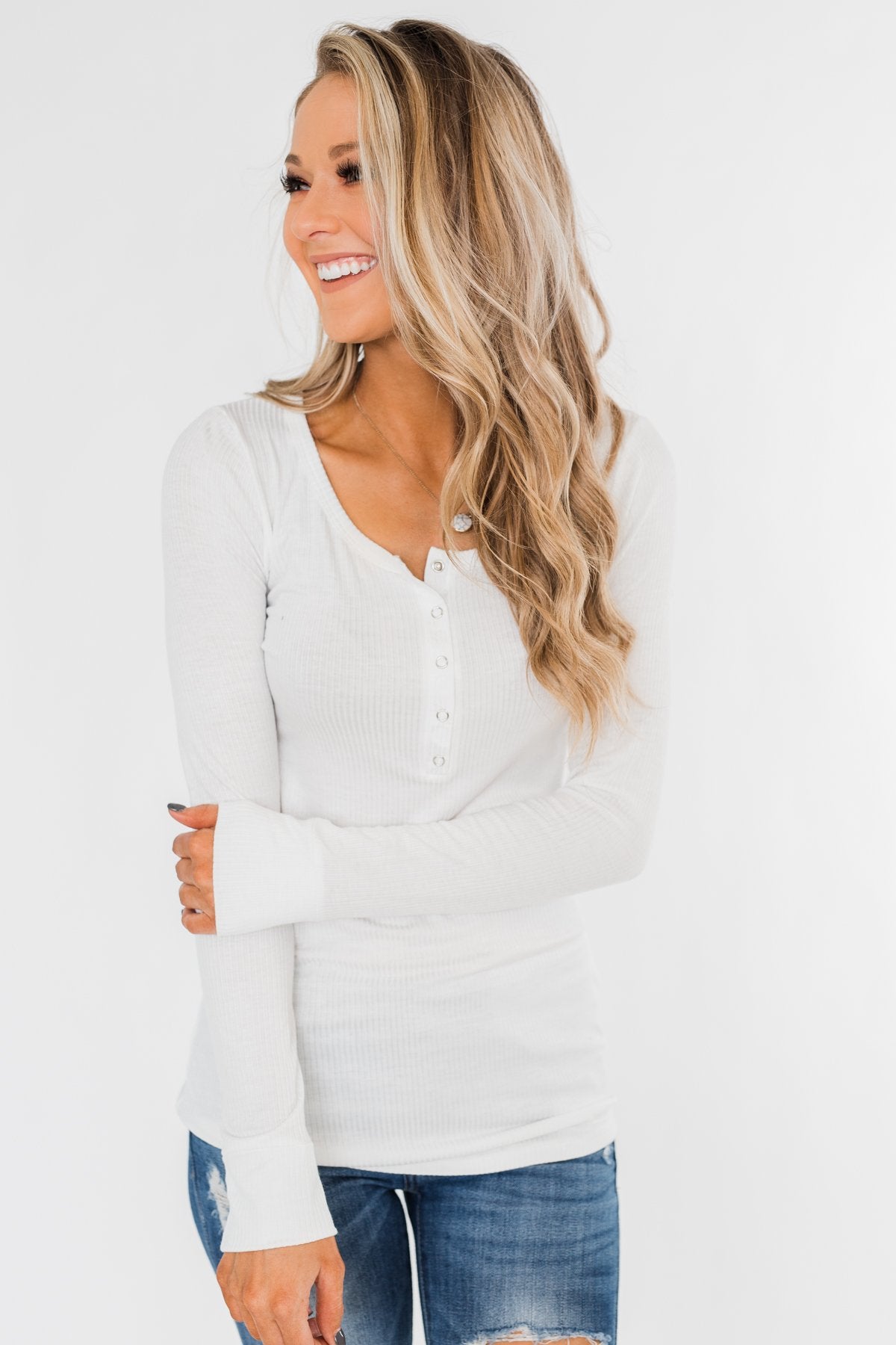 Lightweight, solid ivory henley top with a snap button detail. This top is an essential piece for your Fall and Winter wardrobe, you're going to need one in every color!