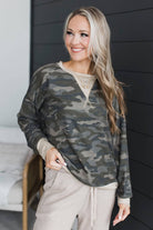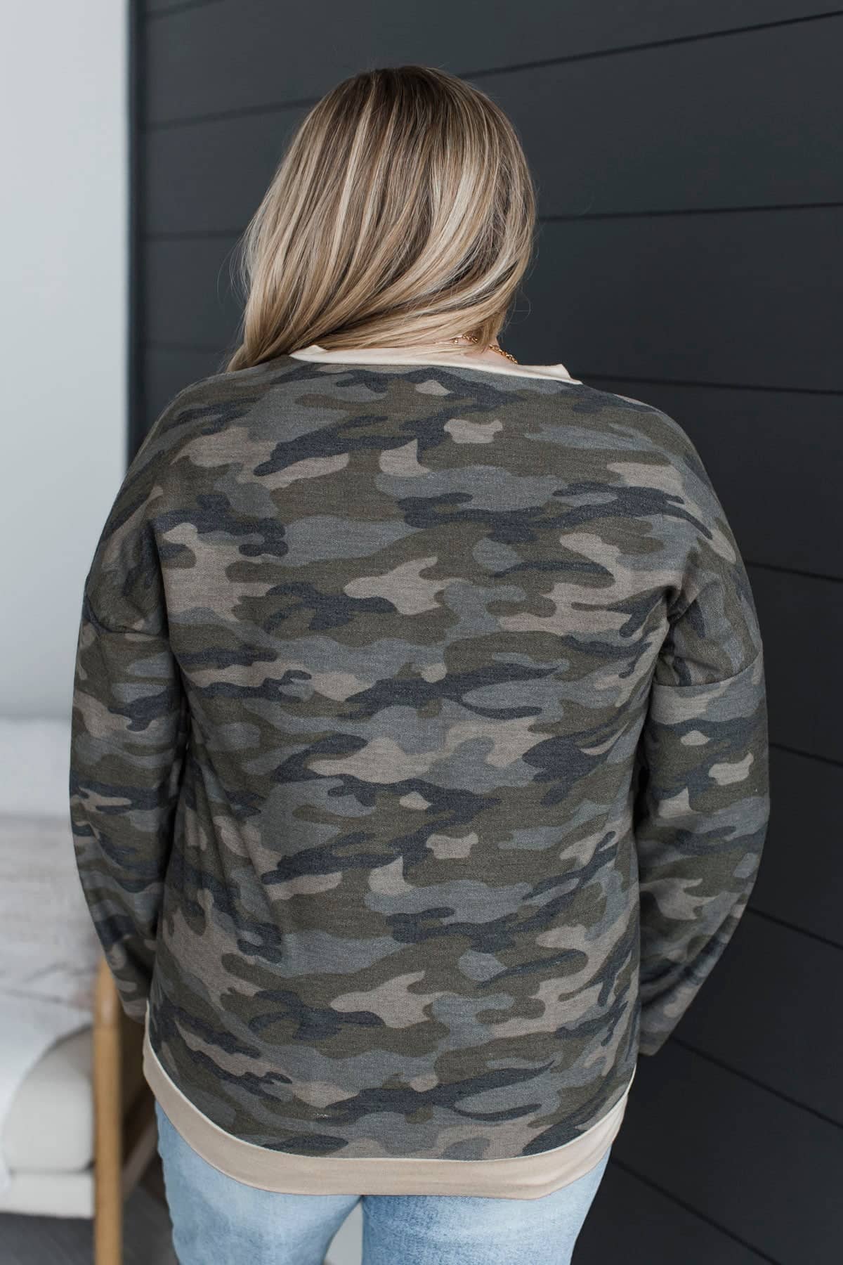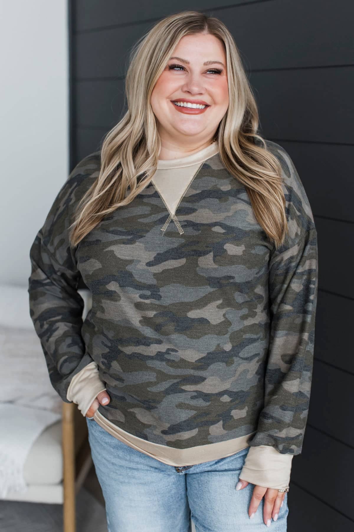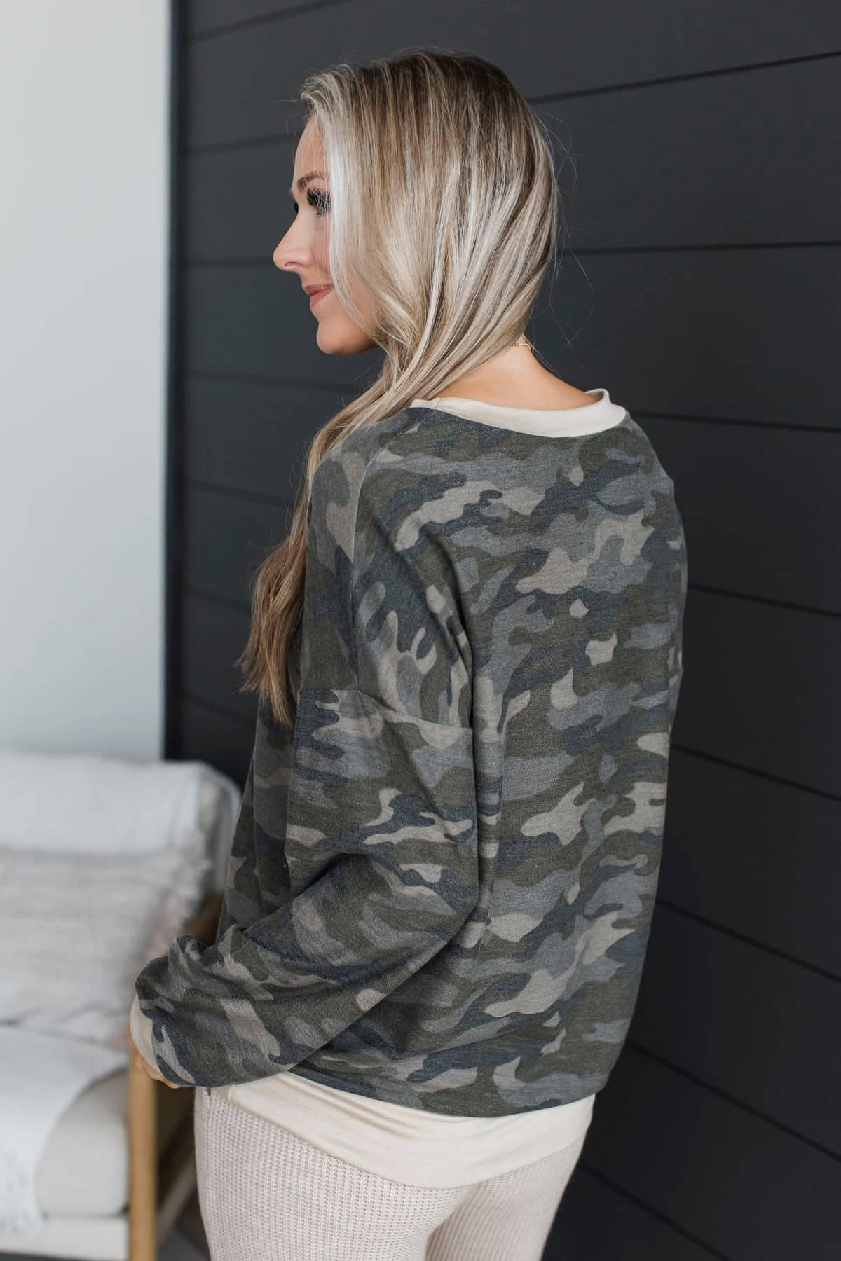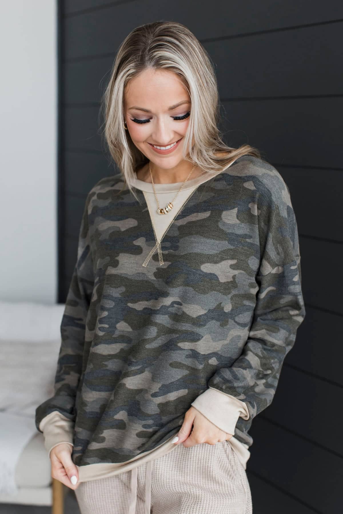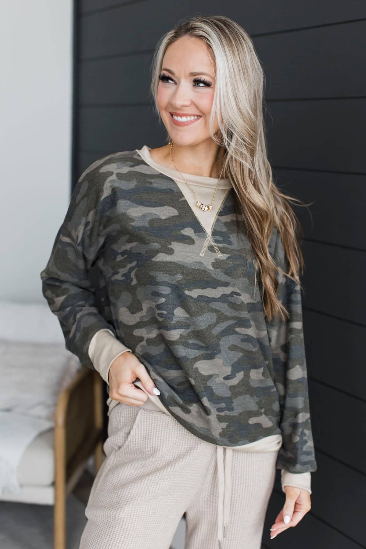 Compelling Stories Knit Pullover Top- Camo & Beige