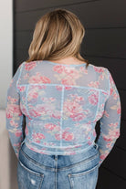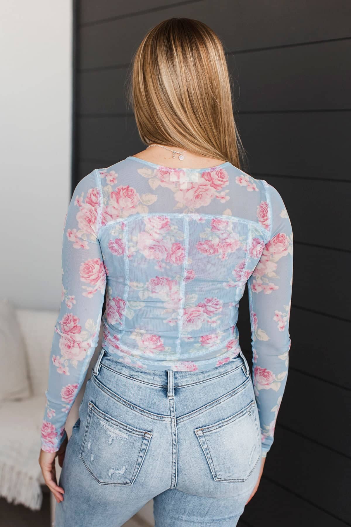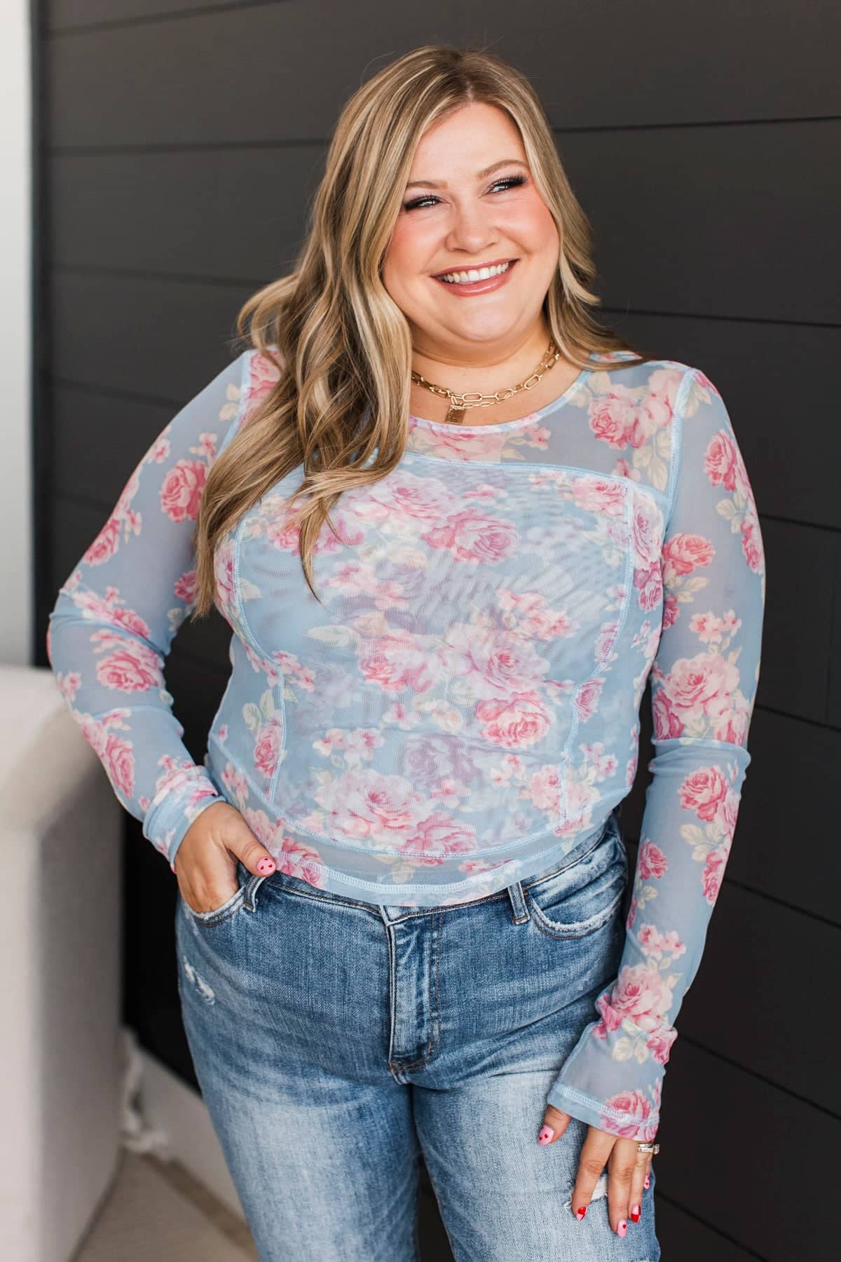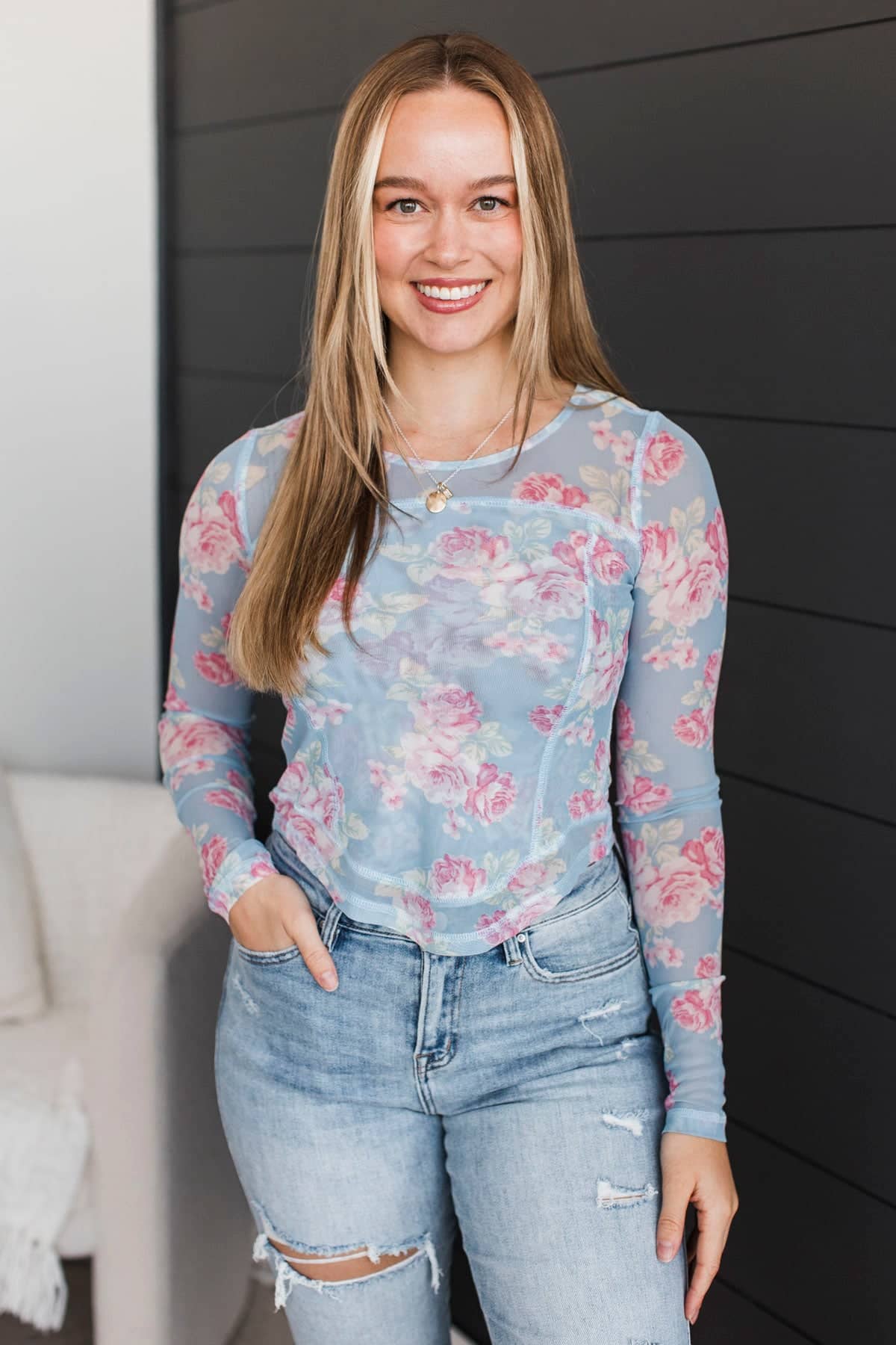 Blooming Brilliance Floral Mesh Long Sleeve Top- Light Blue