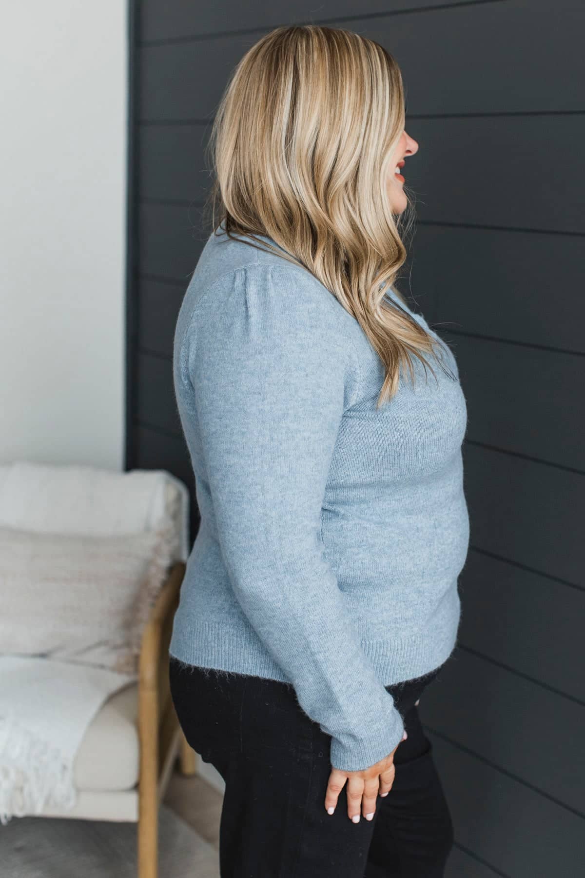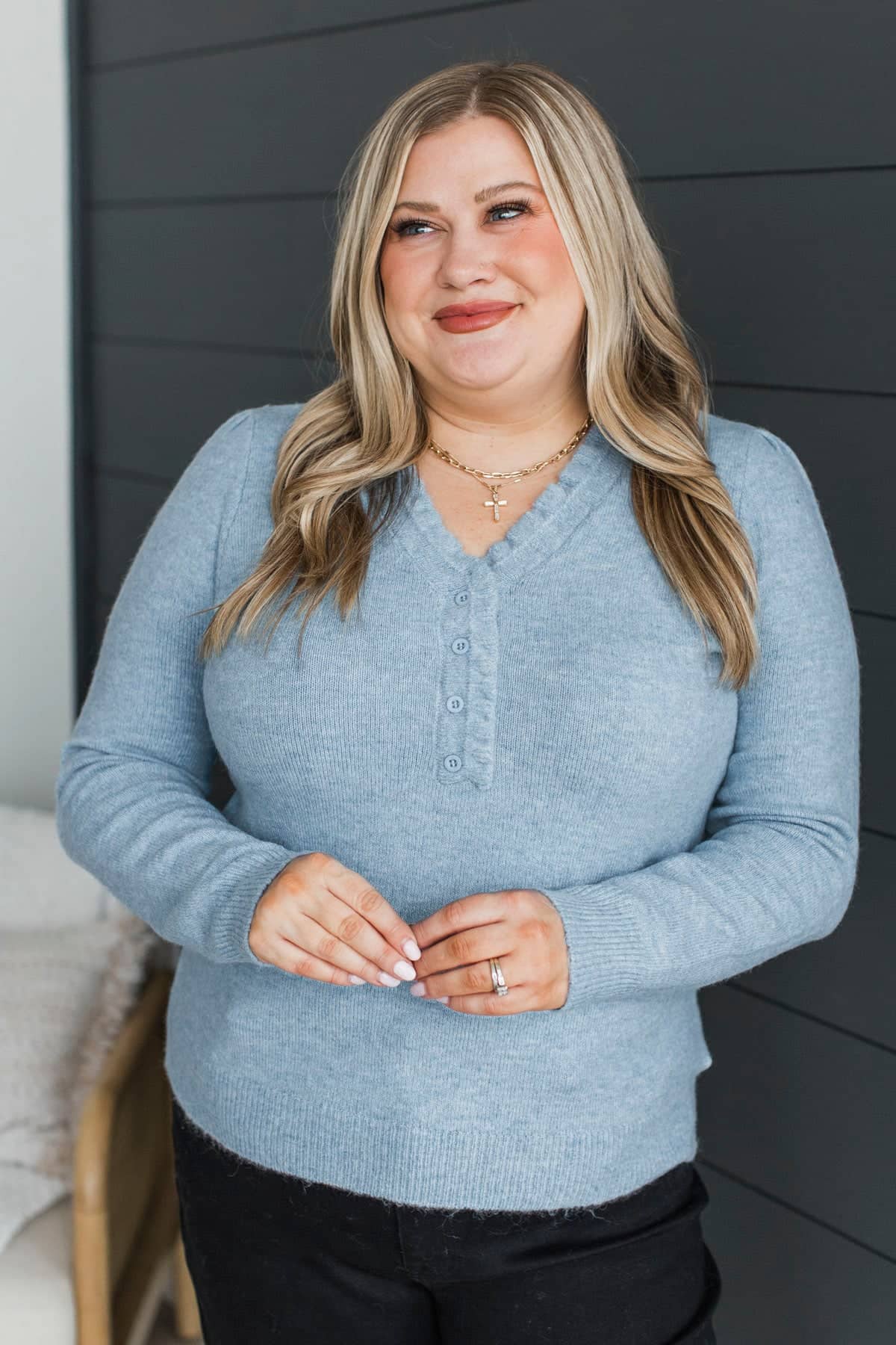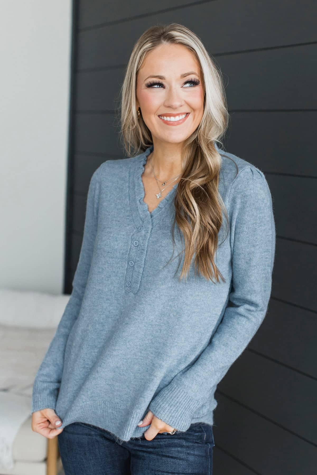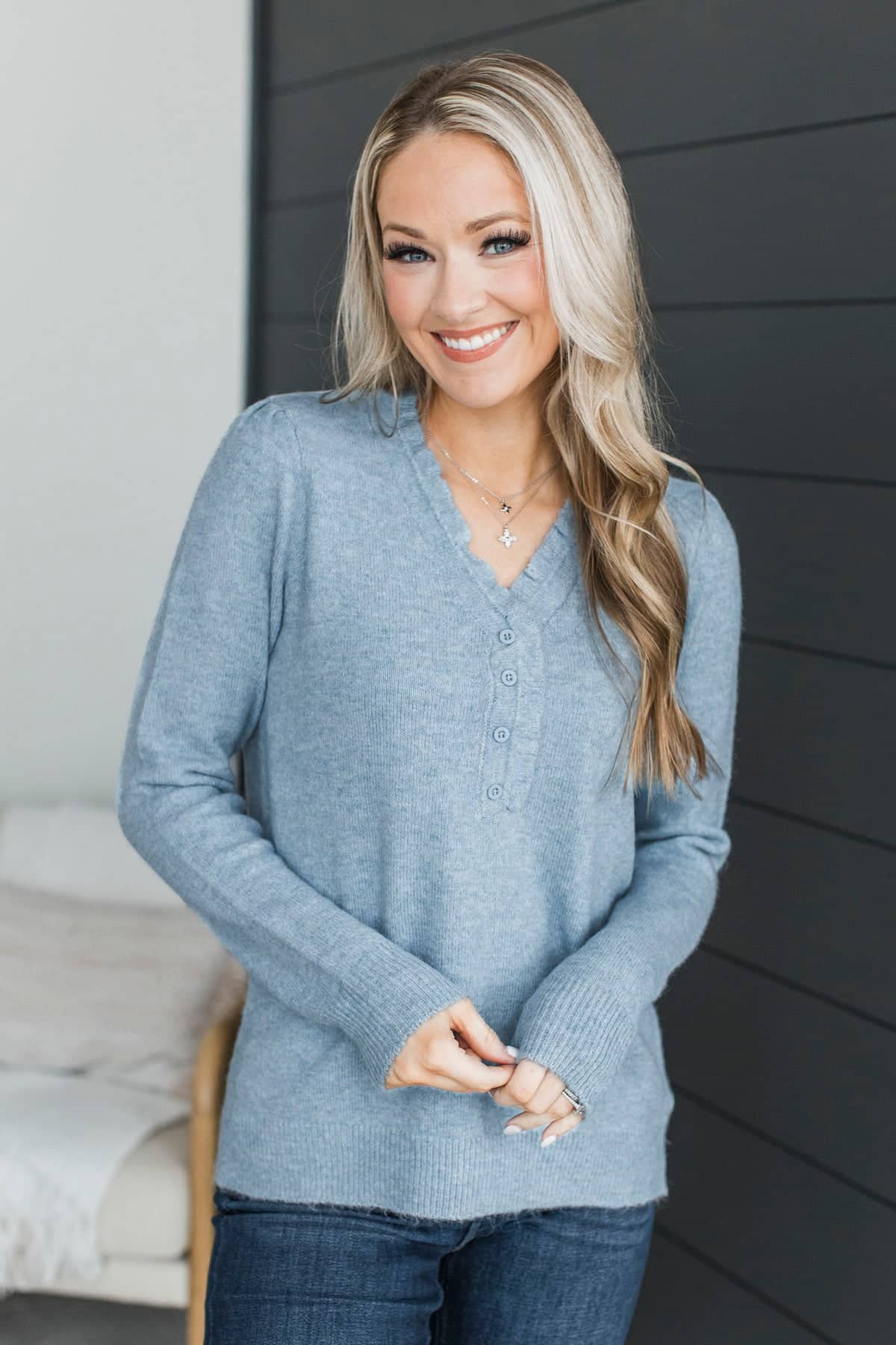Romantic Love Ruffle V-Neck Sweater- Blue