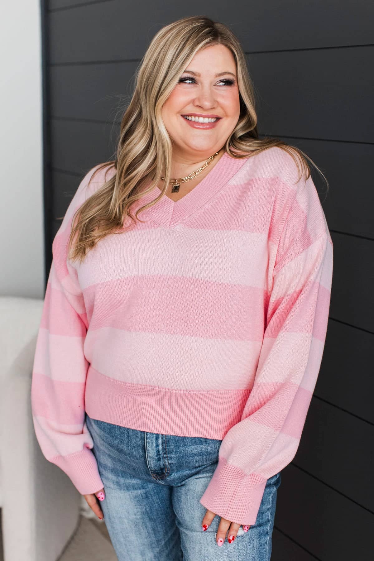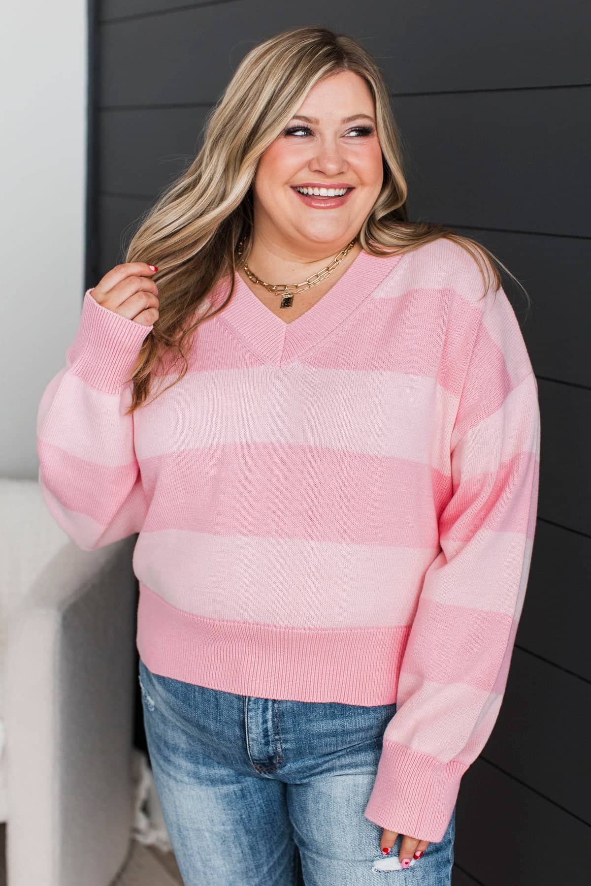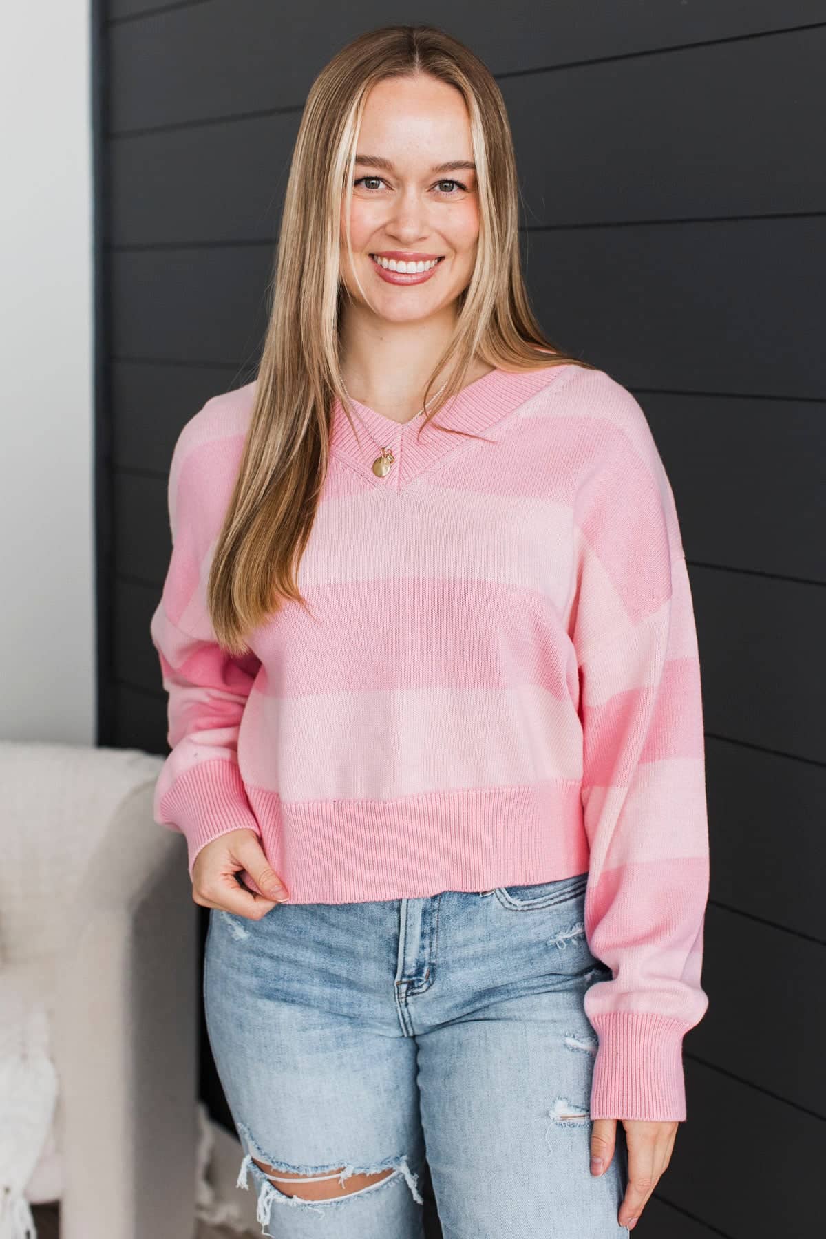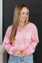 Uniquely Me Striped V-Neck Knit Sweater- Light Pink