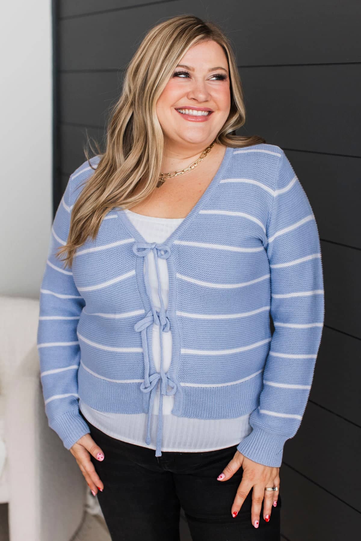 Always Us Striped Bow Tie Cardigan- Light Blue & Ivory