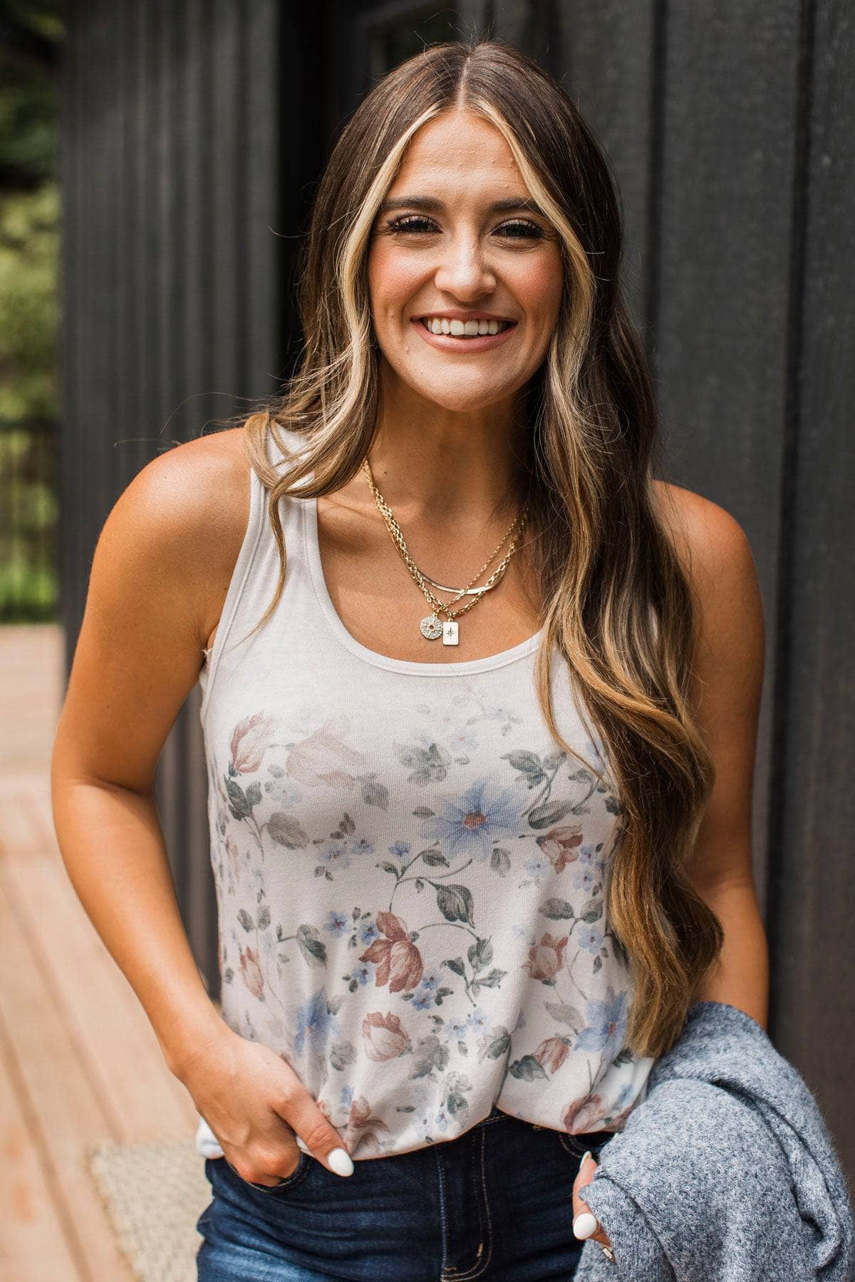 Beautiful Sentiments Floral Tank Top- Ivory & Blue