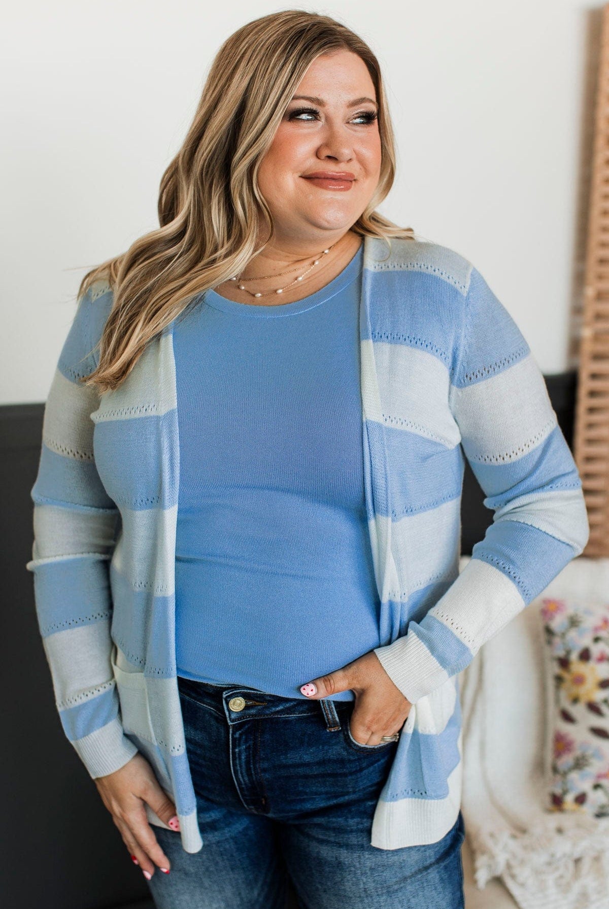 Sweet & Sincere Striped Pointelle Cardigan- Ivory & Chambray