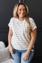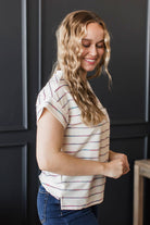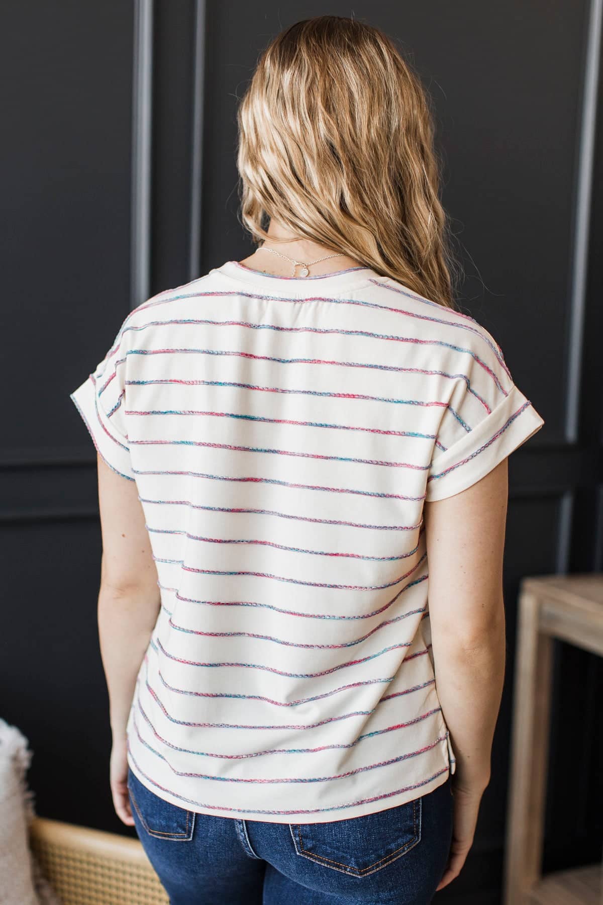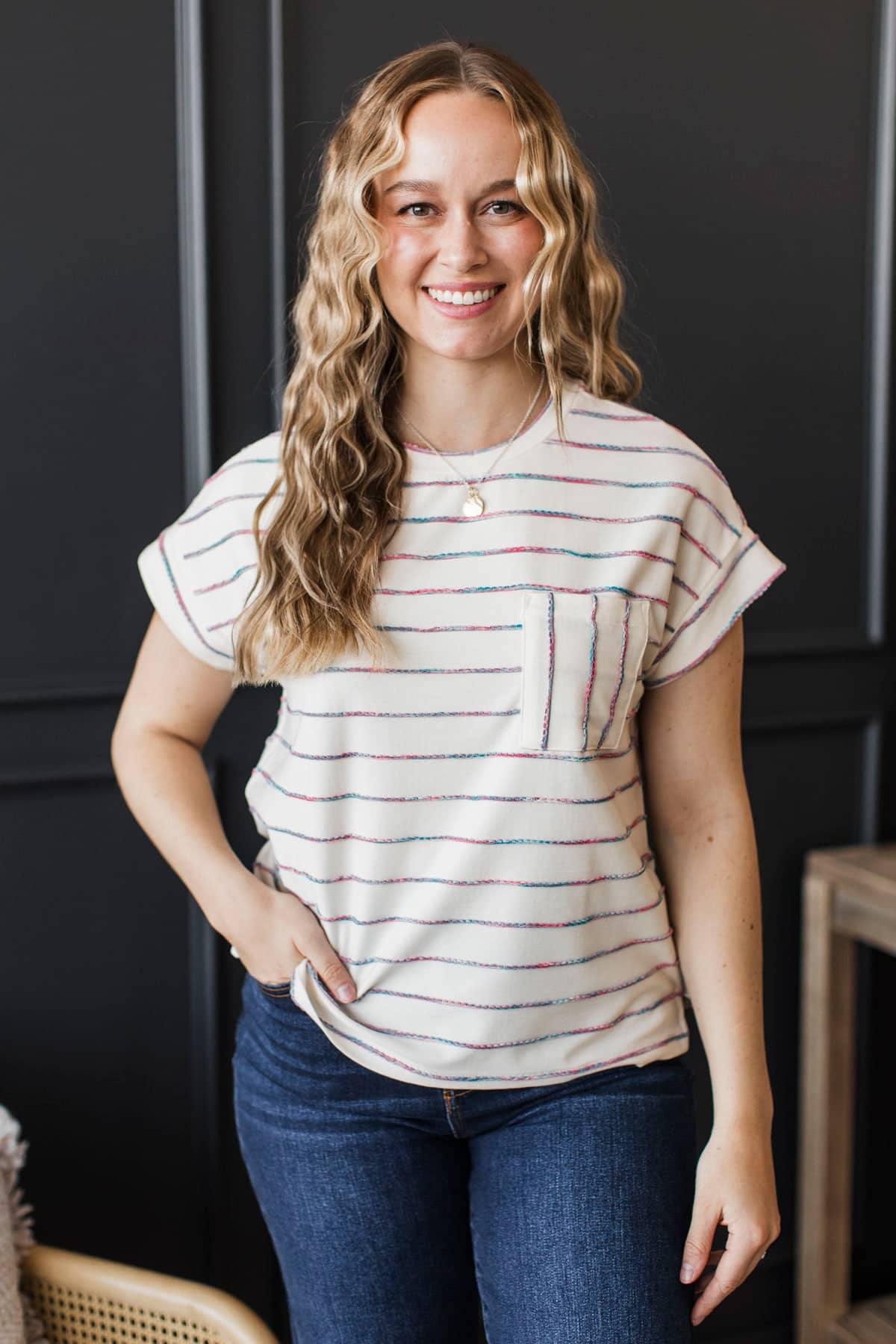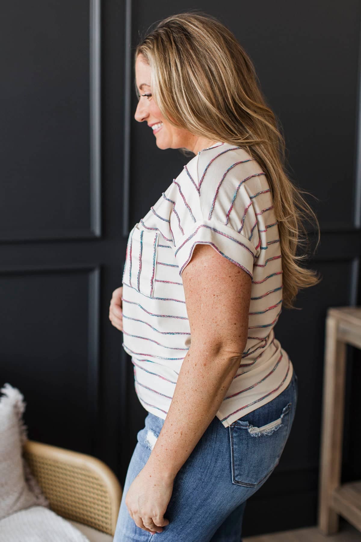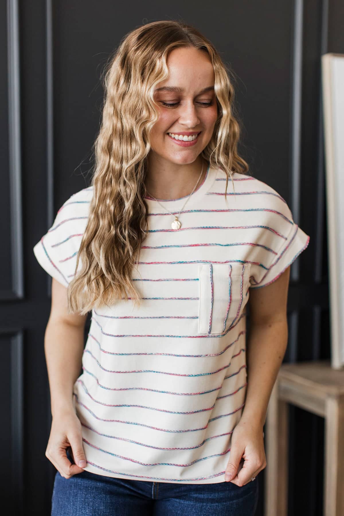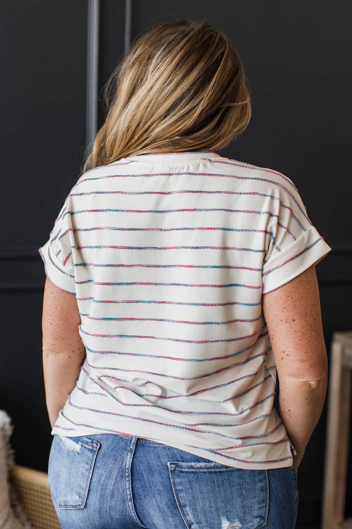 Authentic Personality Striped Short Sleeve Top- Ivory & Teal