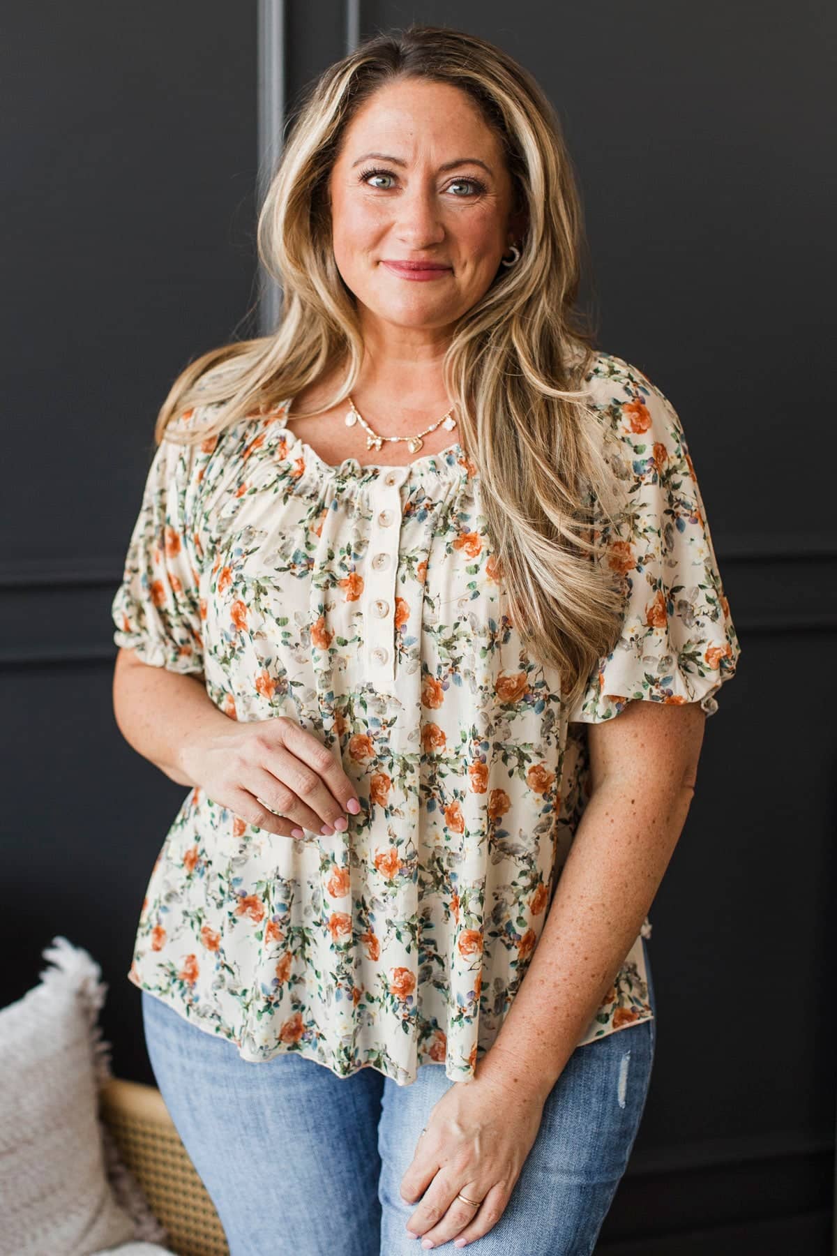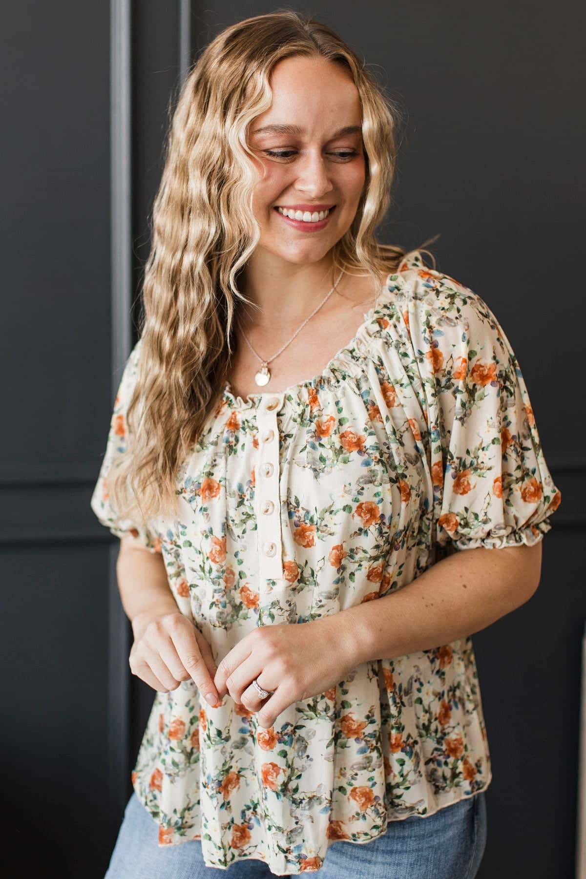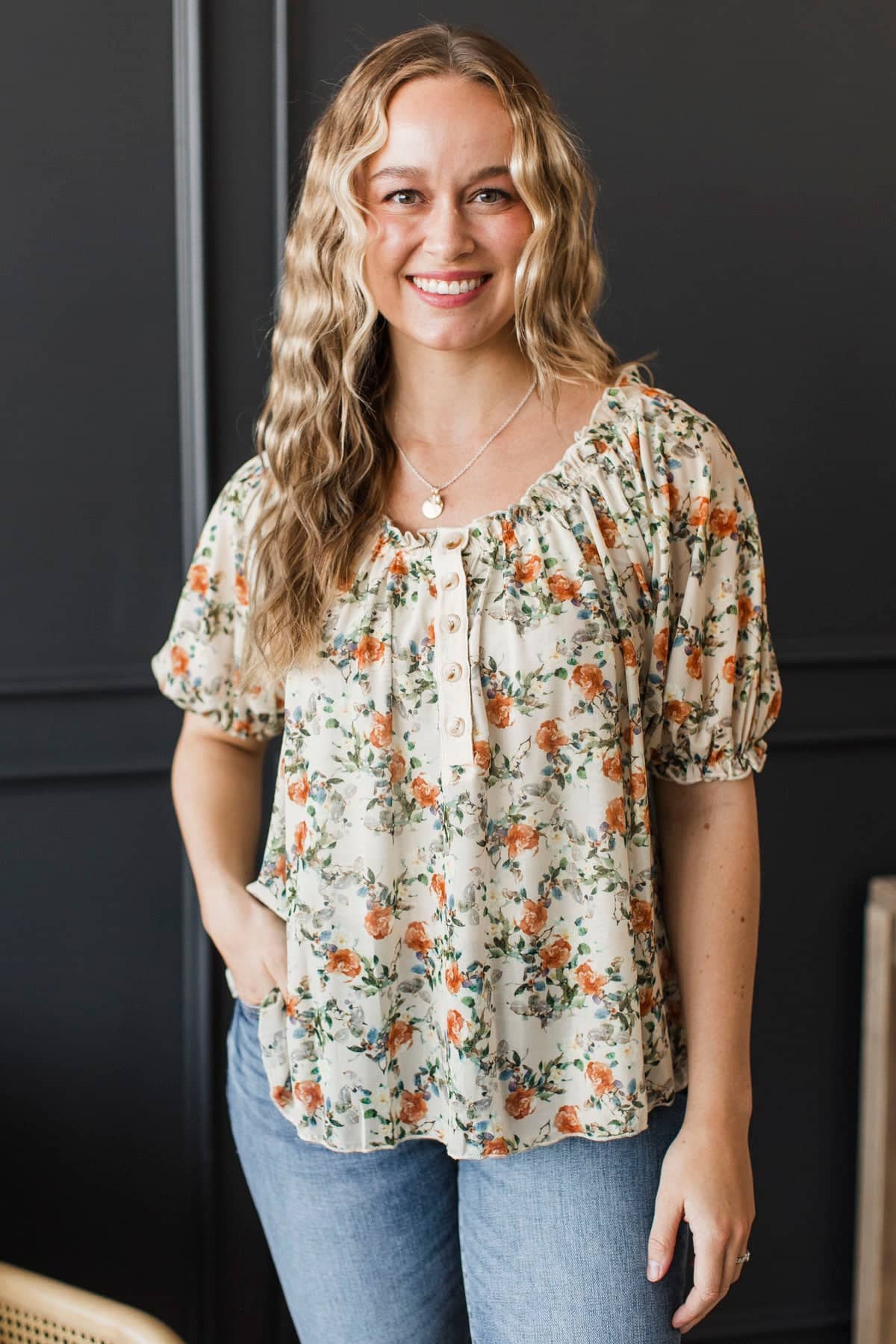 Treasured Times Puff Sleeve Floral Blouse- Beige