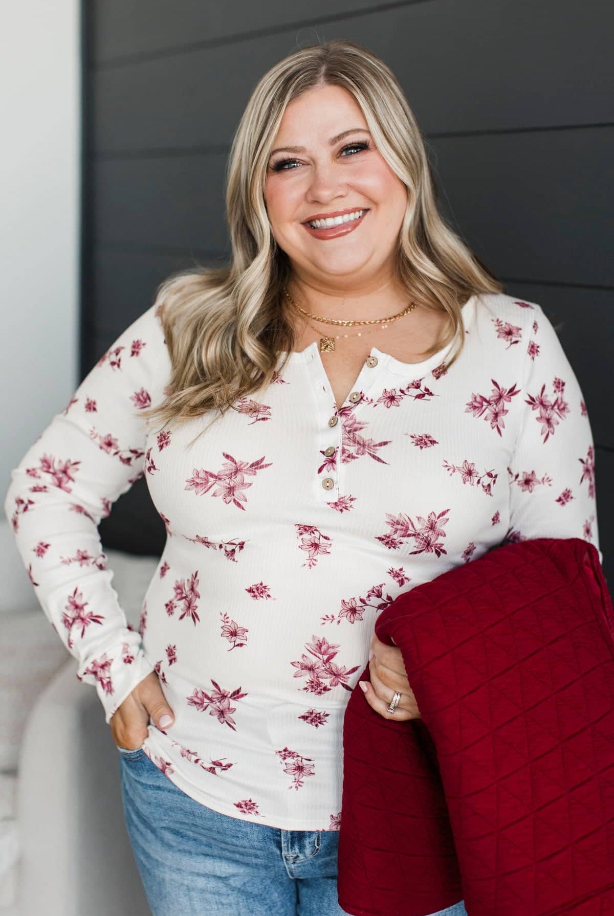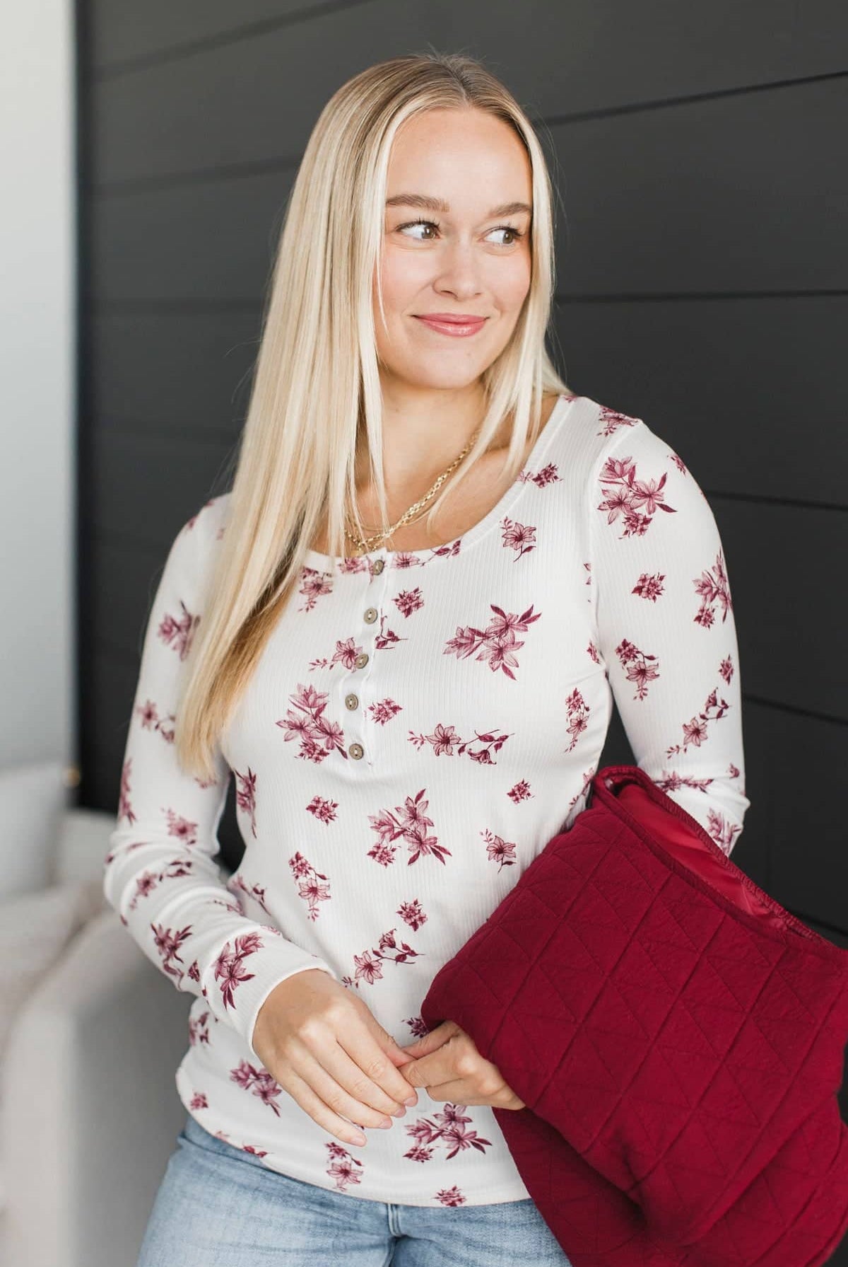 Call Me Lovely Floral Henley Top- White & Burgundy