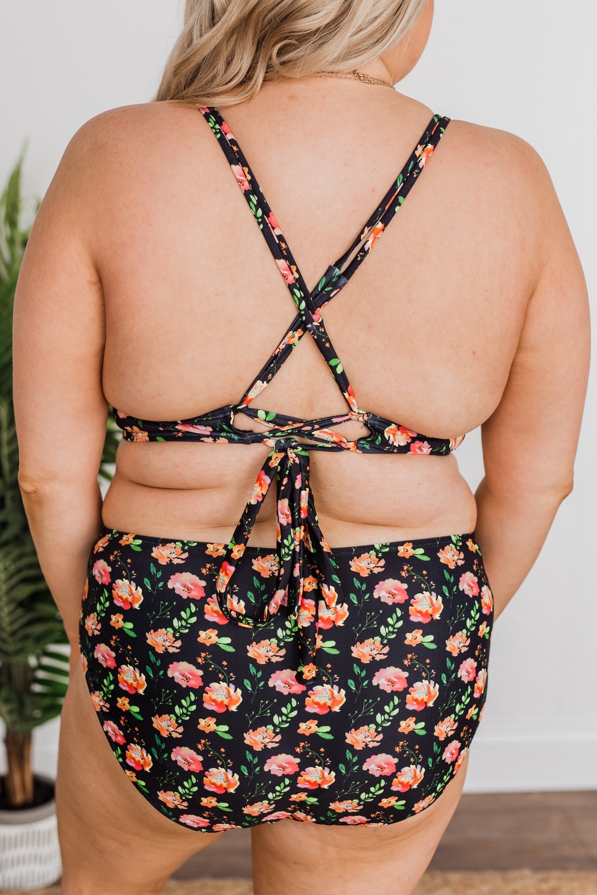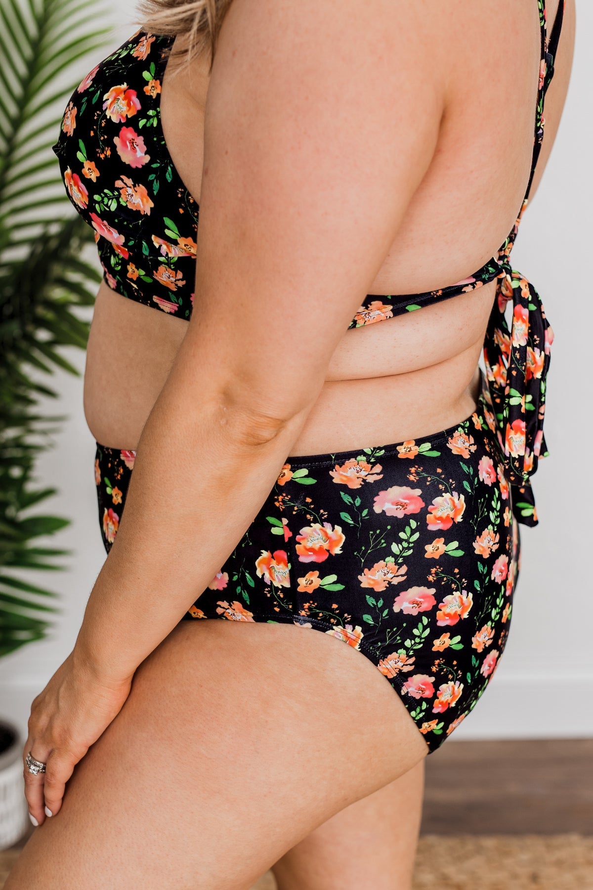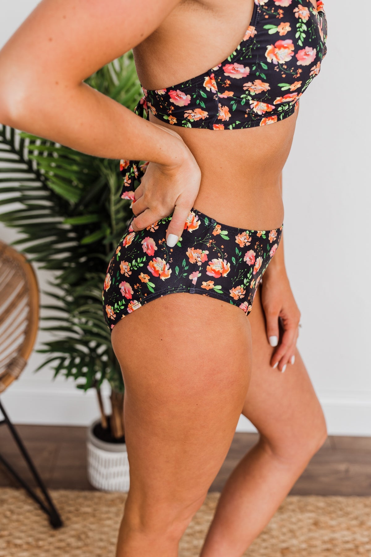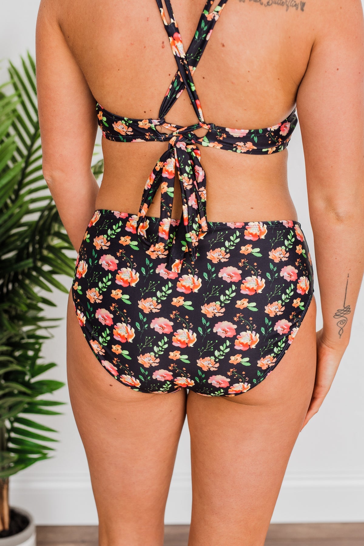 Bask In The Sun Mid-Rise Swim Bottoms- Black & Orange Floral
