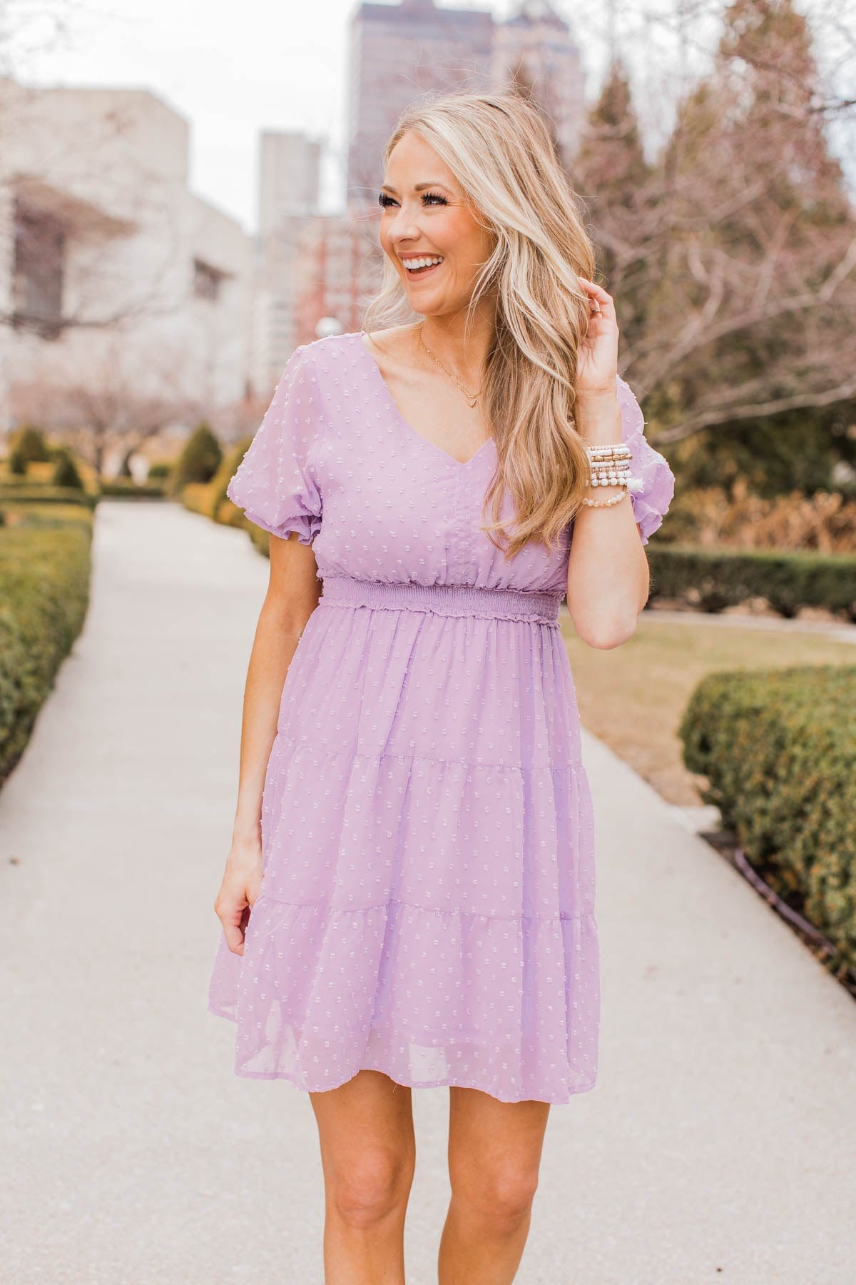 This dress is so lovely. The lilac color is perfect for spring, and I love the swiss dot material.