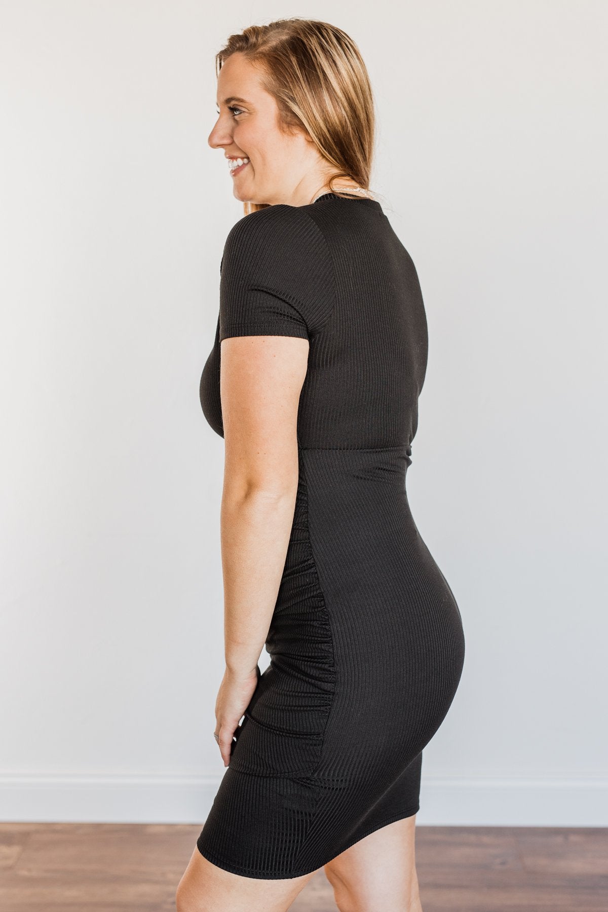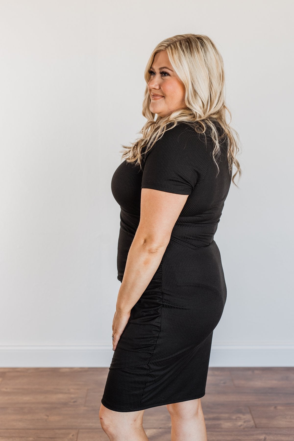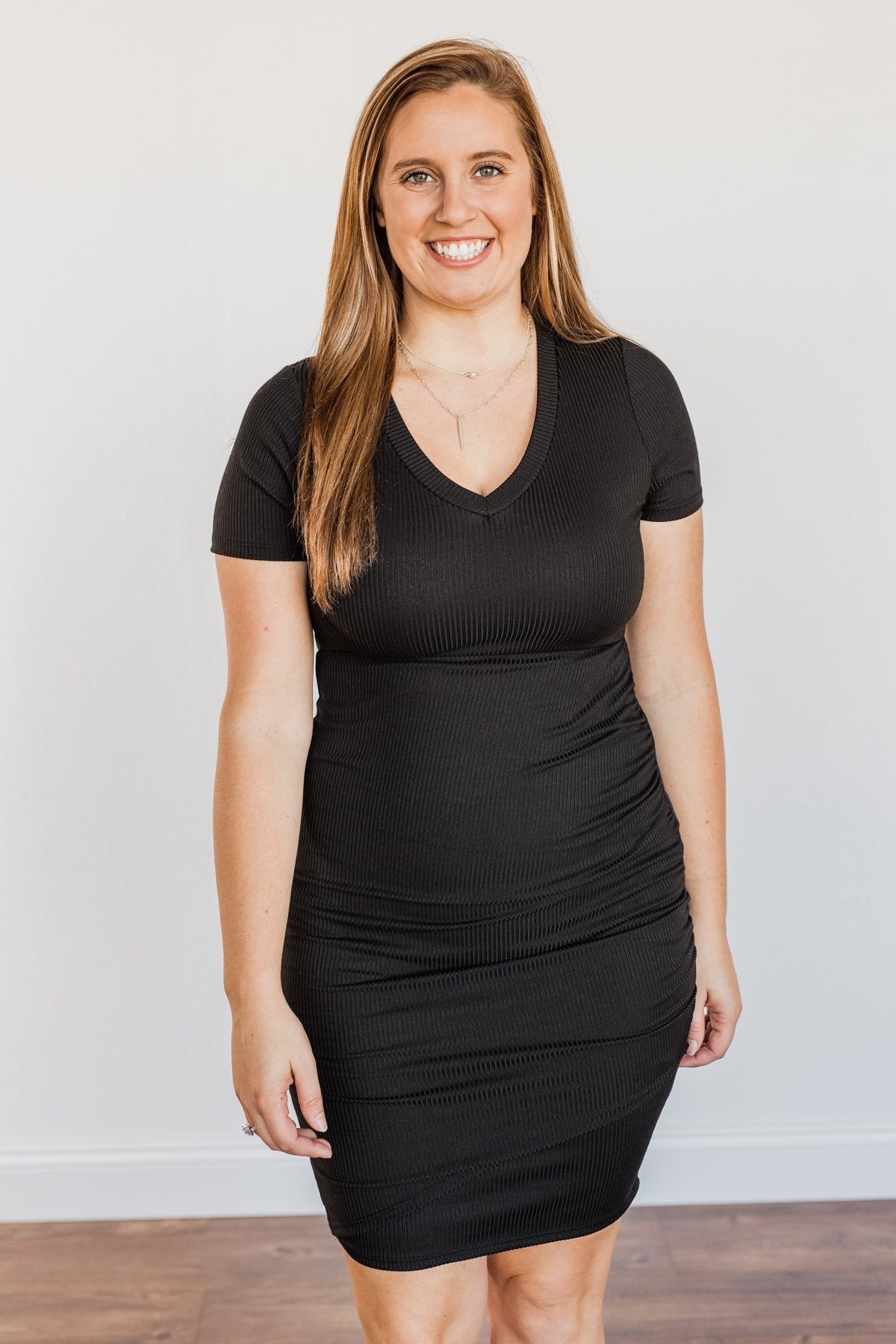 Dressing for date night just got easier with this stunning piece! This dress is all about the details with a v-neckline, tulip hemline, ruched detailing along the side, and a ribbed knit material! Paired with a jacket and heels, you will be ready for a night out on the town!
