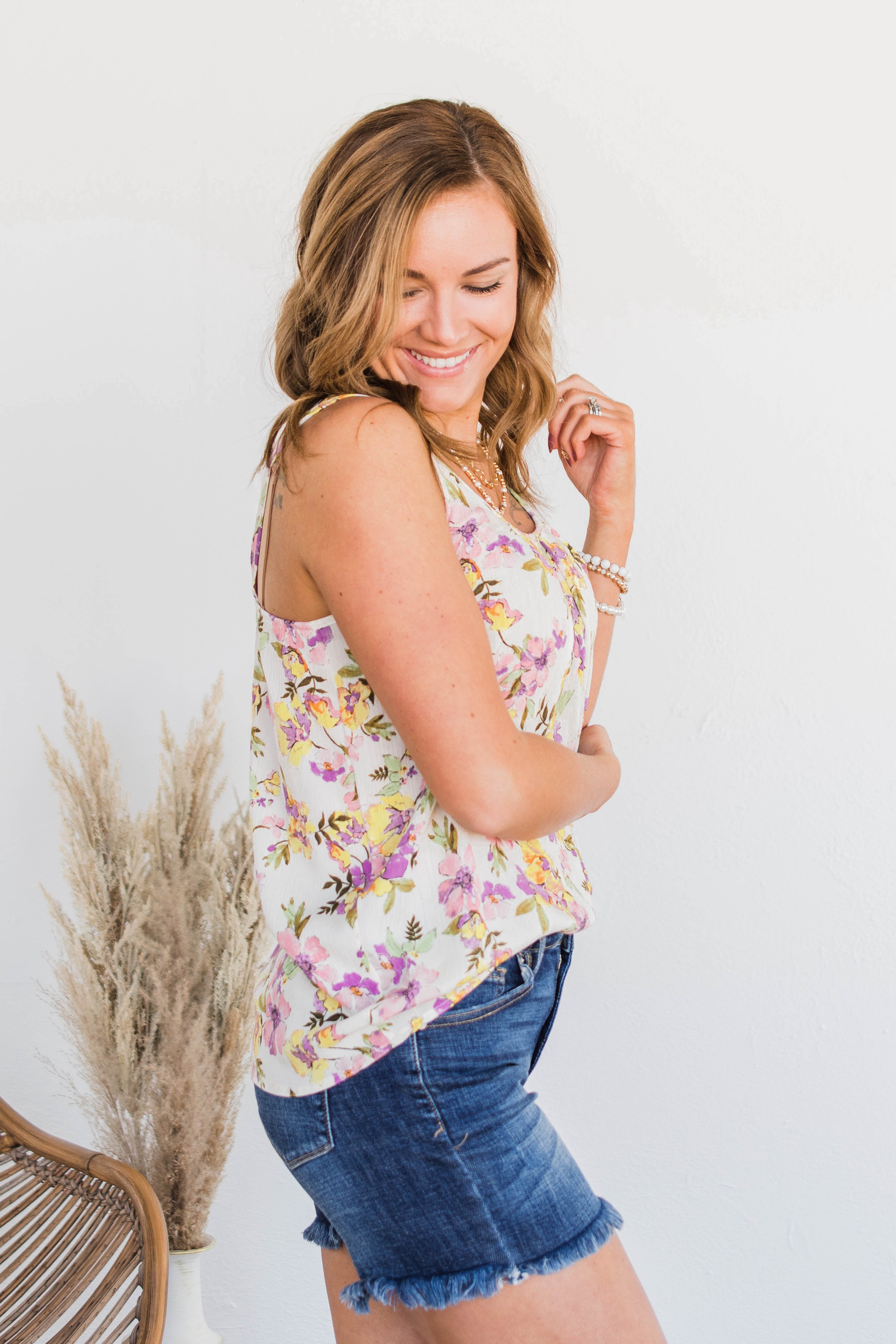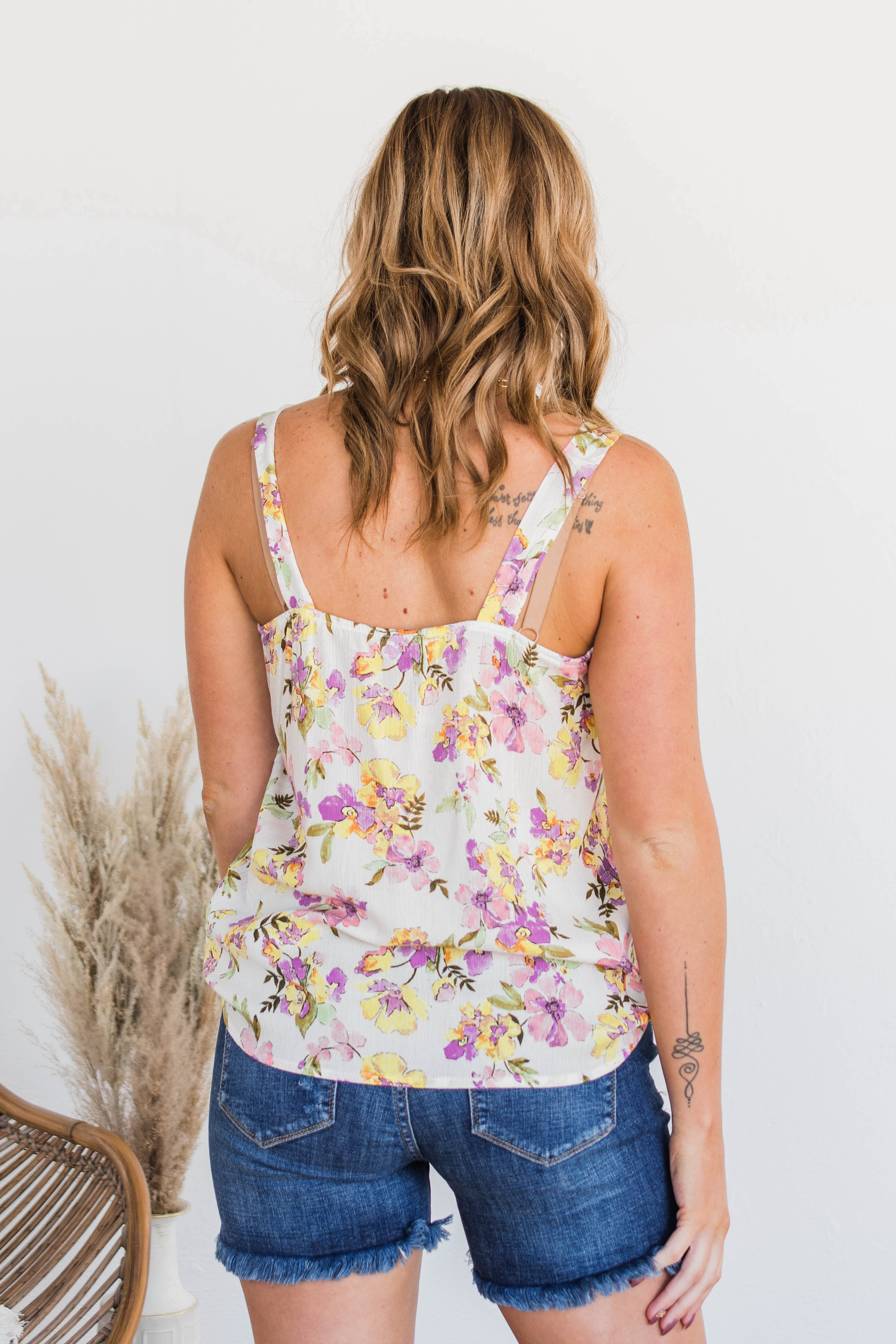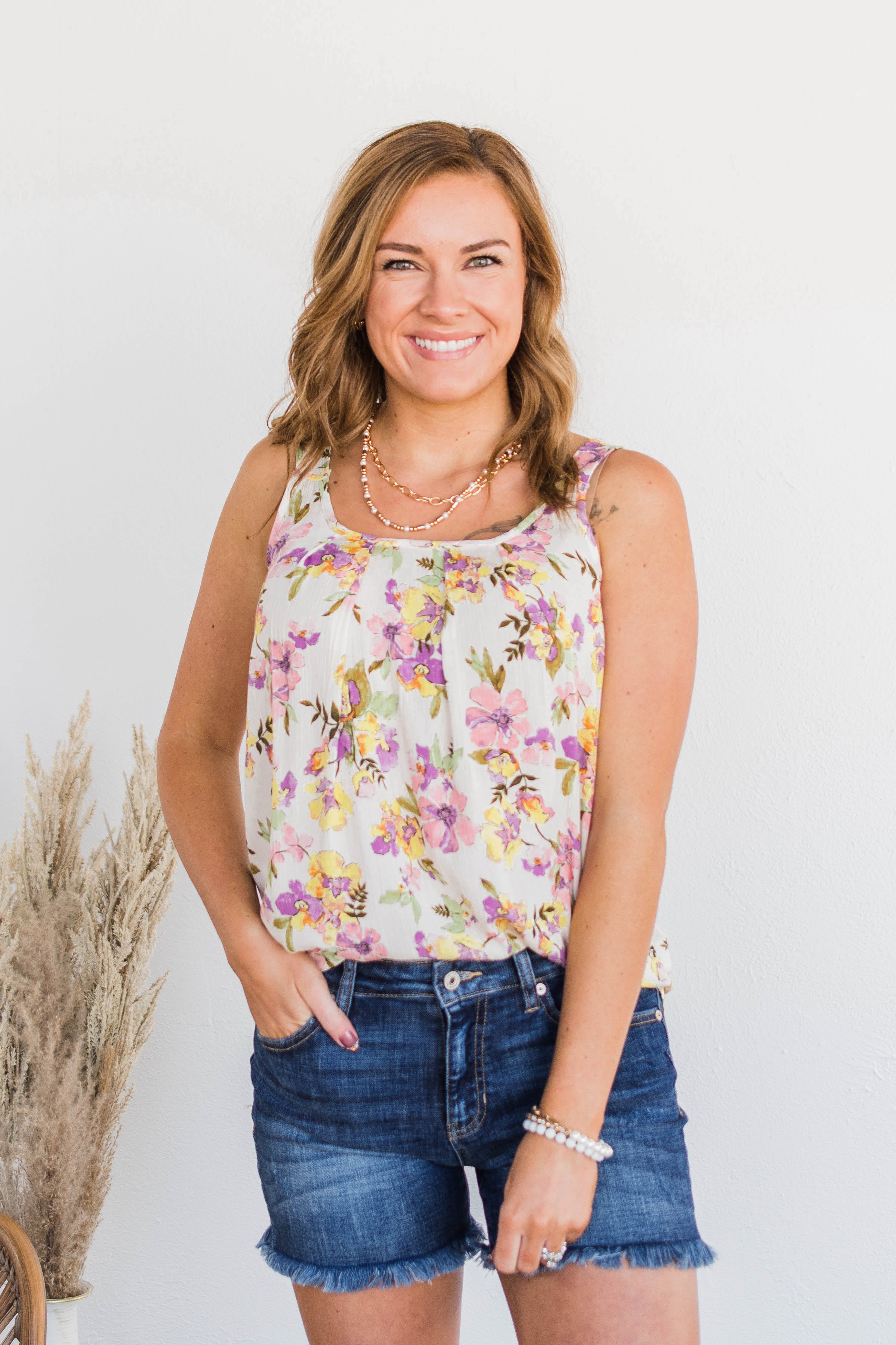 Fill your day with color whenever you’re in this gorgeous tank top! This top has all the details you desire such as the scoop neckline with a pleated design and pretty floral pattern that’s perfect for the upcoming season!
