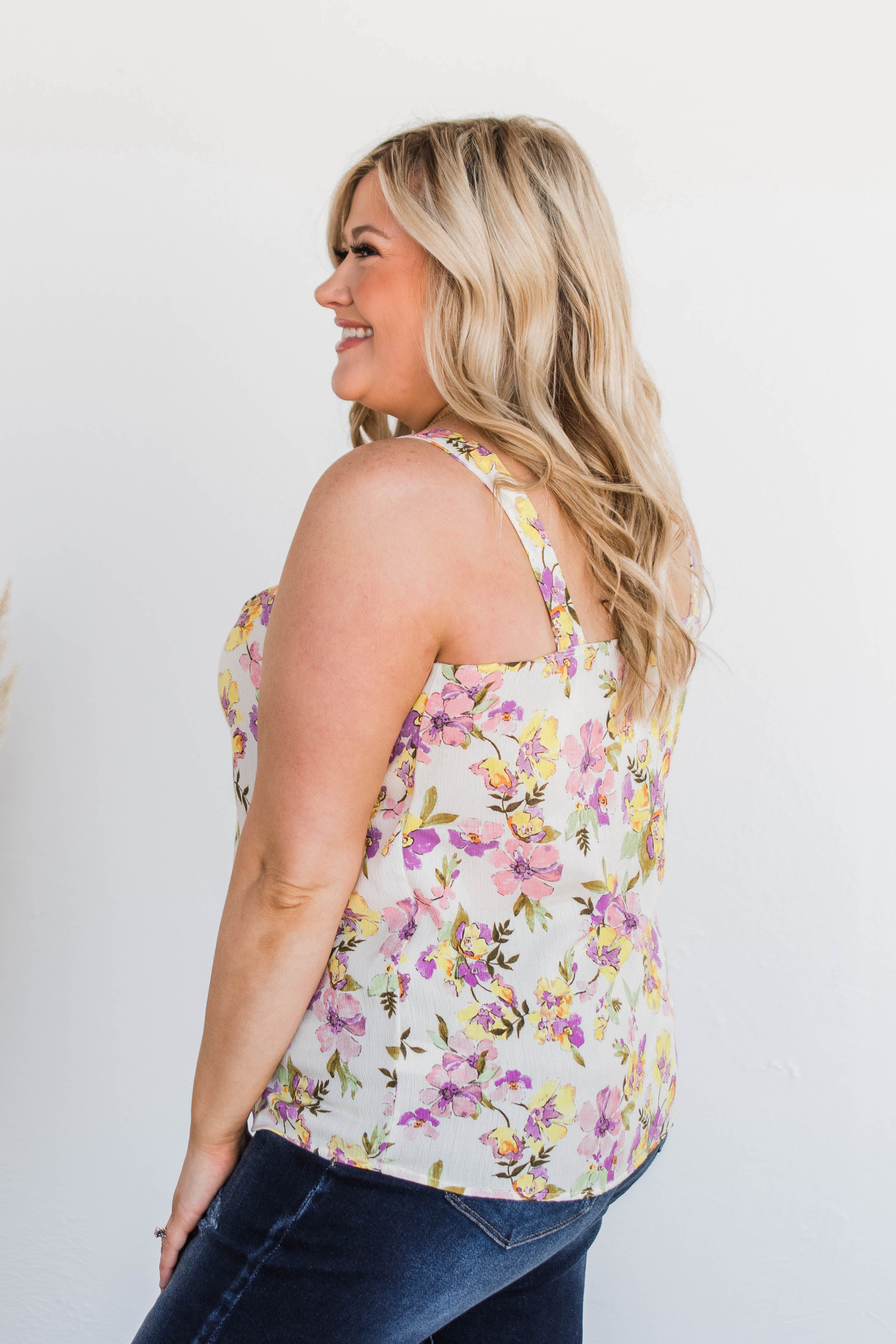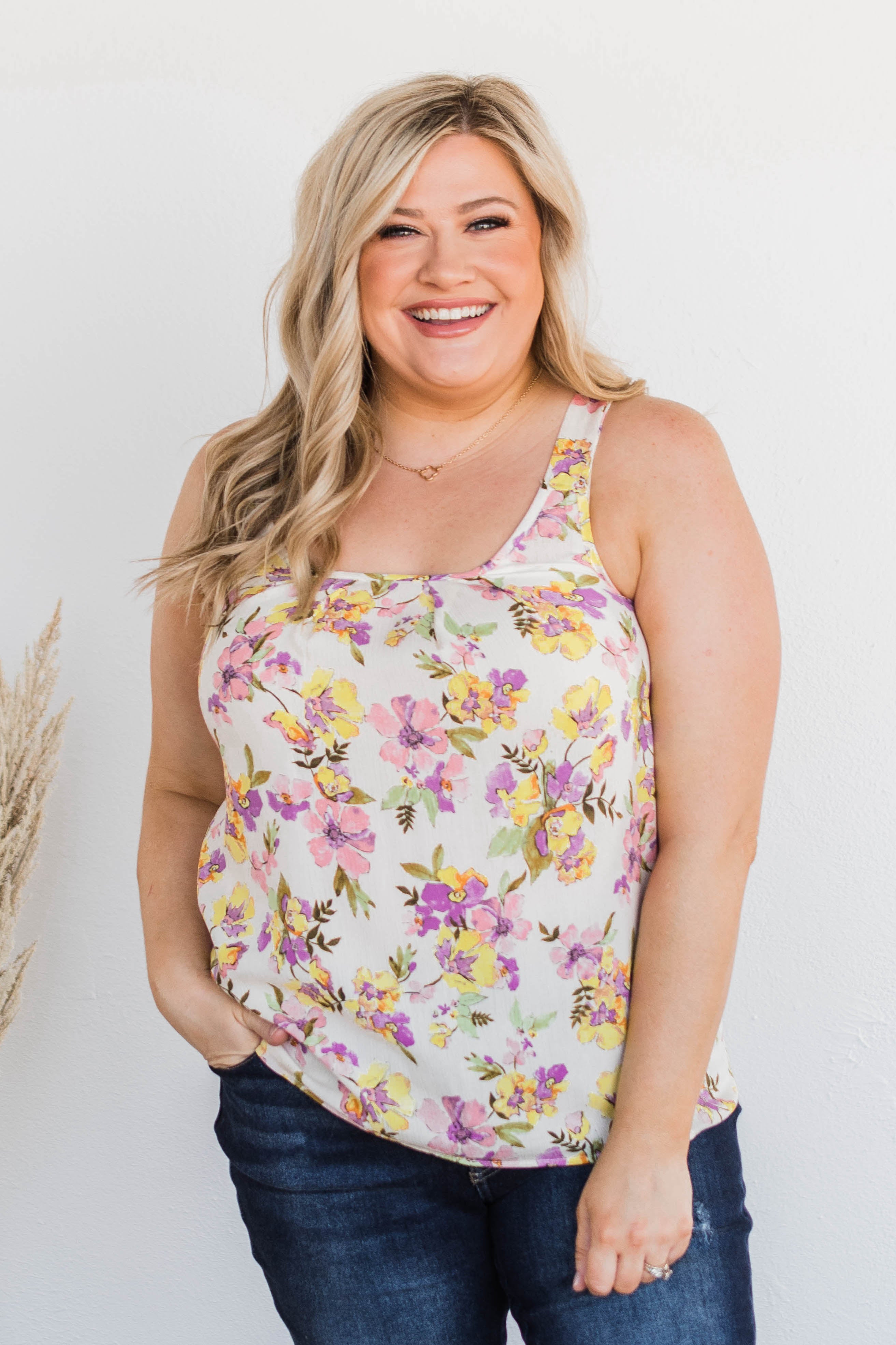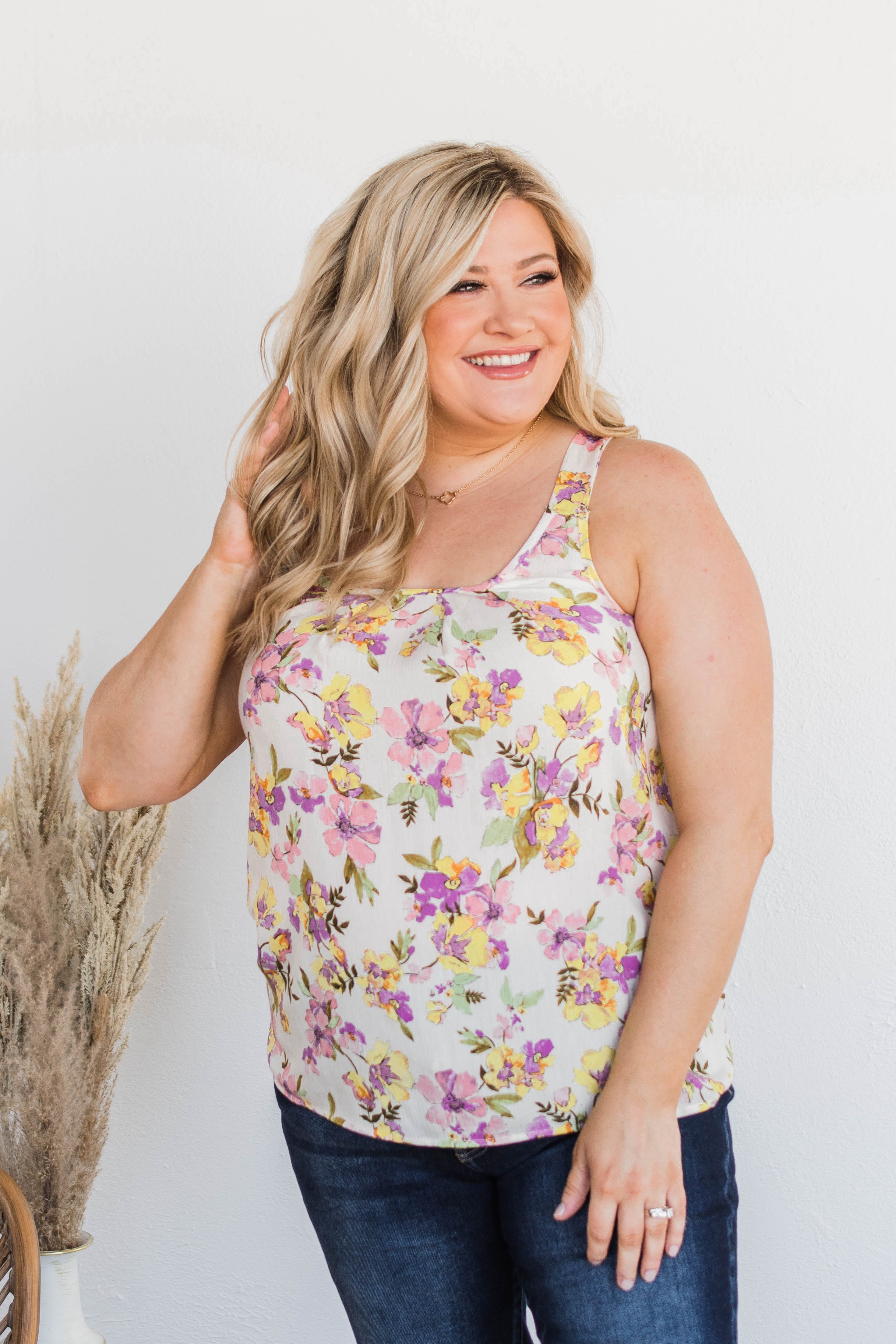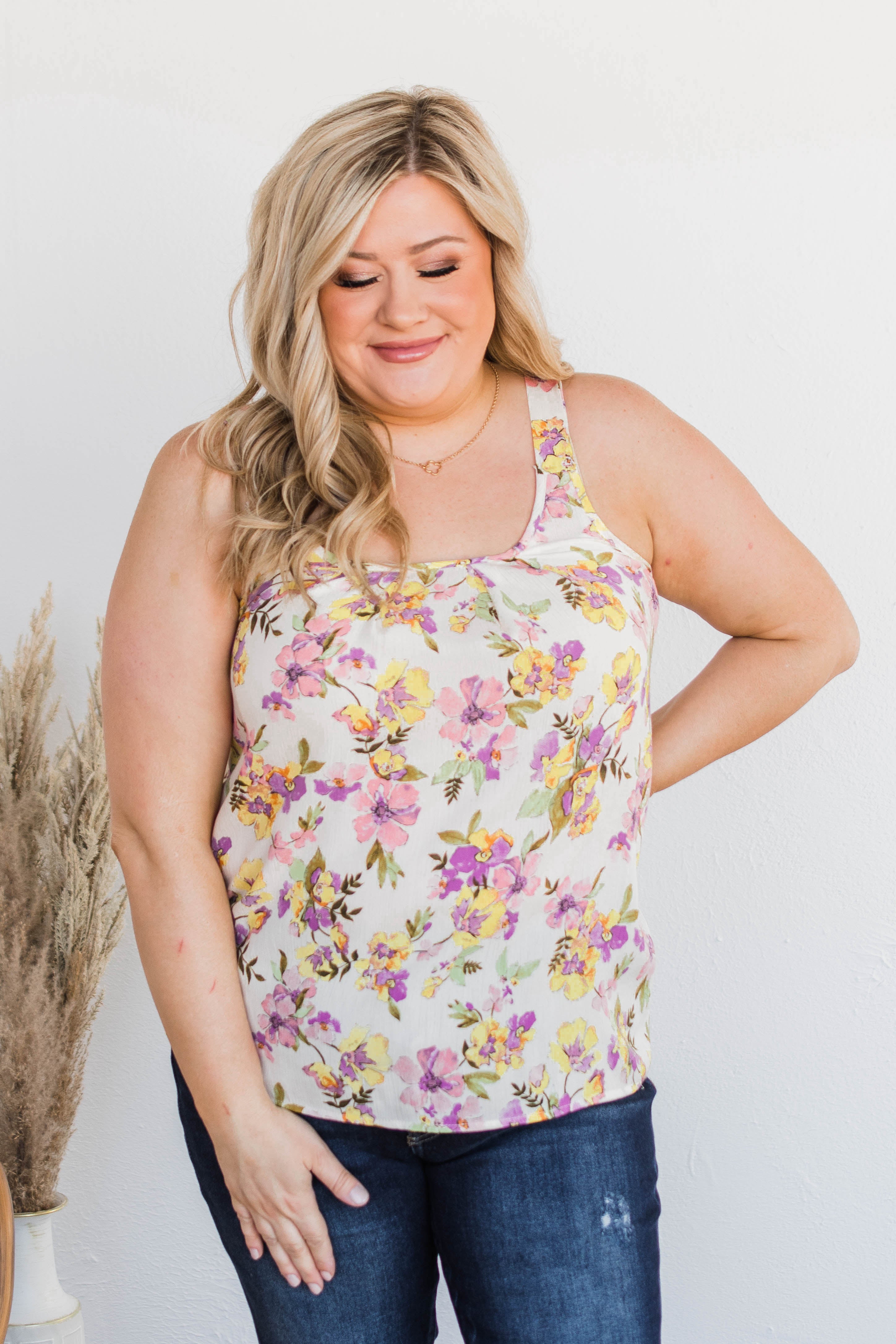 Fill your day with color whenever you’re in this gorgeous tank top! This top has all the details you desire such as the scoop neckline with a pleated design and pretty floral pattern that’s perfect for the upcoming season!