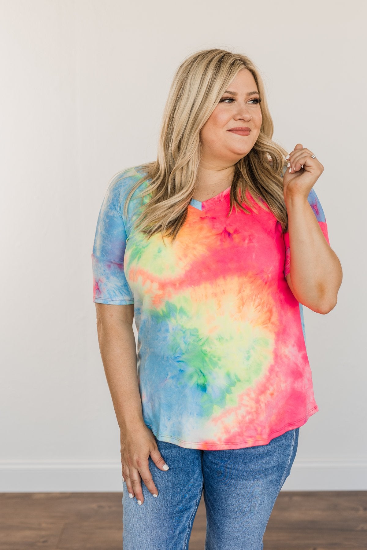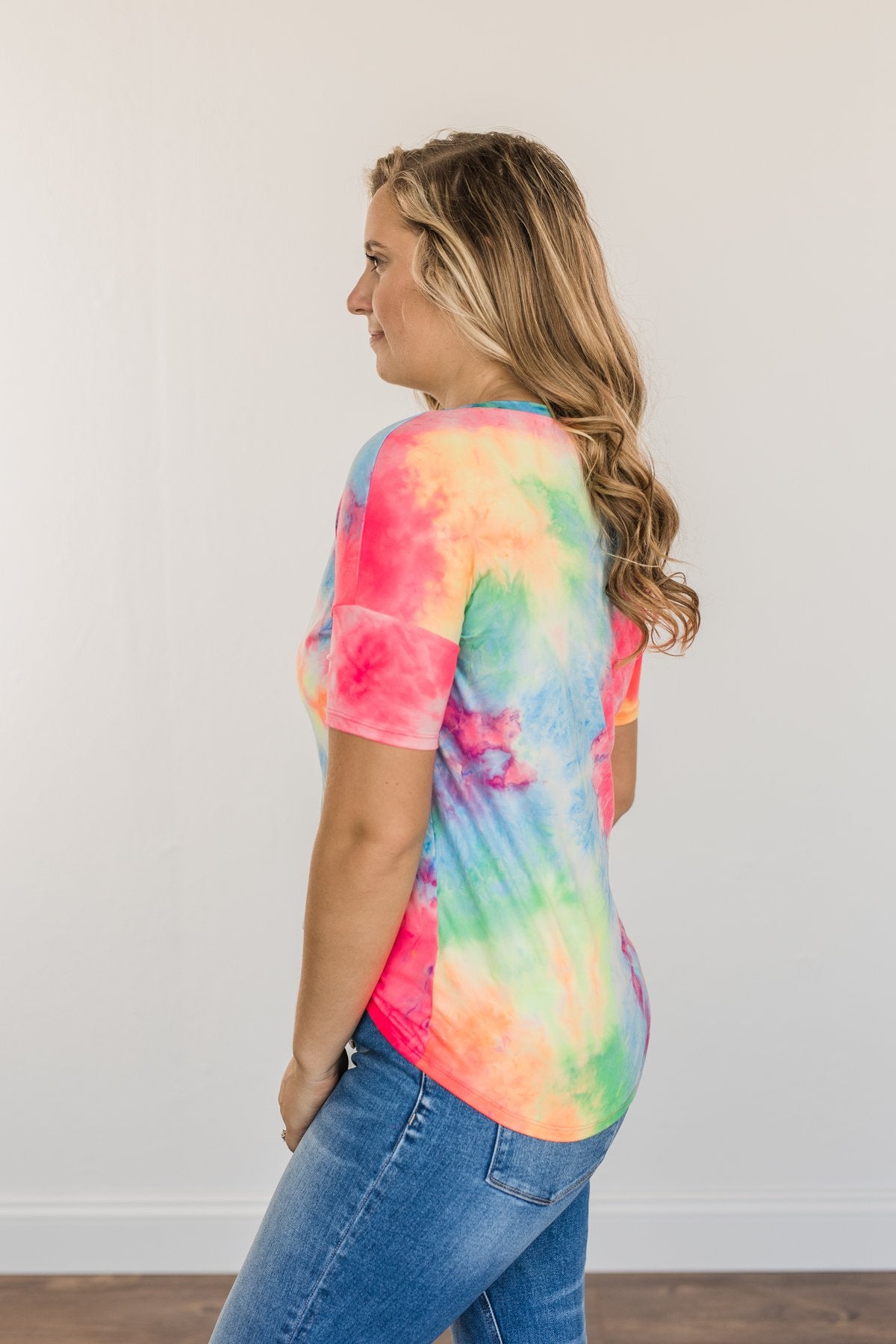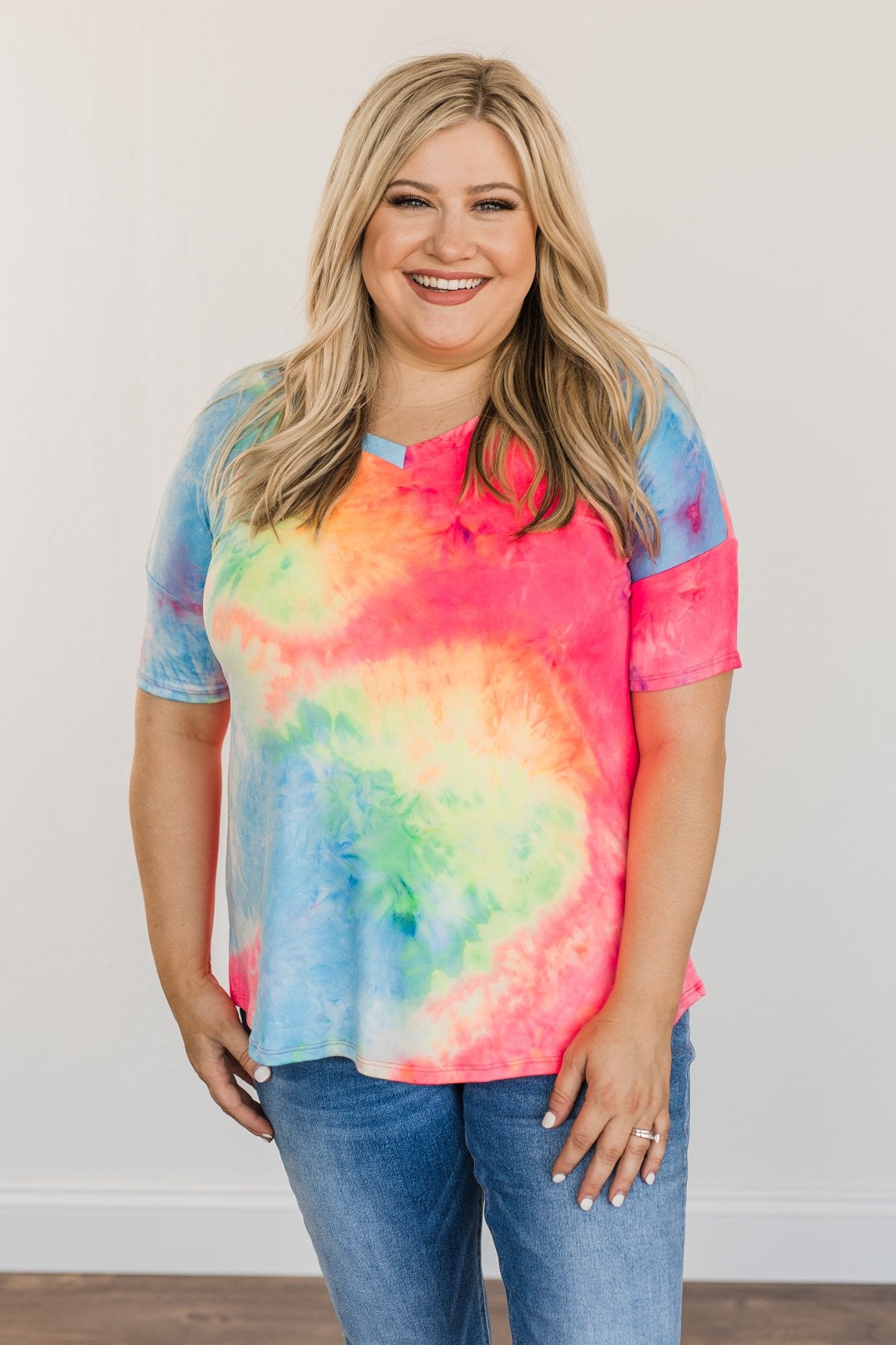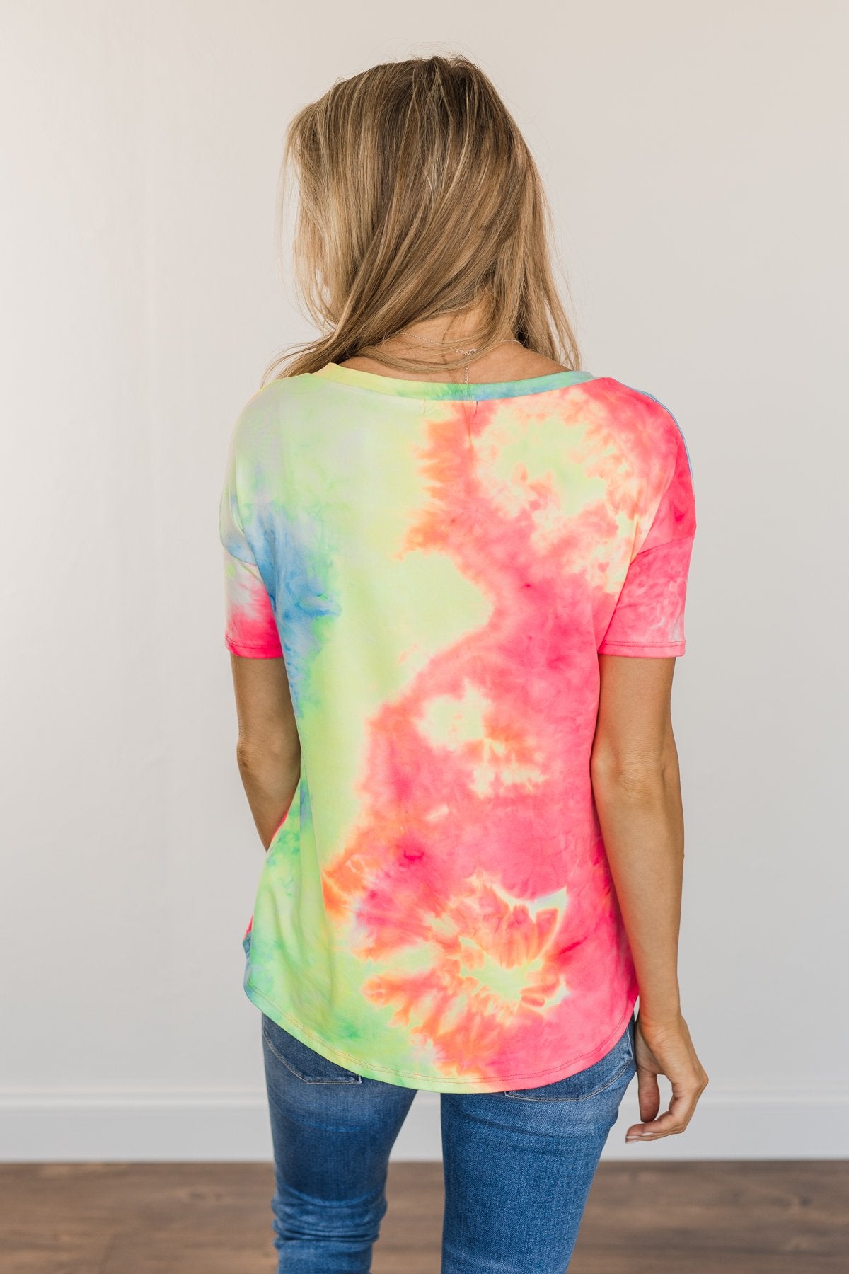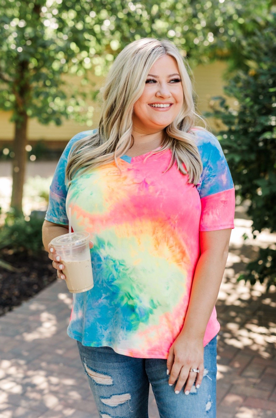 Add a splash of color to your day with this short sleeve, tie dye top! The bright neon tie dye print makes this top an optimal choice for your Summer activities like walks around the beach or boating trips on the lake! Show off your style this Summer by pairing this top with your favorite shorts, sandals, and sunglasses!
