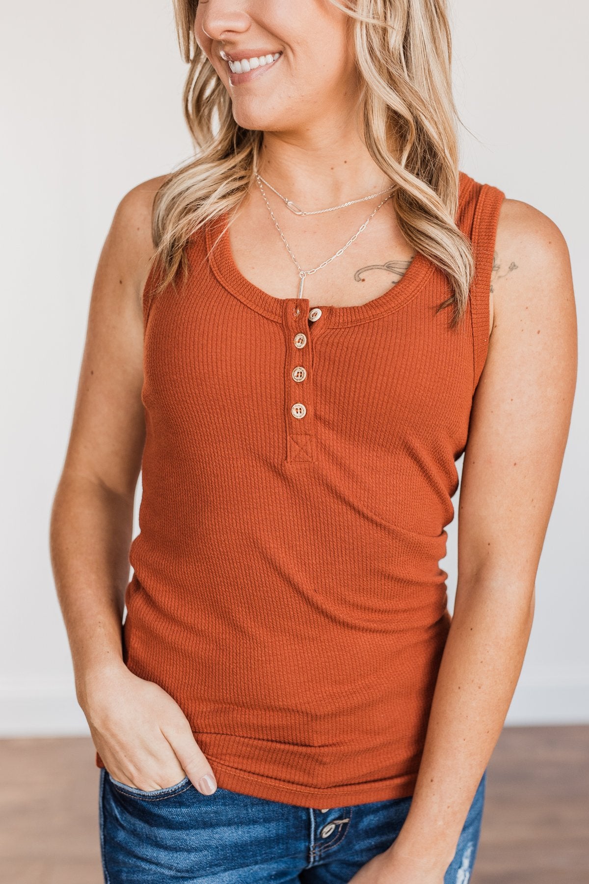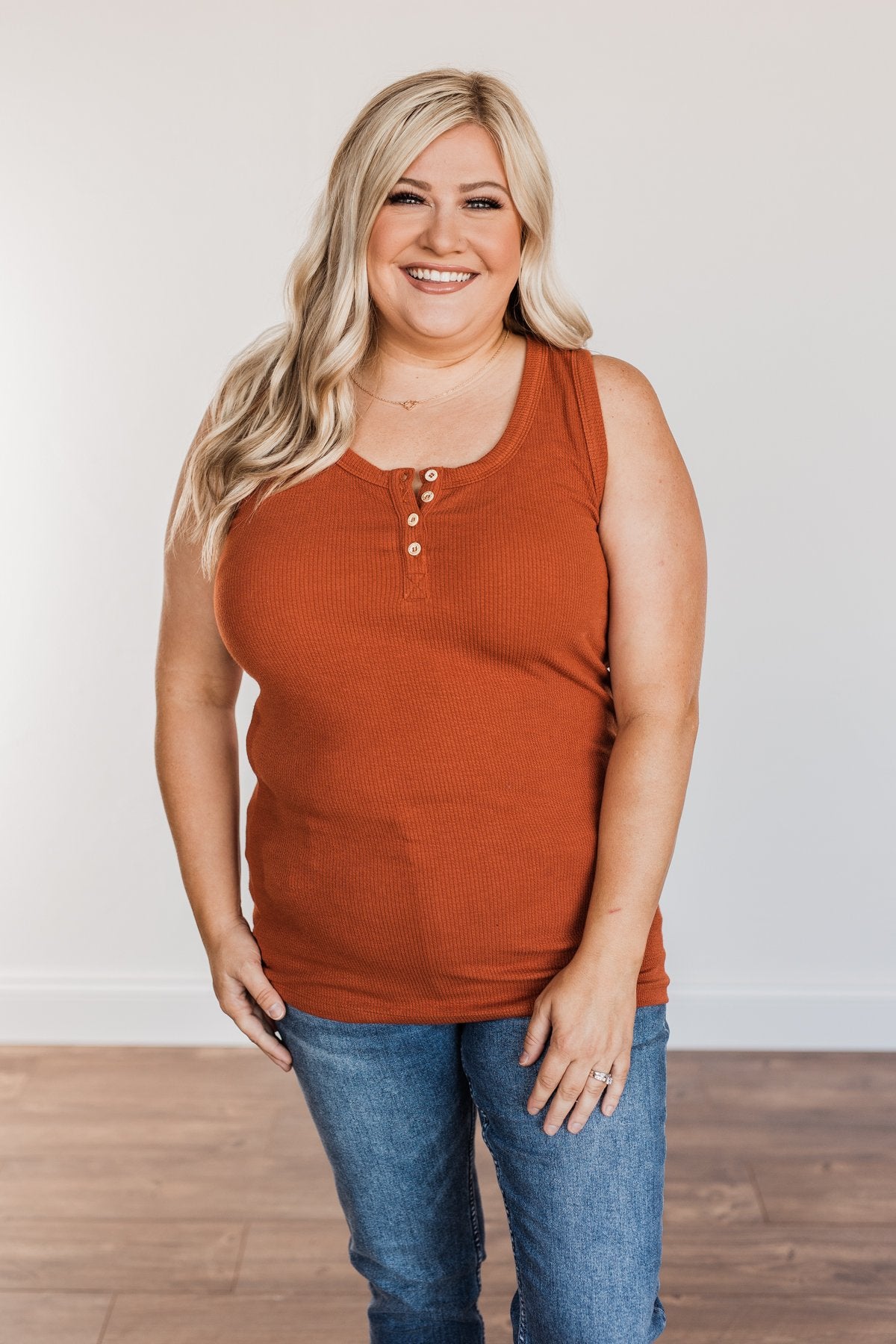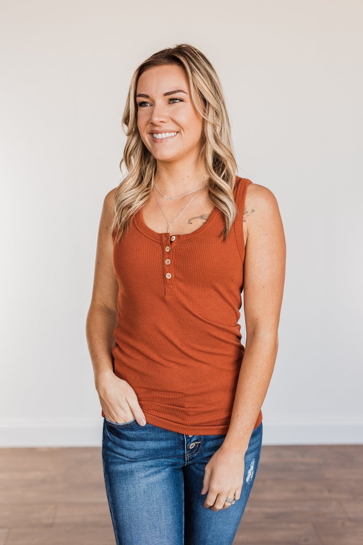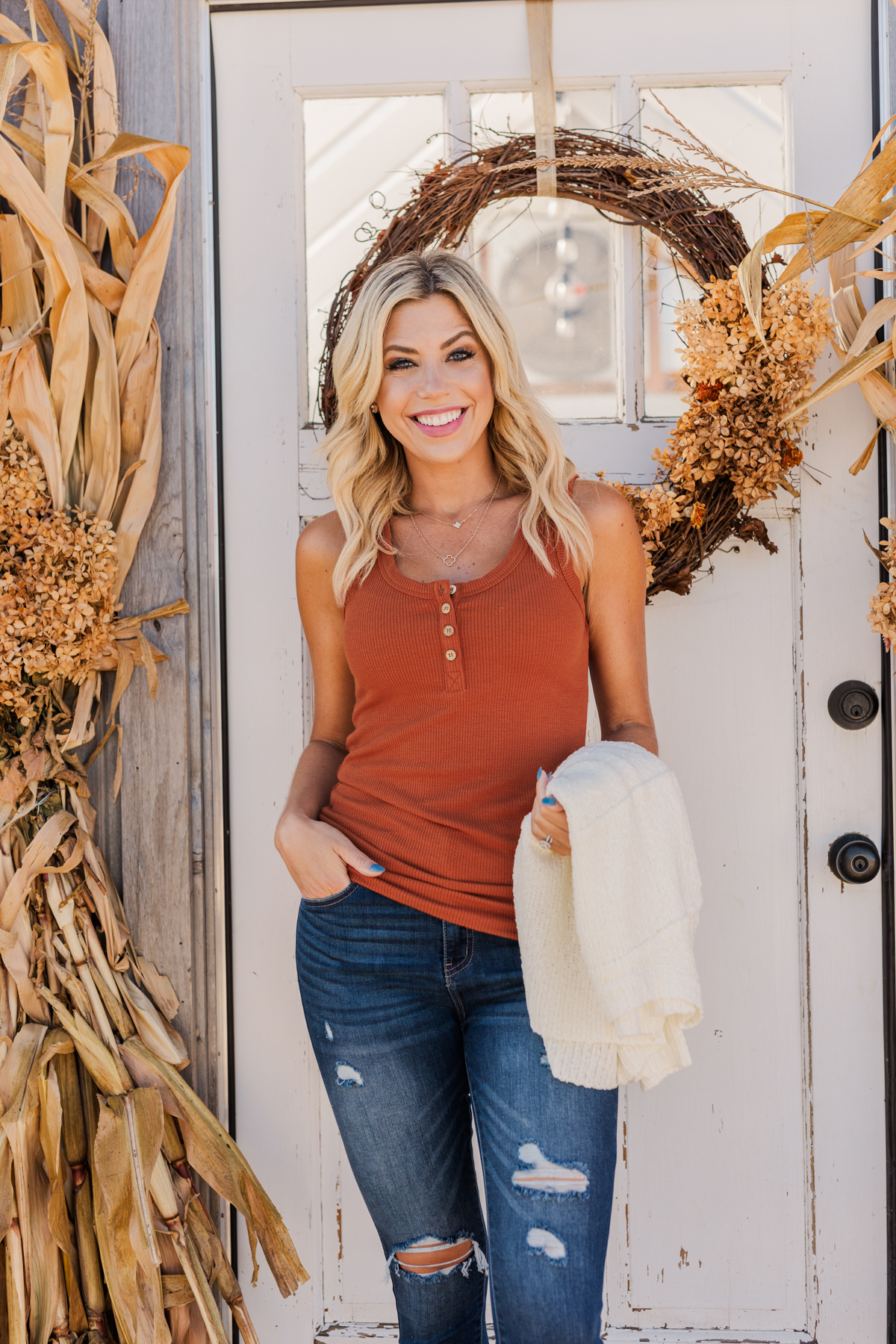 Everyone needs a good tank to wear under all your favorite chilly weather clothes! Wear this underneath your favorite cardigan, button down, or flannel for some fabulous Fall style! With details like thick seams on the shoulders, henley button front and ribbed knit material you'll be reaching for this piece every chance you get!