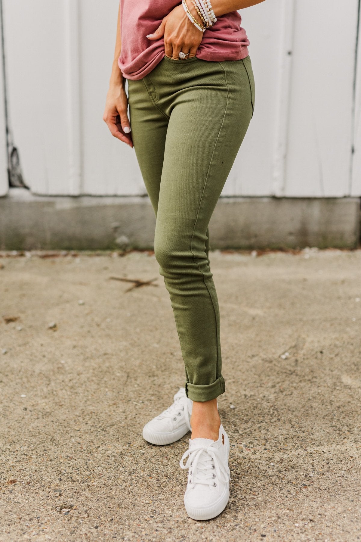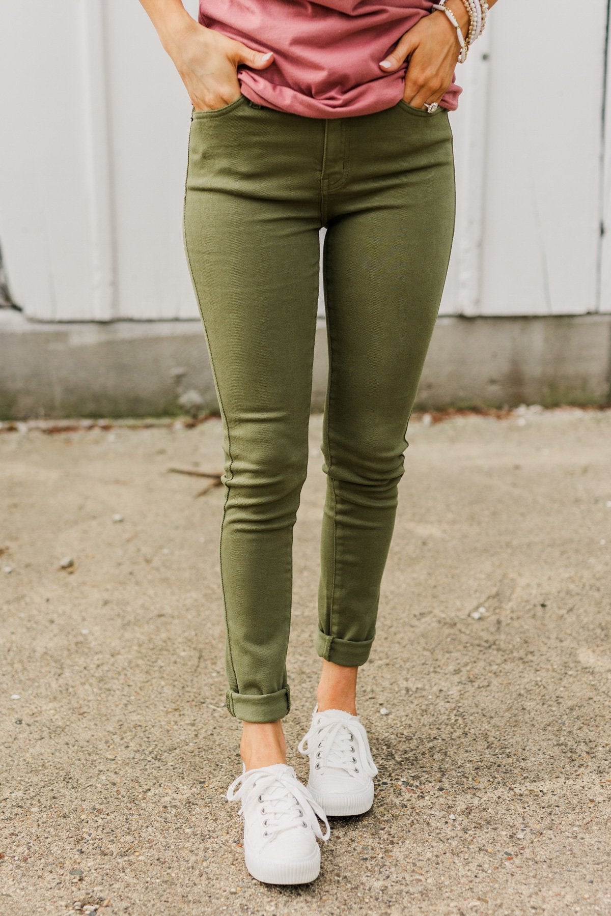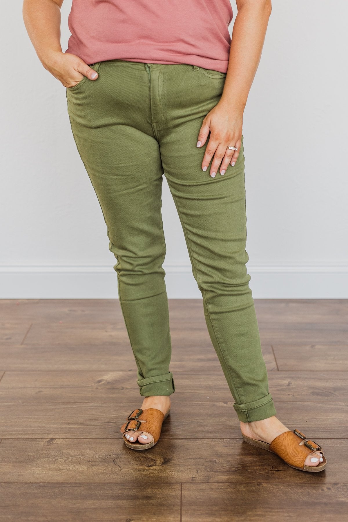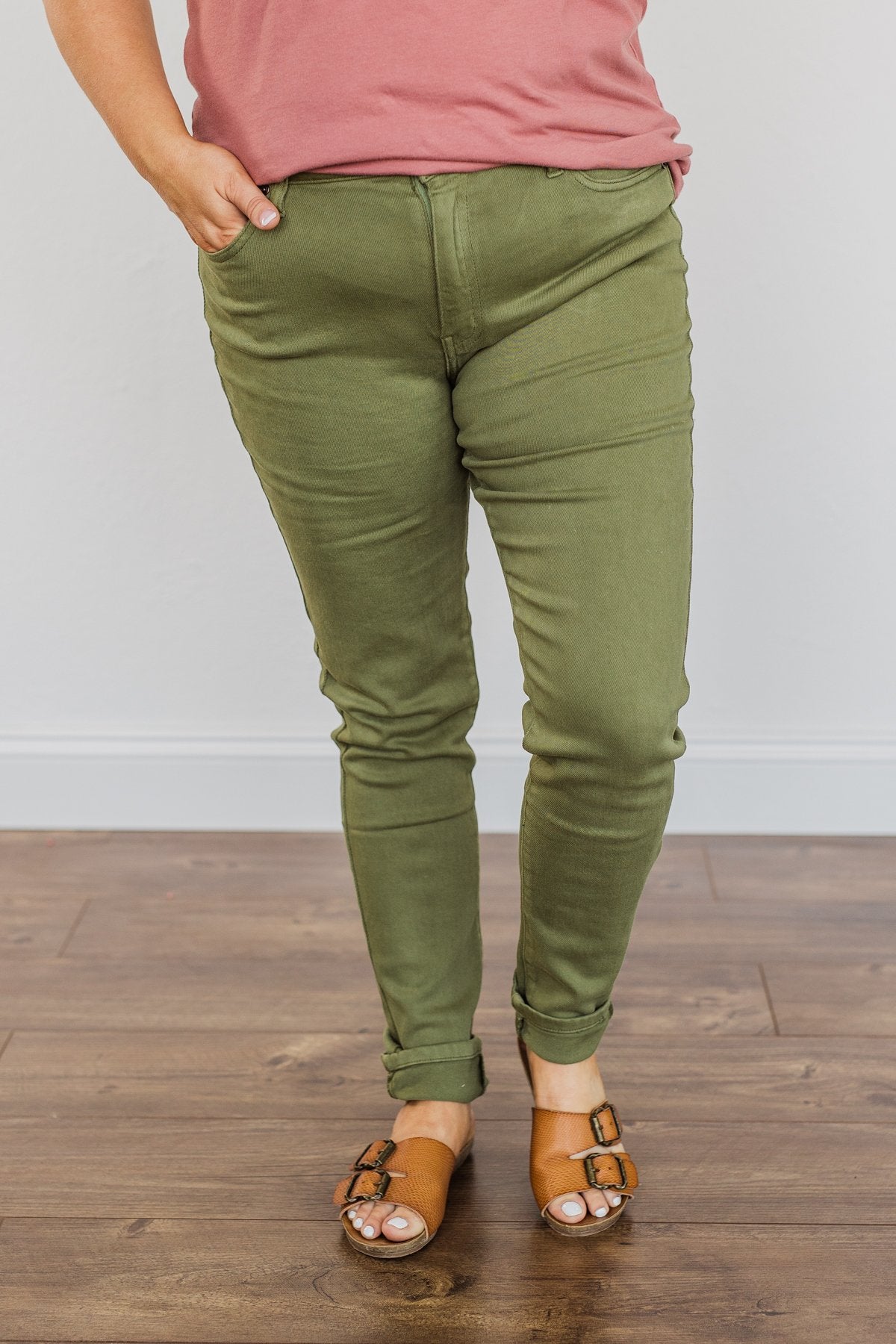 Grab these clean wash, kale green colored pants for a fun addition to your Fall/Winter wardrobe! Wear these with a chunky knit sweater and boots for a cute and cozy look on those chilly days to come!
