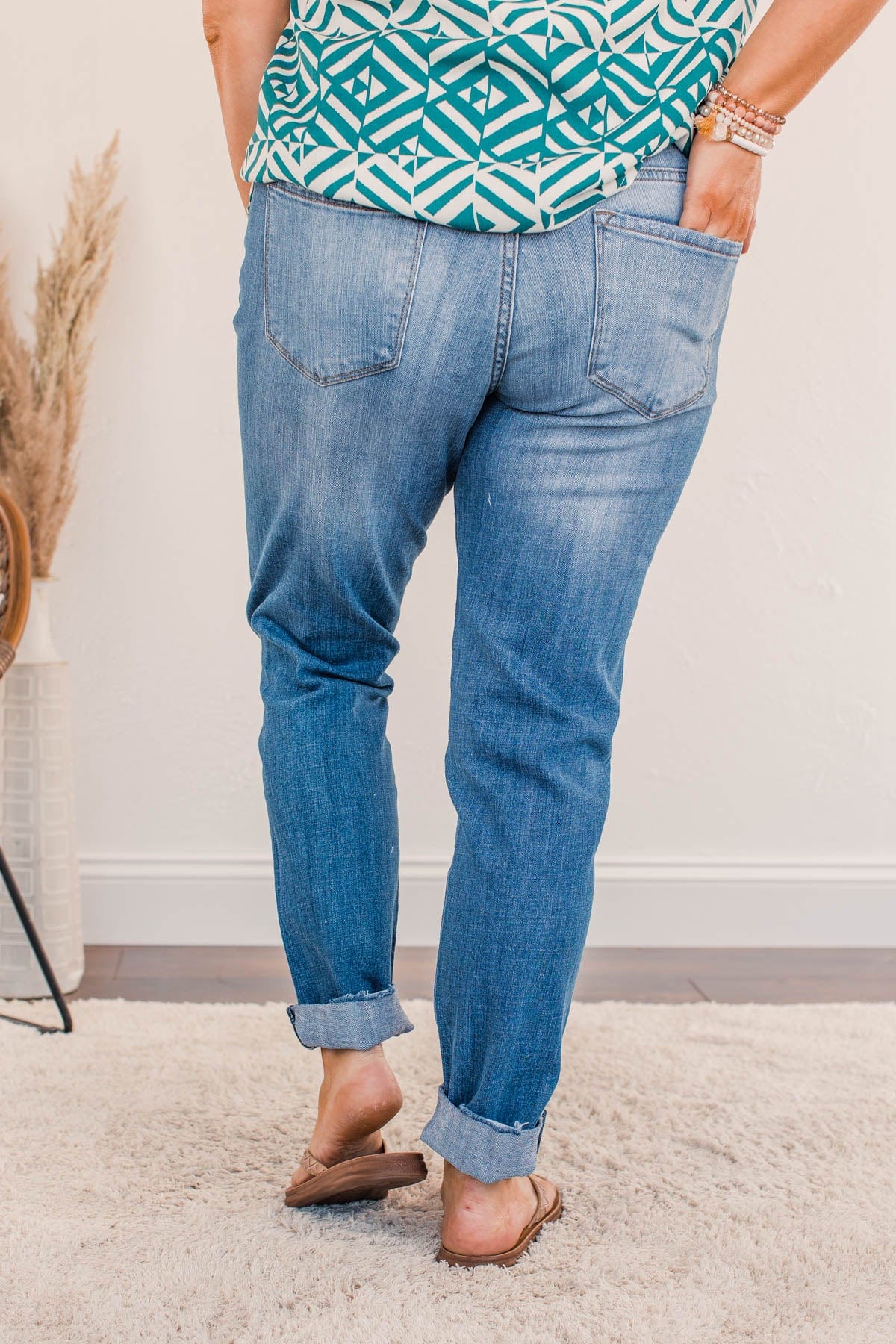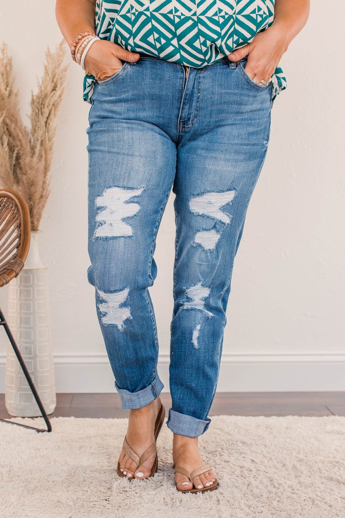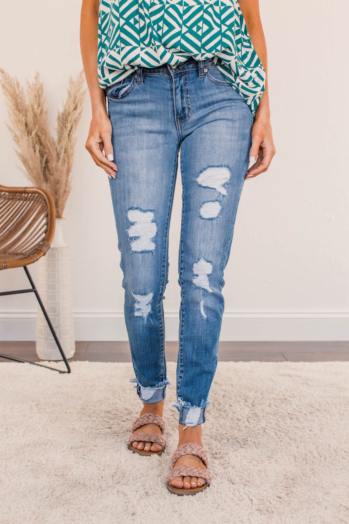 Start your day off right with these adorable super skinny jeans! We're especially loving how the distressing along the thighs features a fill yarn to keep you nice and cozy on those breezy Spring days!