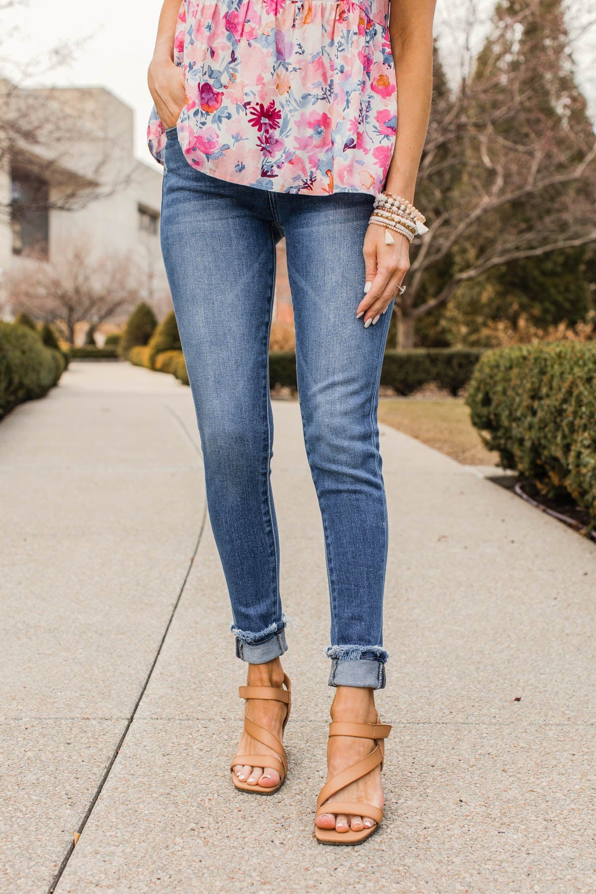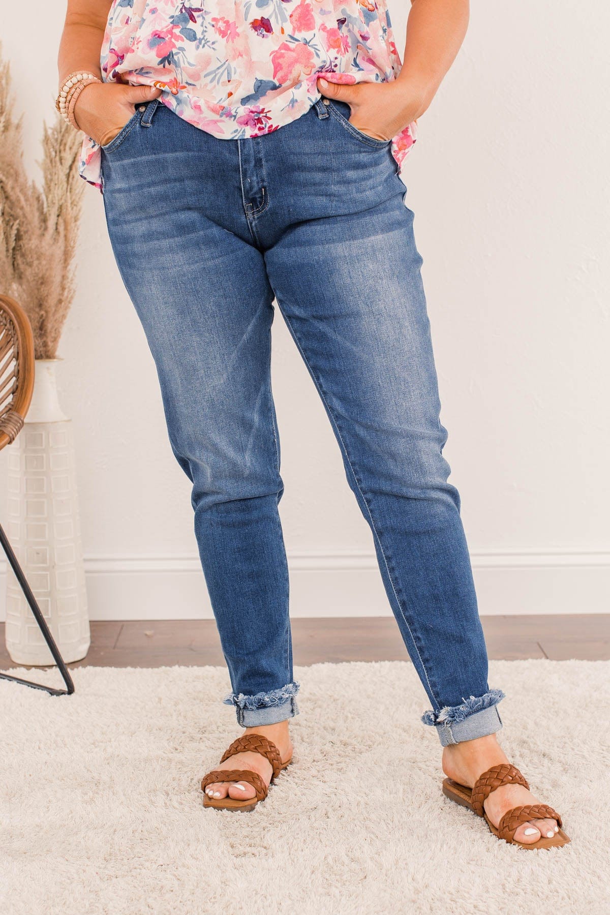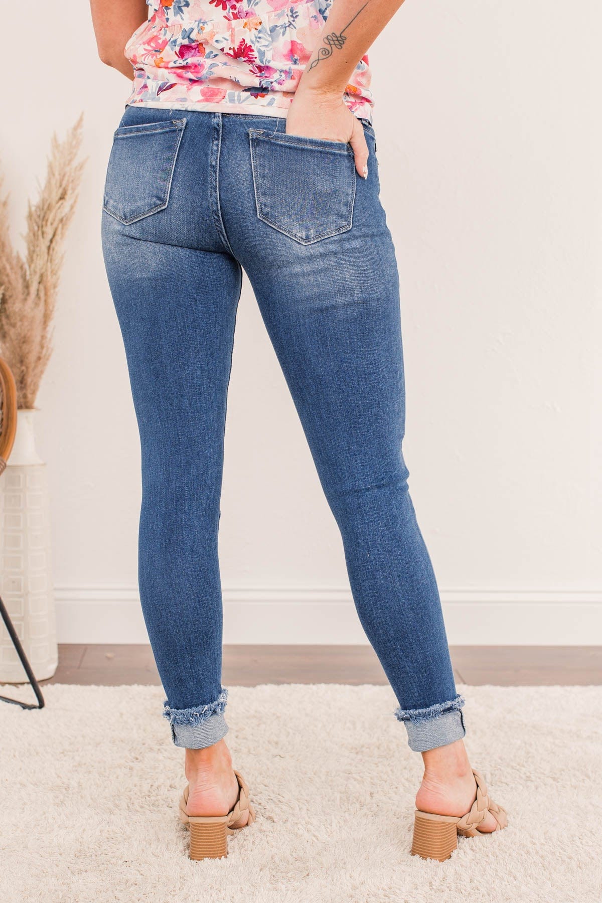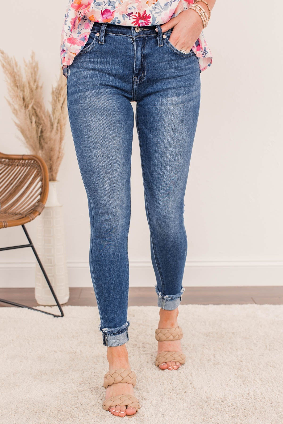Build up your denim staples with these medium wash skinny jeans that feature very slight distressing on the pockets and raw hems! These cute and clean wash jeans will never let you down!
