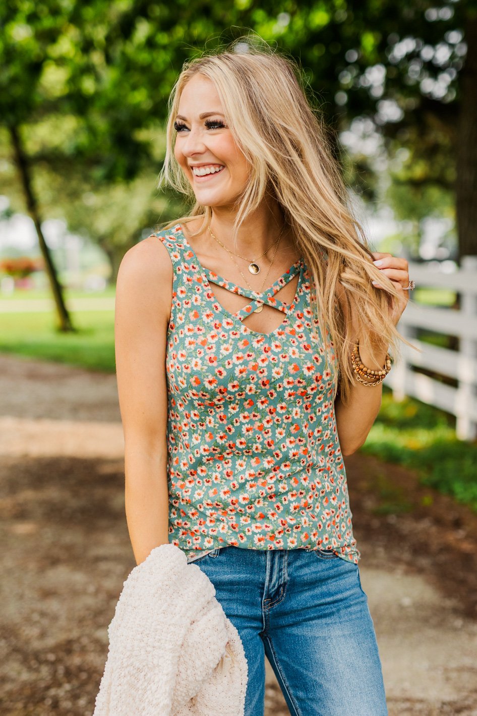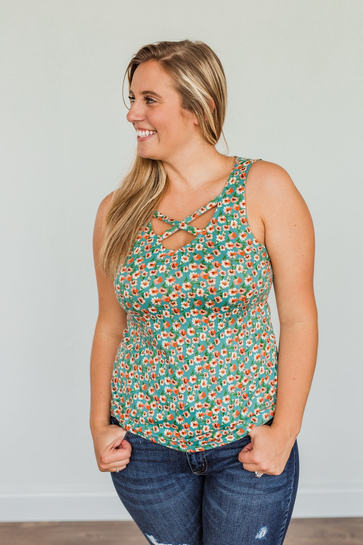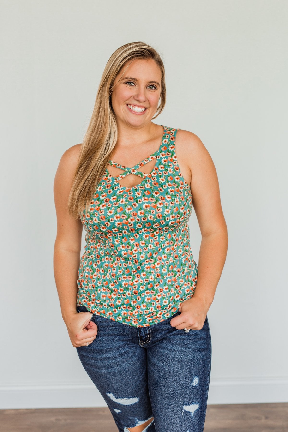 Like A Summer Breeze Floral Criss-Cross Tank- Dusty Teal