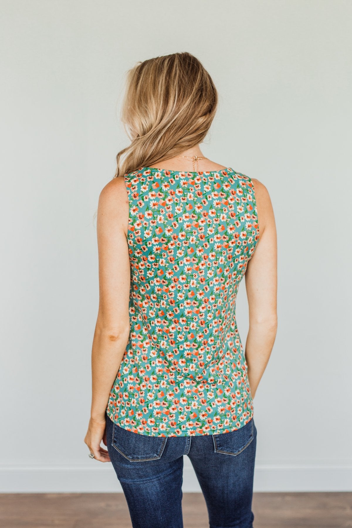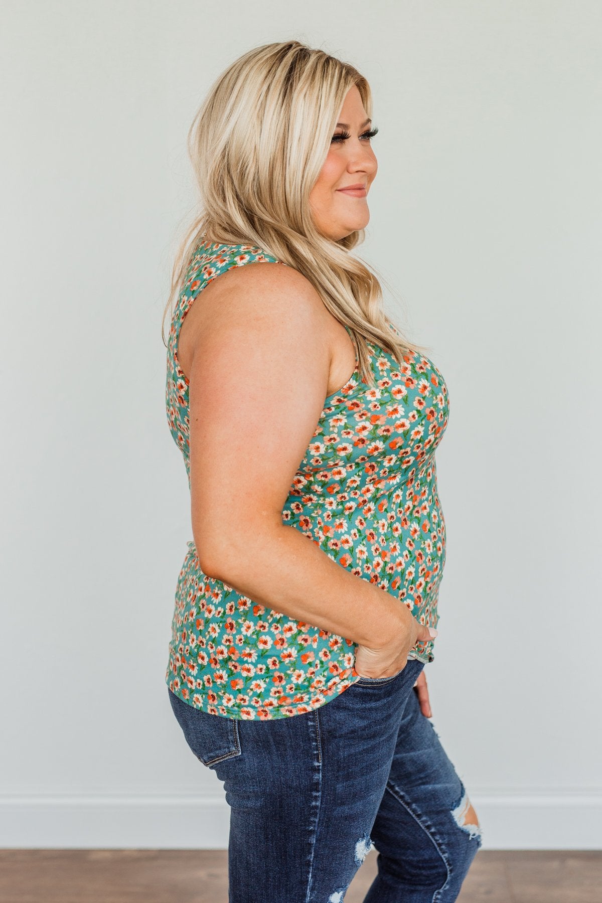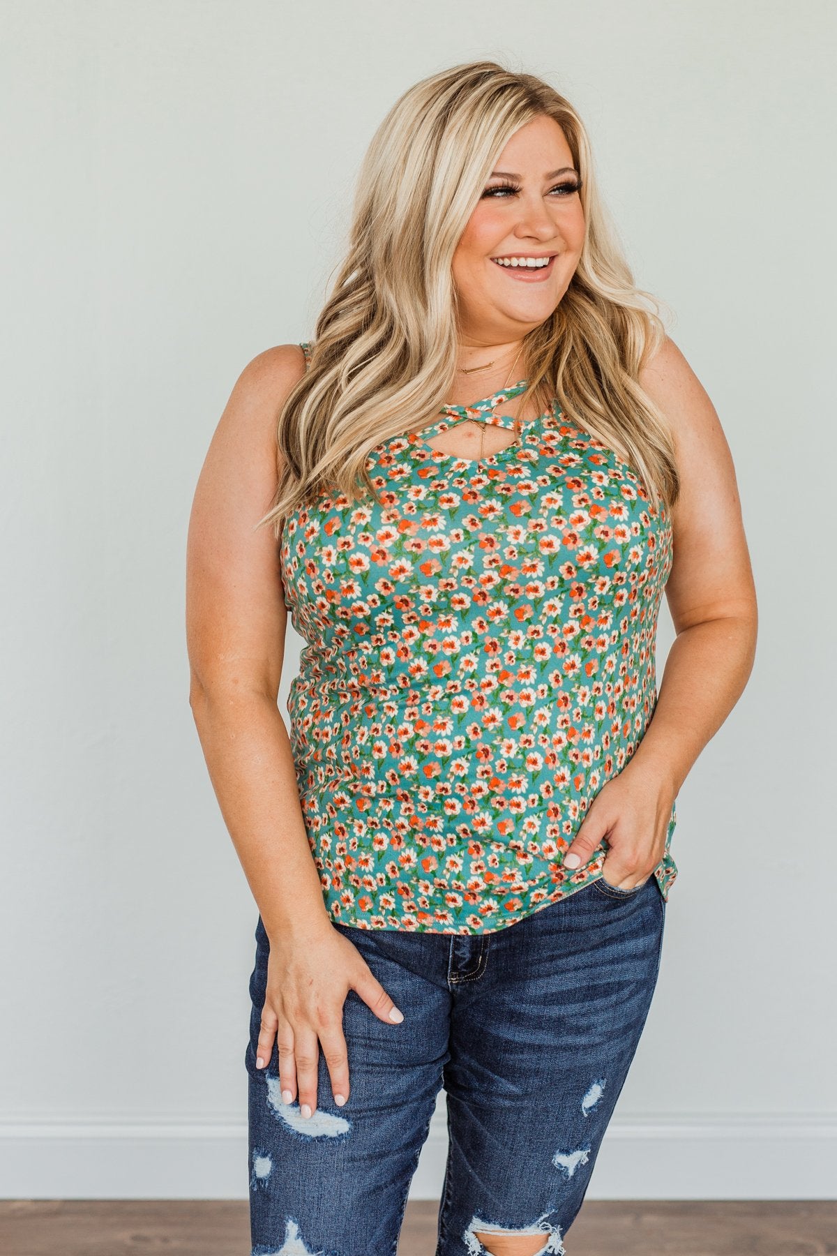 Like A Summer Breeze Floral Criss-Cross Tank- Dusty Teal