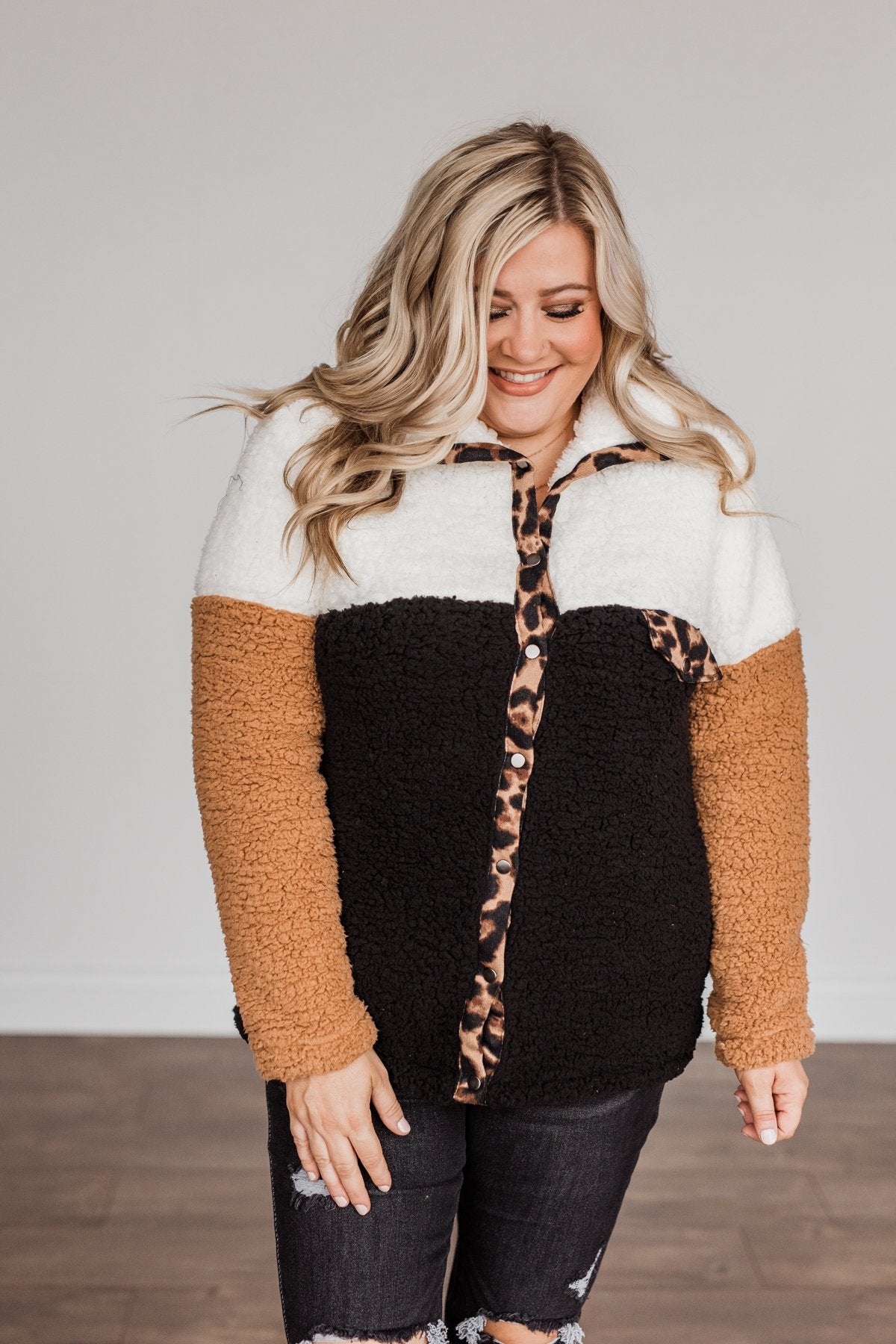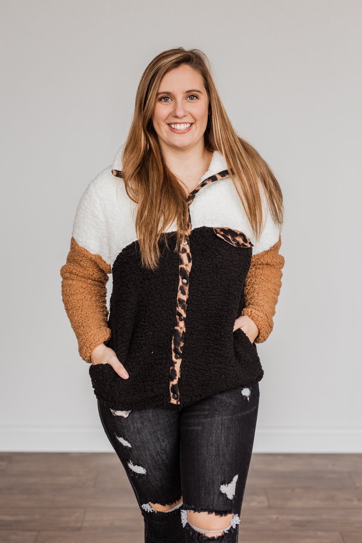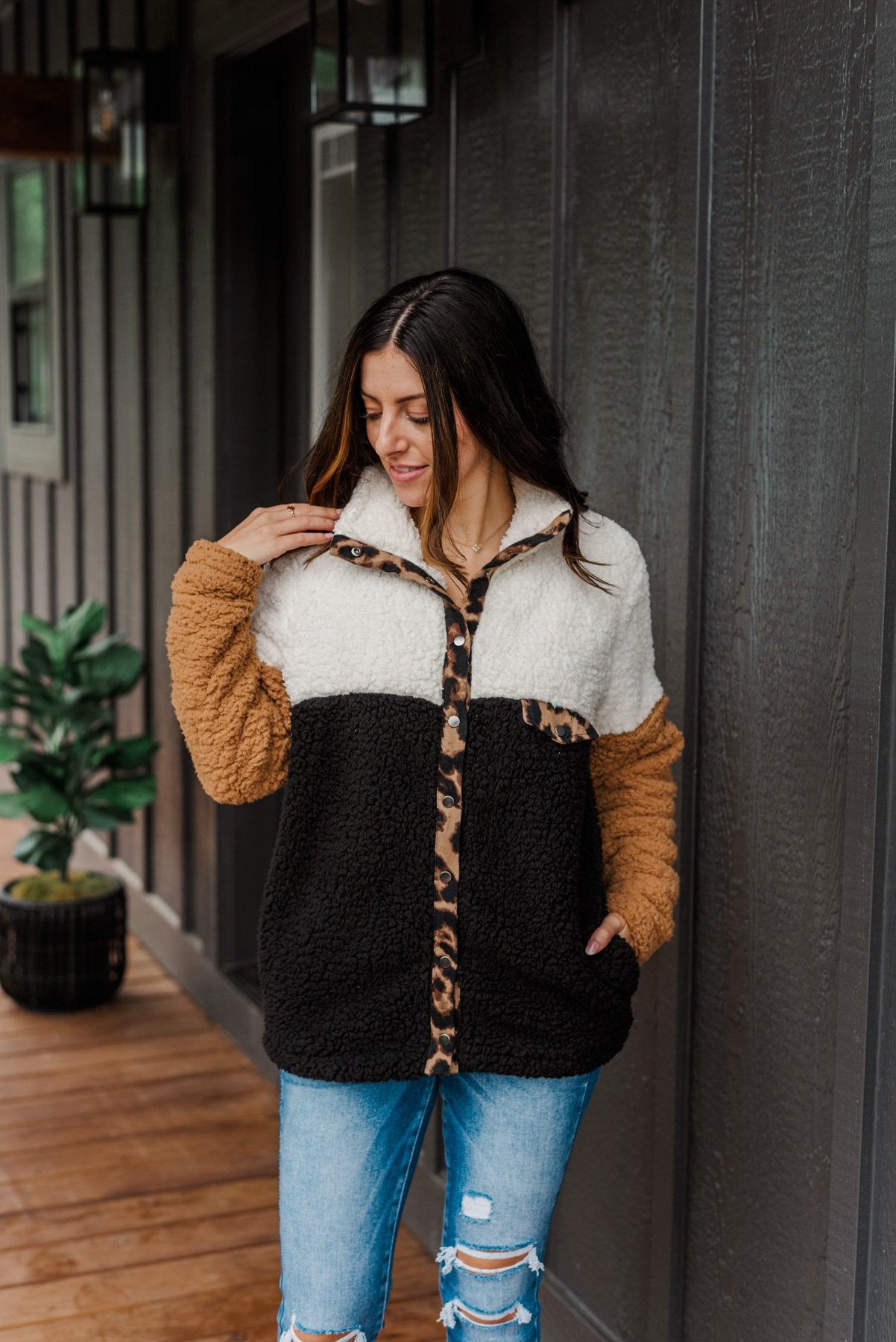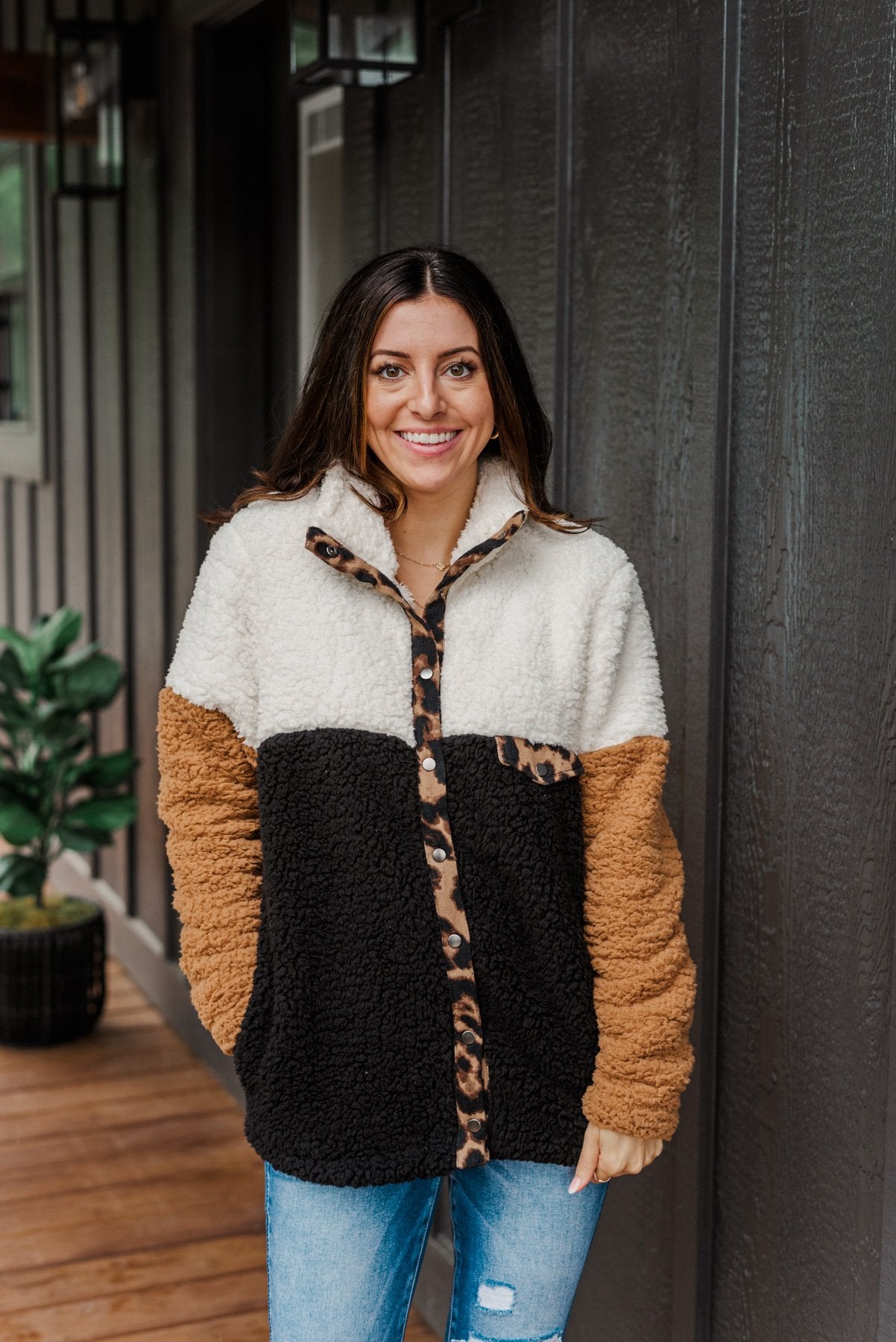 Winter is on it’s way so it’s time to stock up on seasonal pieces like this lovely sherpa! You’ll beat any breeze with features like the chest pocket, the color block pattern with leopard print accents, and the incredibly plush sherpa material that feels like your favorite blanket!