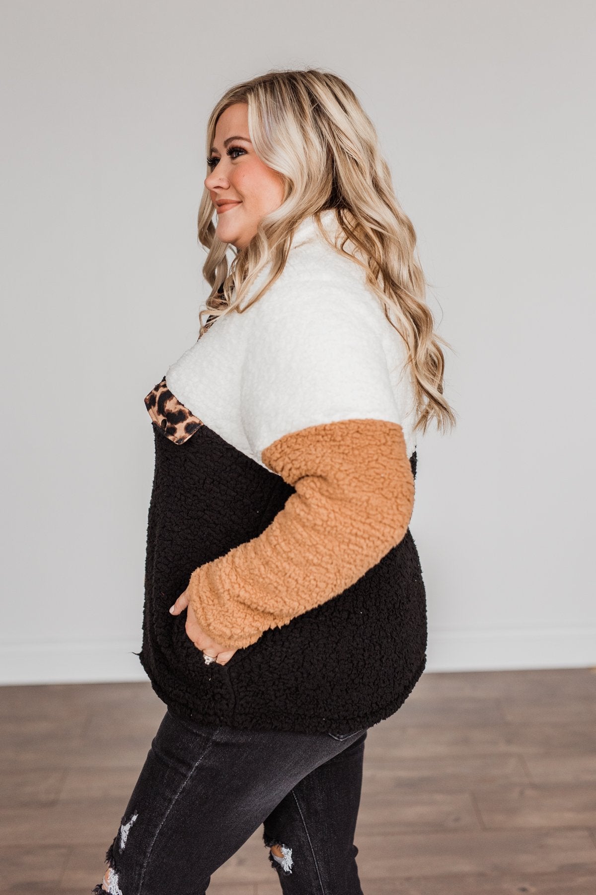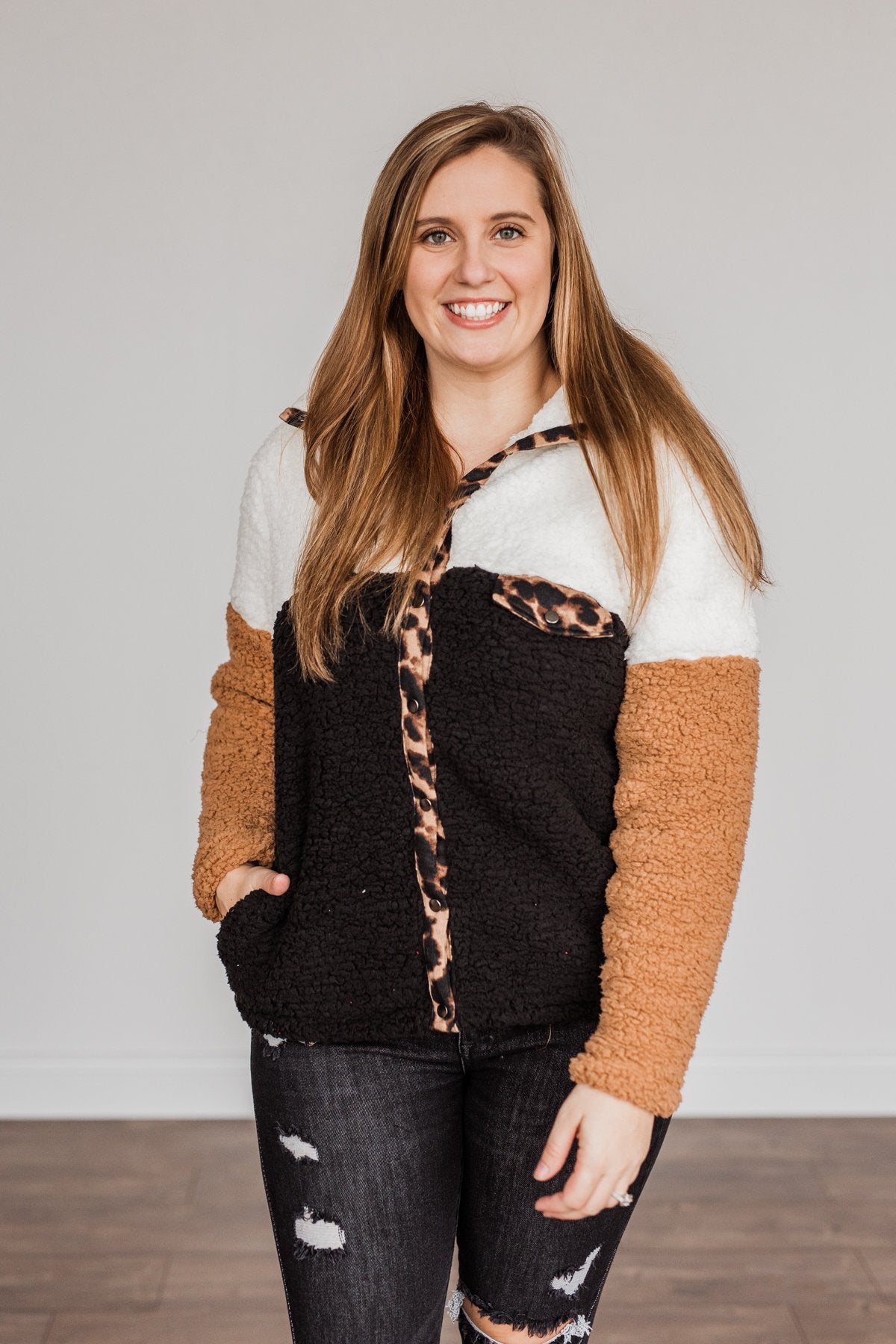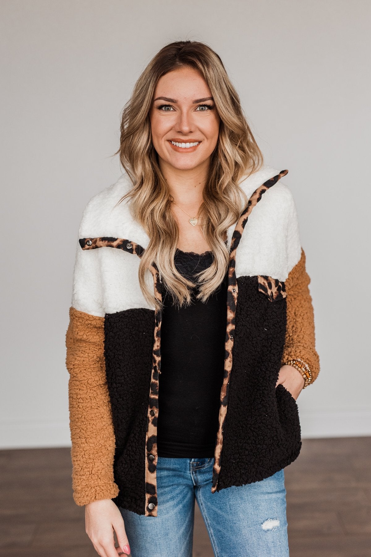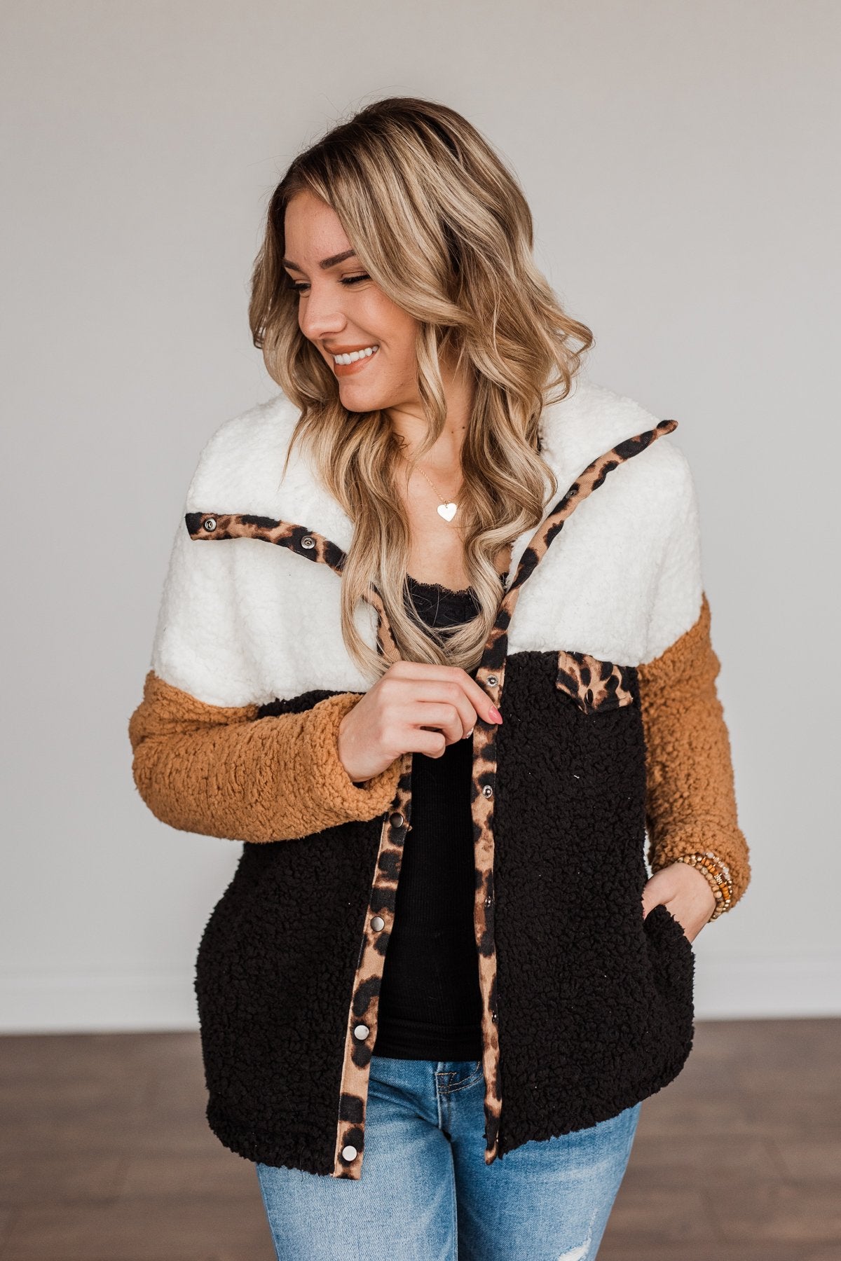 Winter is on it’s way so it’s time to stock up on seasonal pieces like this lovely sherpa! You’ll beat any breeze with features like the chest pocket, the color block pattern with leopard print accents, and the incredibly plush sherpa material that feels like your favorite blanket!