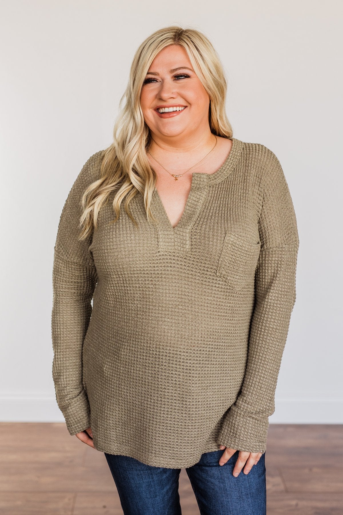 You will love this new addition to your closet! This top features a cozy waffle knit material, a front chest pocket, and a v-neckline to keep you looking and feeling great! Dress it down with leggings and sneakers or dress it up with jeans and booties - this top is made for all occasions!