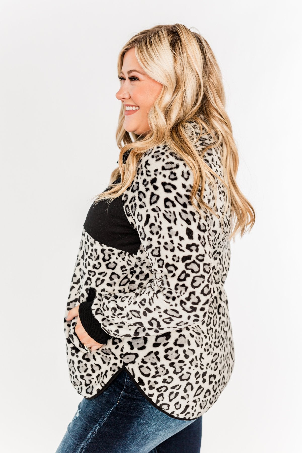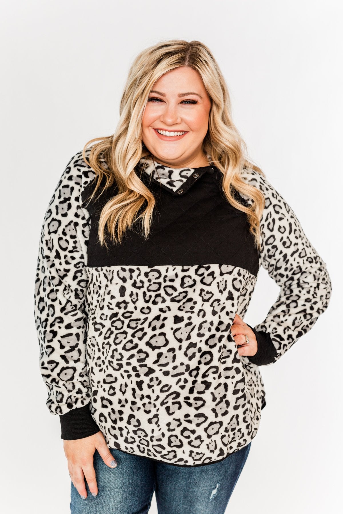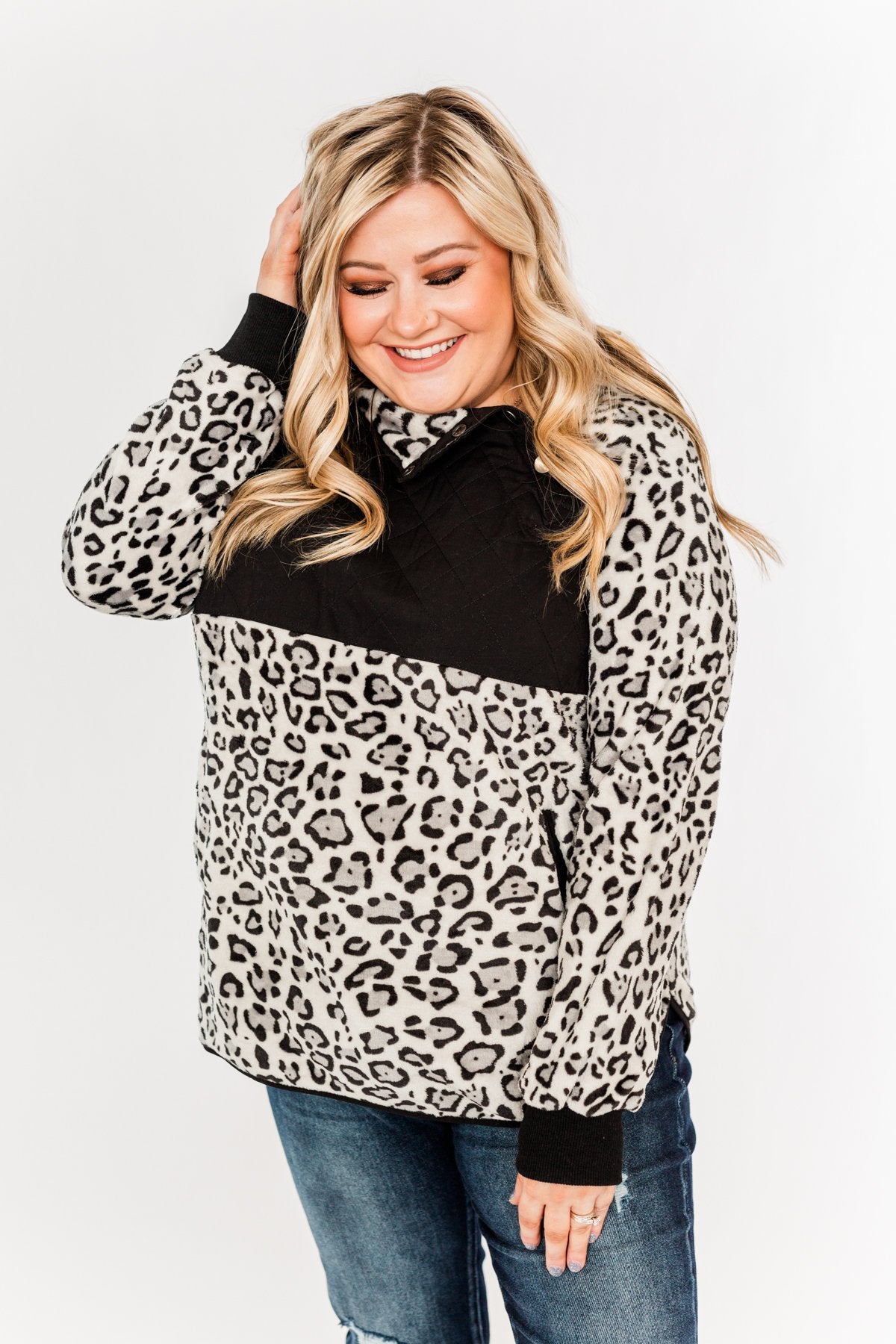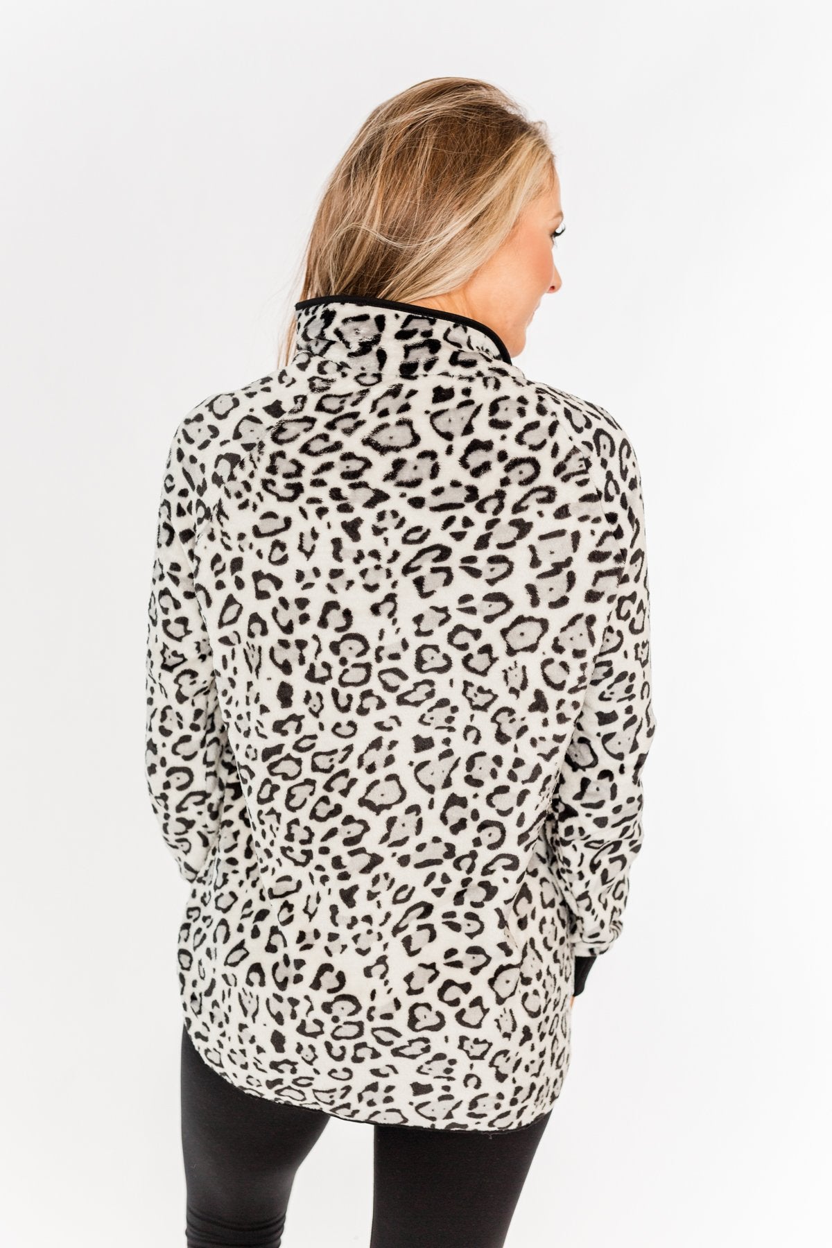 Someday Soon Quarter Button Leopard Sherpa- Grey & Black