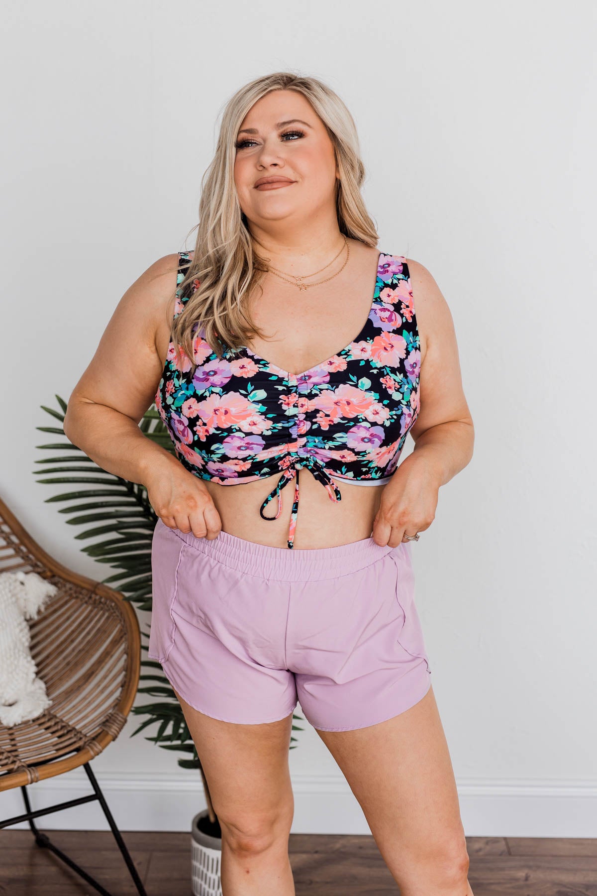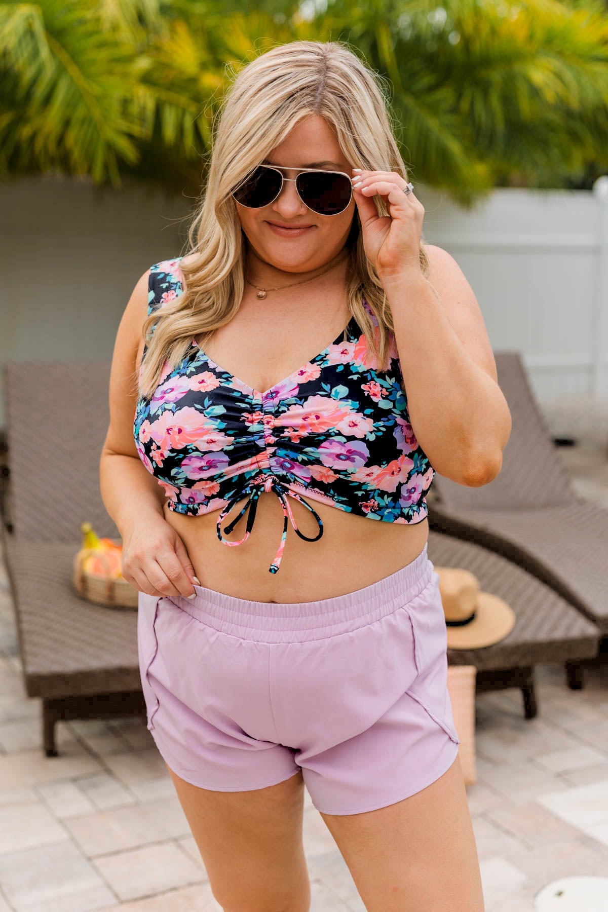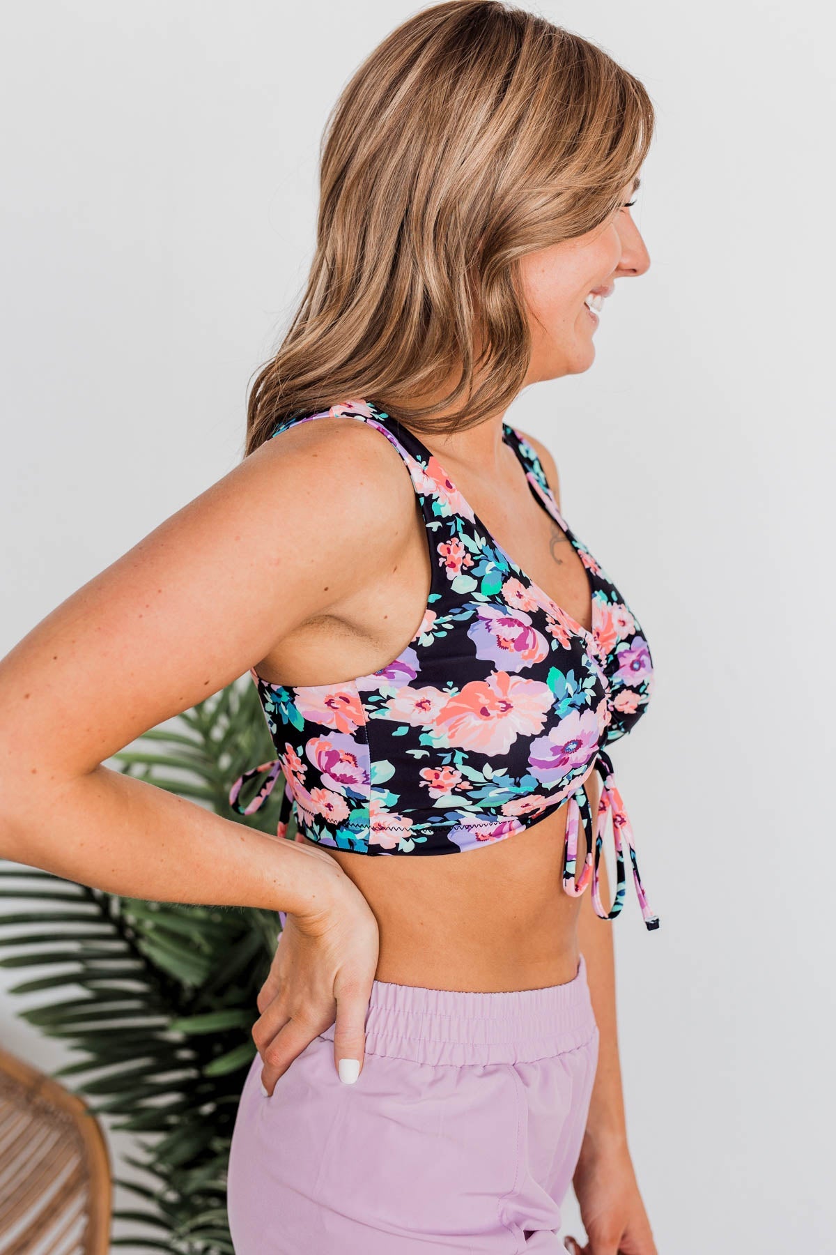 Surfing Through Life Cinched Swim Top- Black, Peach, & Purple