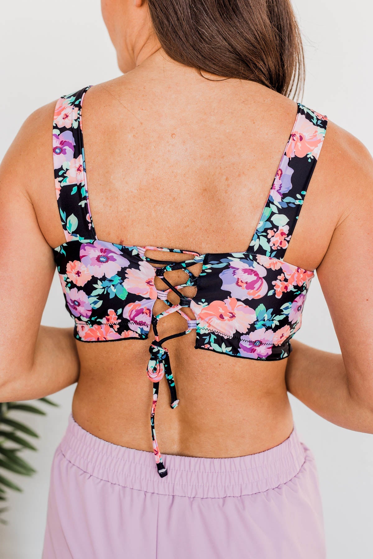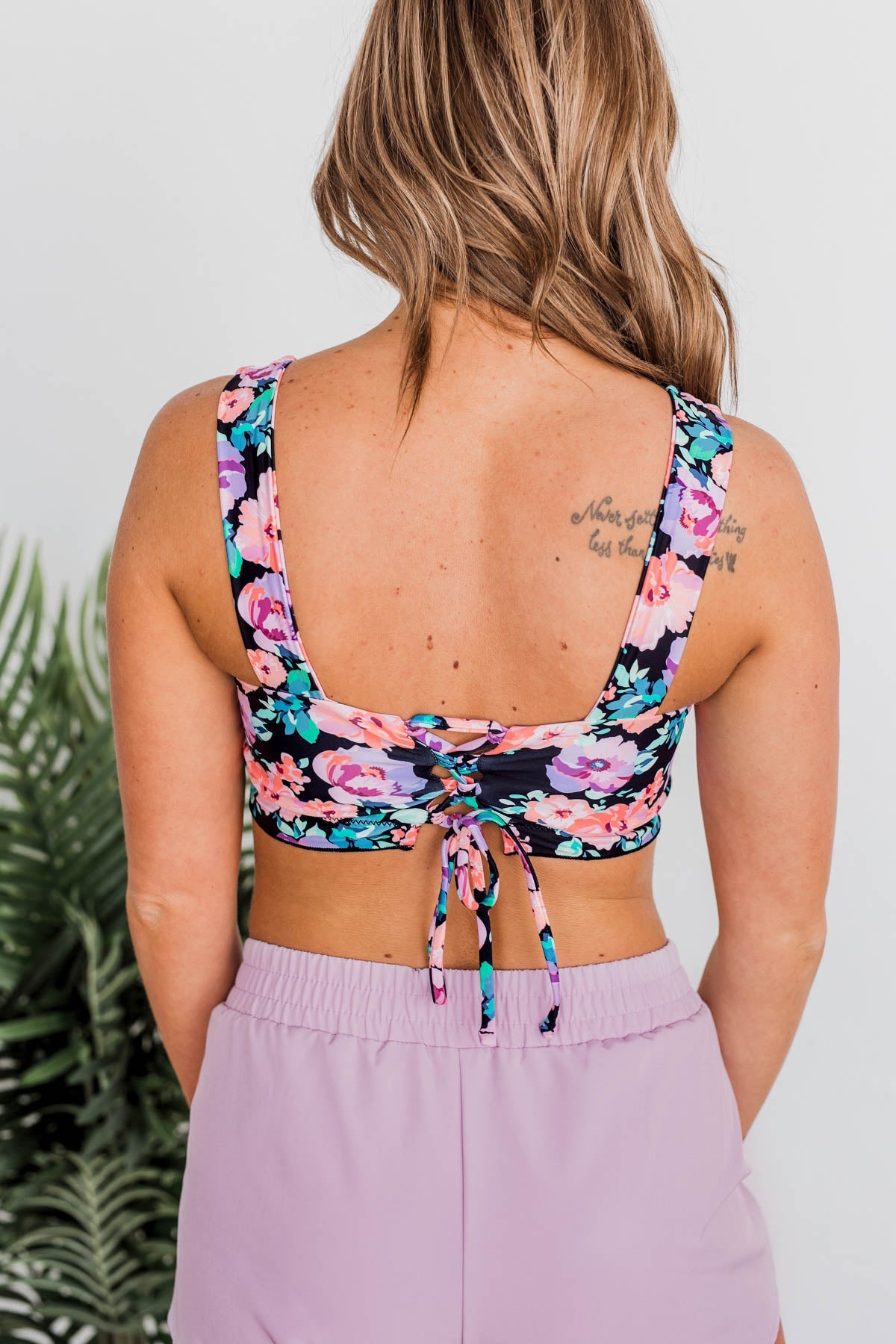 Make a splash with your stellar style in this gorgeous floral swim top! You’ll soak in every moment of your day with details like the cinched bust with a drawstring, ruffle trim along the bottom, and the braided drawstring back that allows you to adjust to your liking! This colorful top pairs well with a variety of colors making it a foolproof addition to your swimwear!