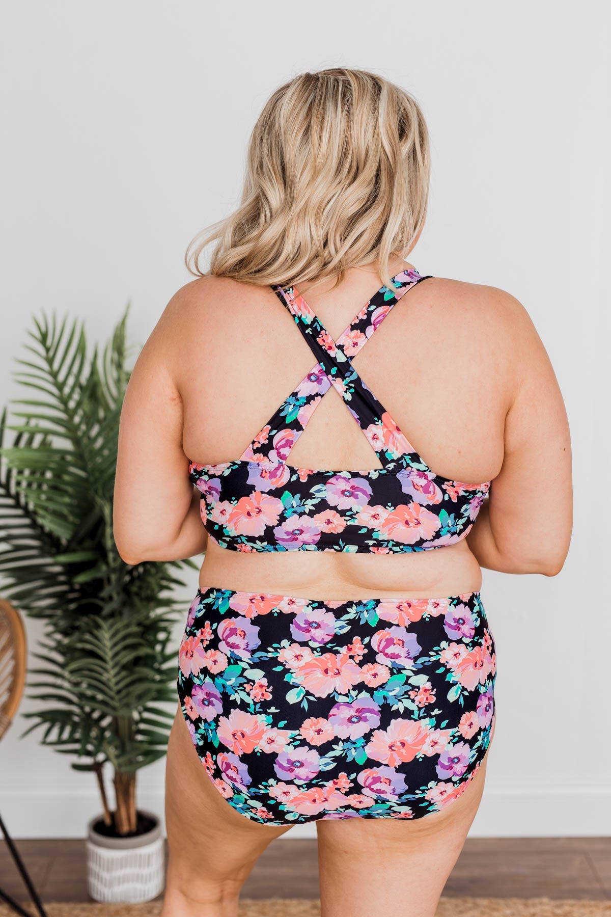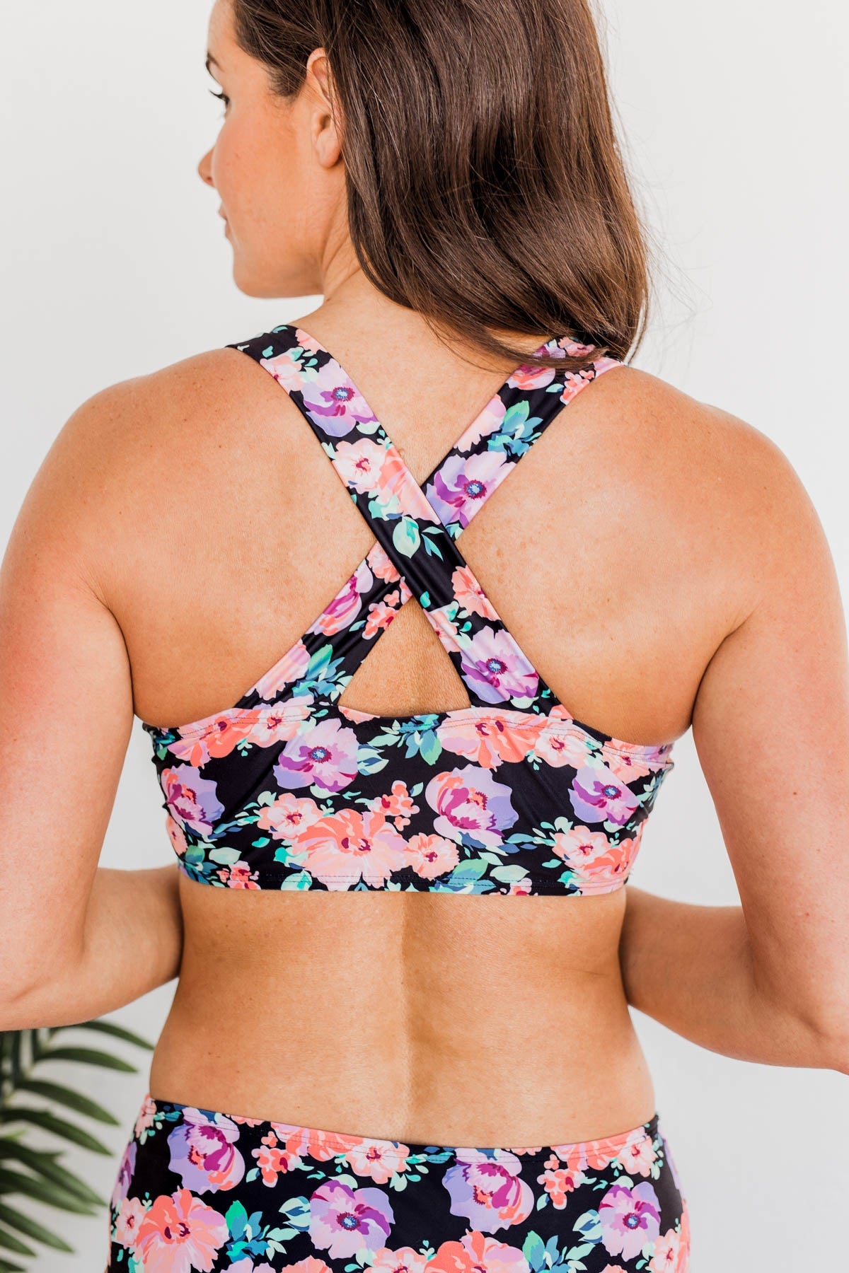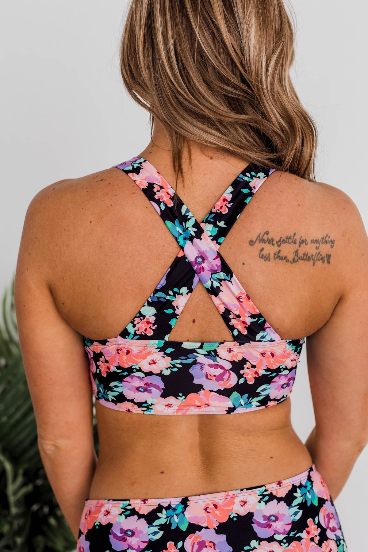 Tropical Breeze Floral Braided Swim Top- Black, Peach & Purple