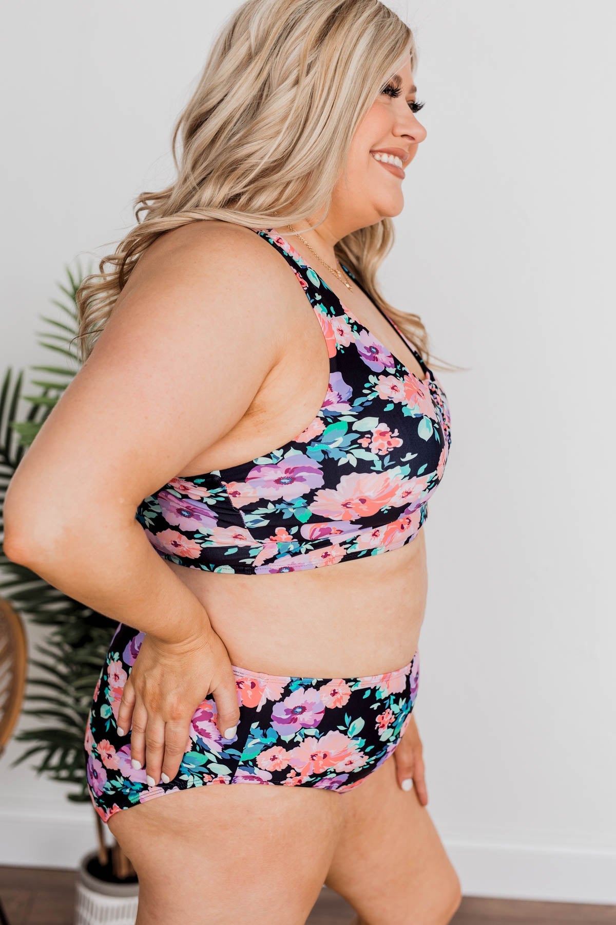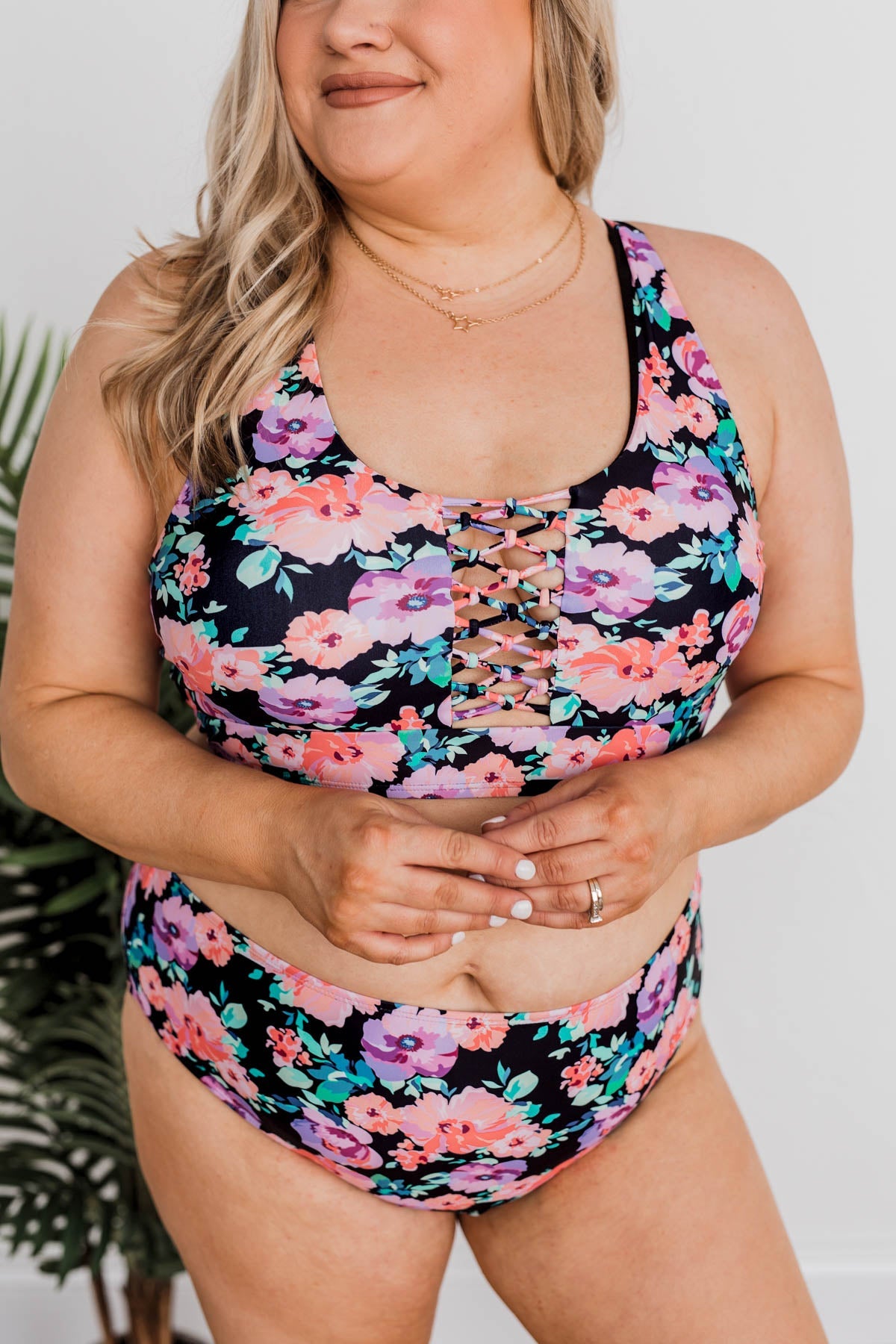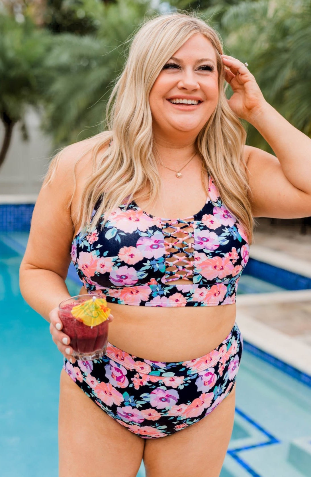 Tropical Breeze Floral Braided Swim Top- Black, Peach & Purple