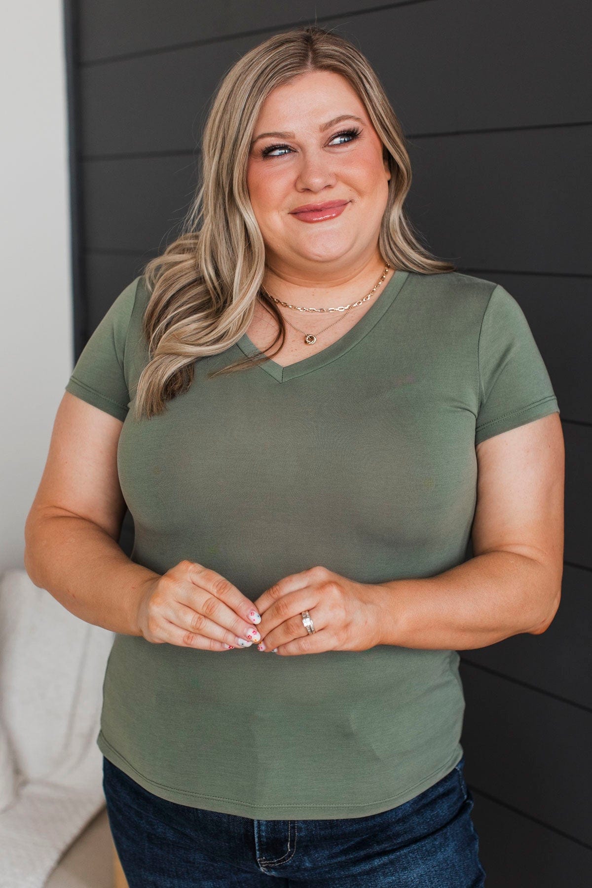 Something To Cling To V-Neck Top- Olive