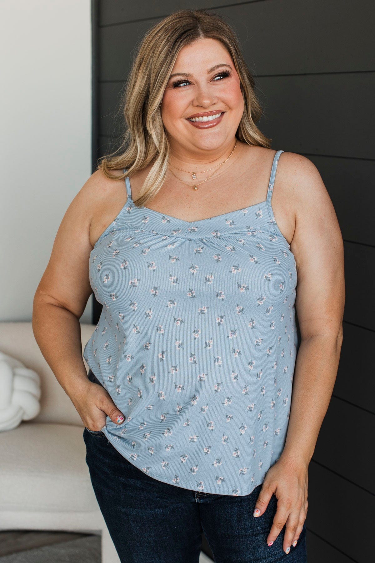 Whimsical Spirit Floral Tank Top- Denim Blue