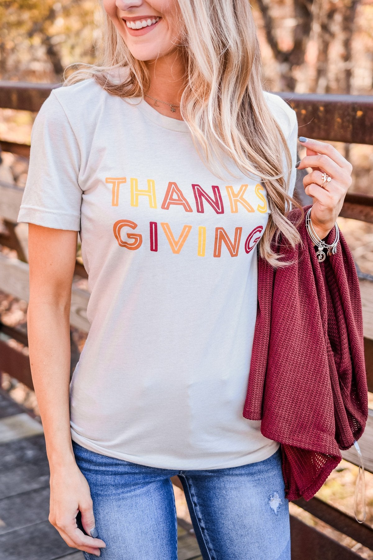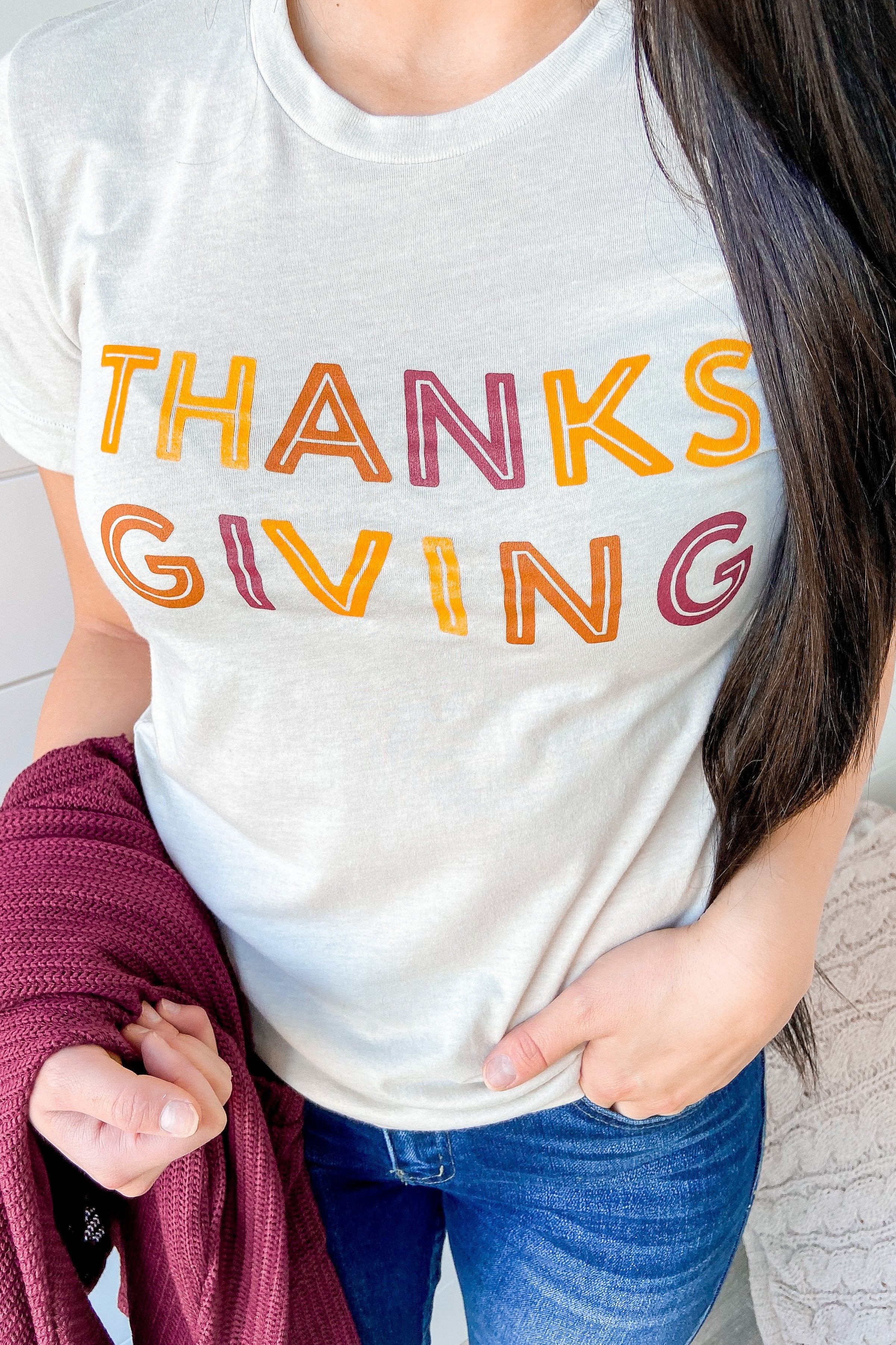 "Thanksgiving" Colorful Print Graphic Tee- Light Taupe