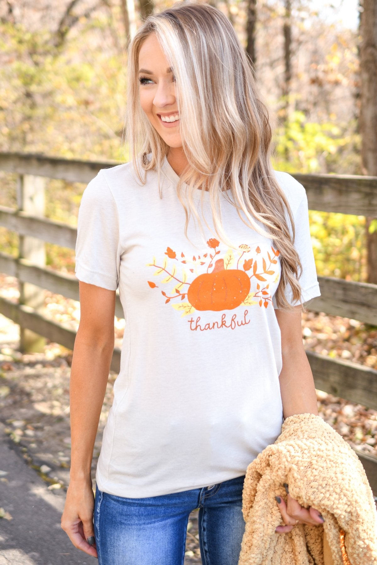 Festive "Thankful" Pumpkin Graphic Tee- Light Taupe