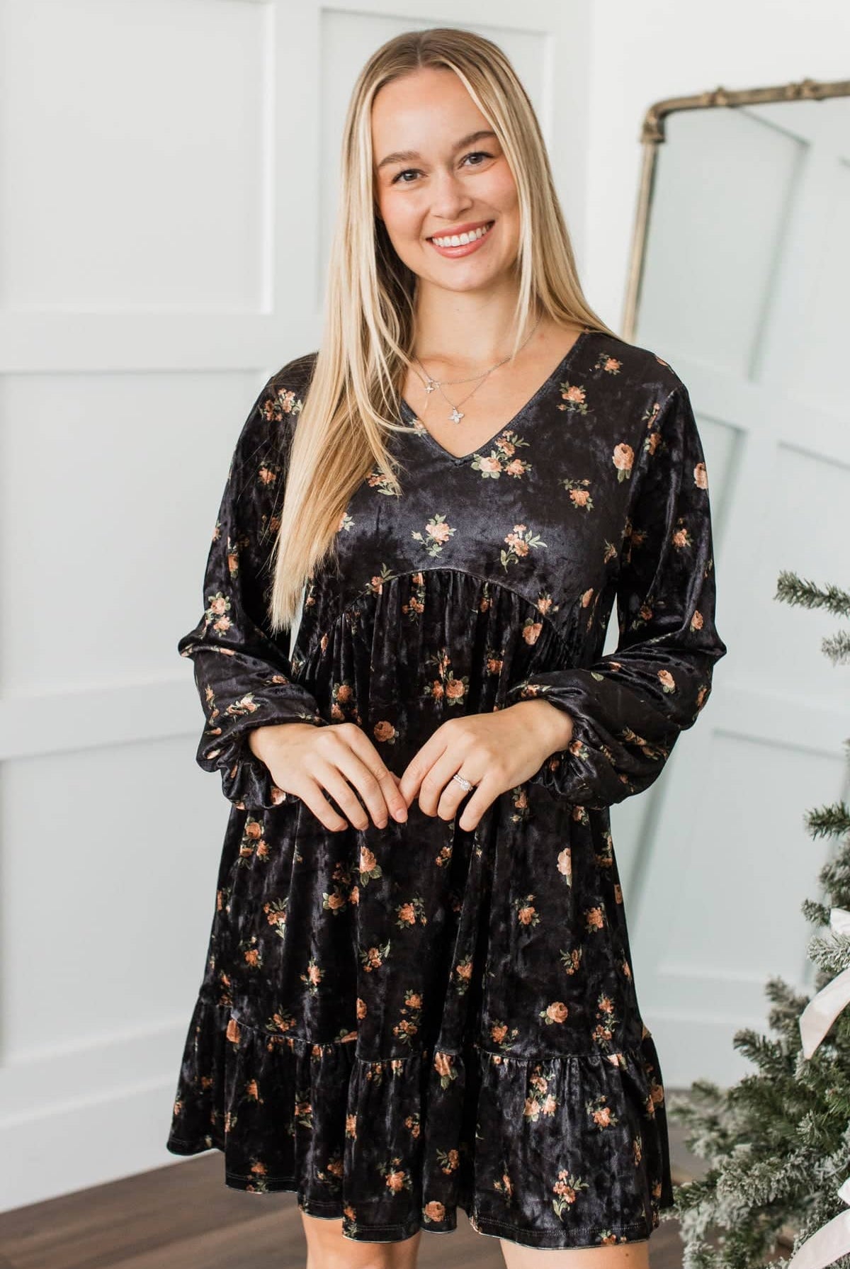 Enjoyable Evenings Floral Velvet Babydoll Dress- Black