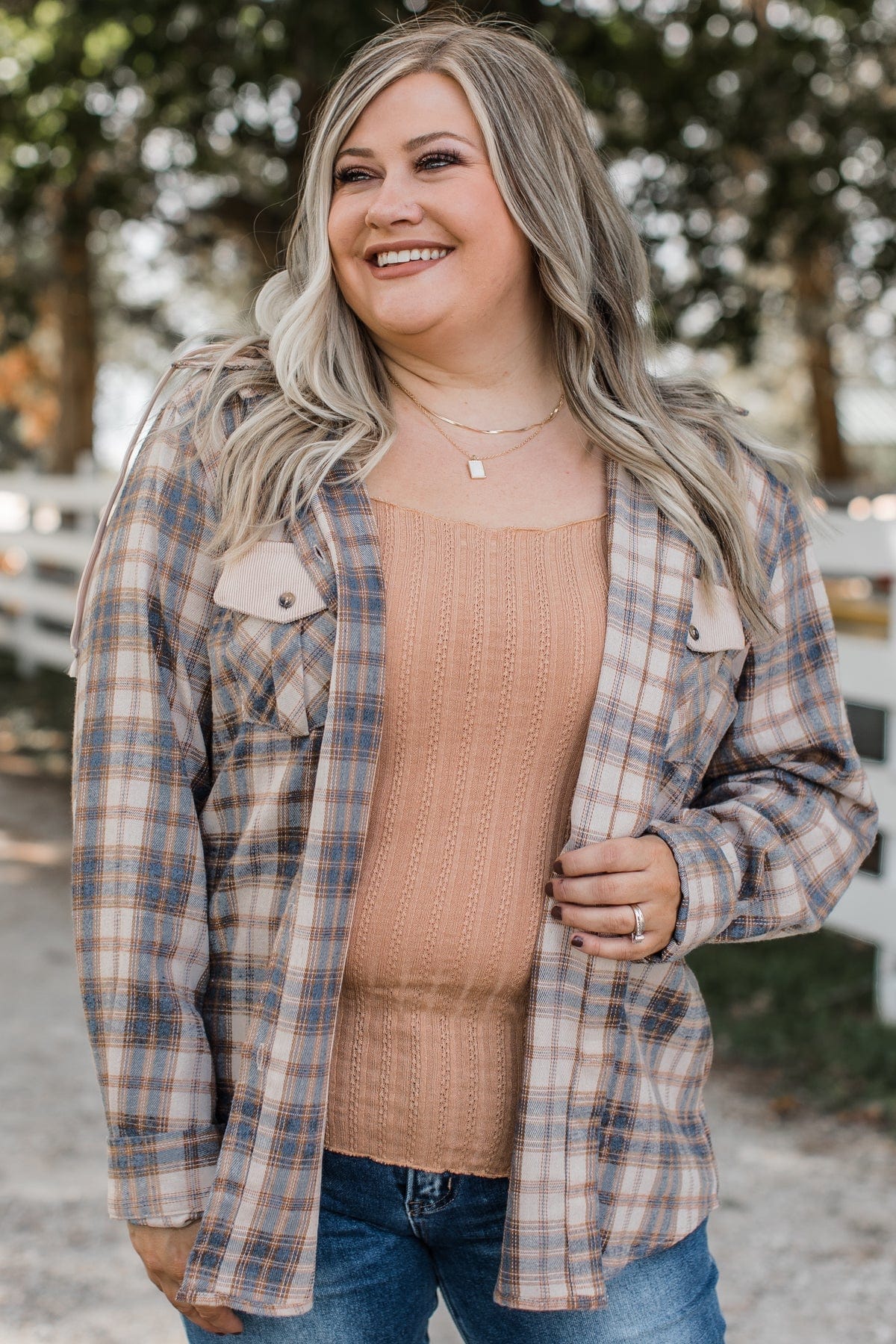 Shake It Off Hooded Button Top- Light Taupe & Navy