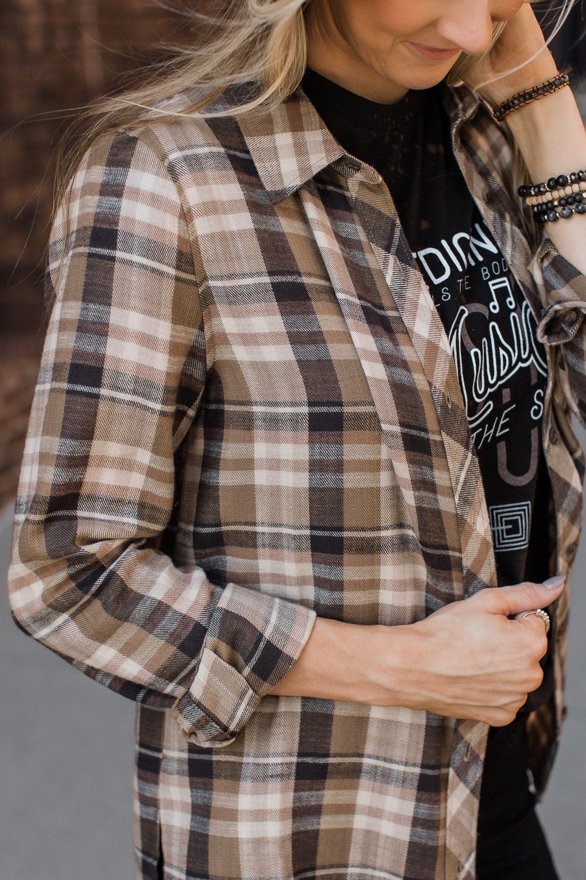 Time To Break Free Plaid Button Top- Khaki