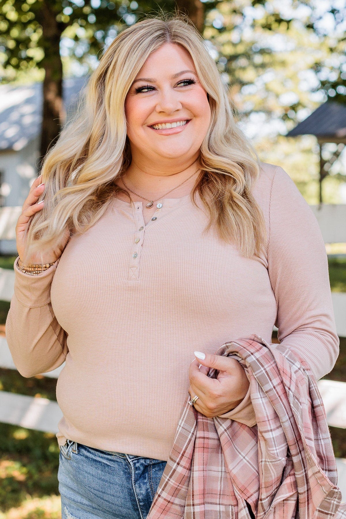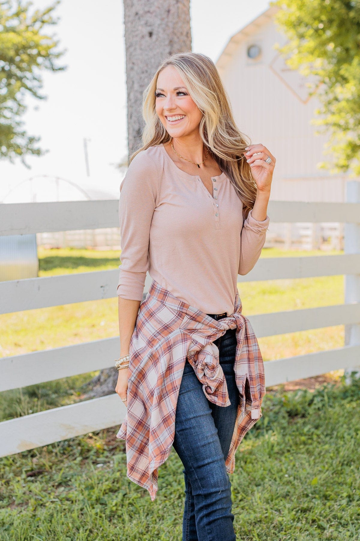 Rise To The Top Long Sleeve Henley Top- Beige