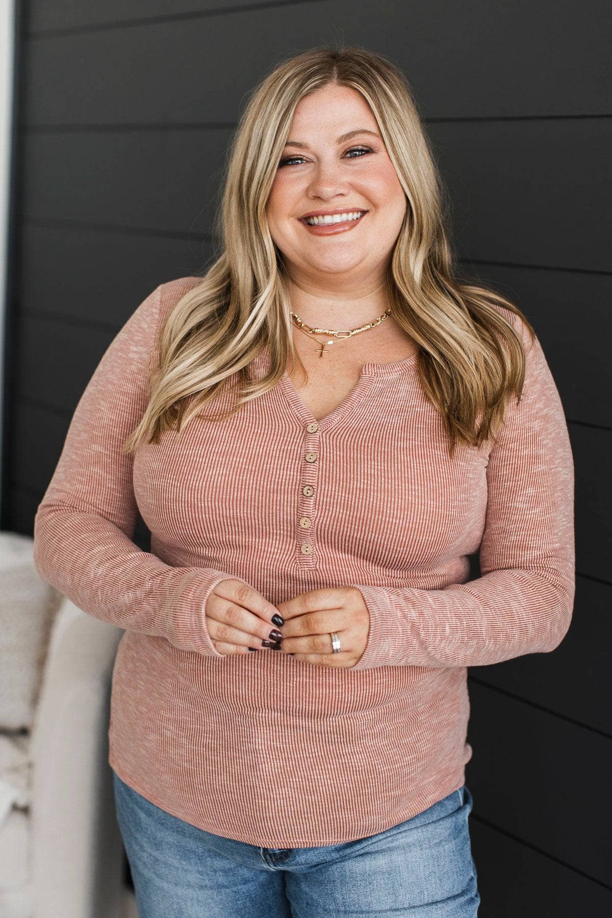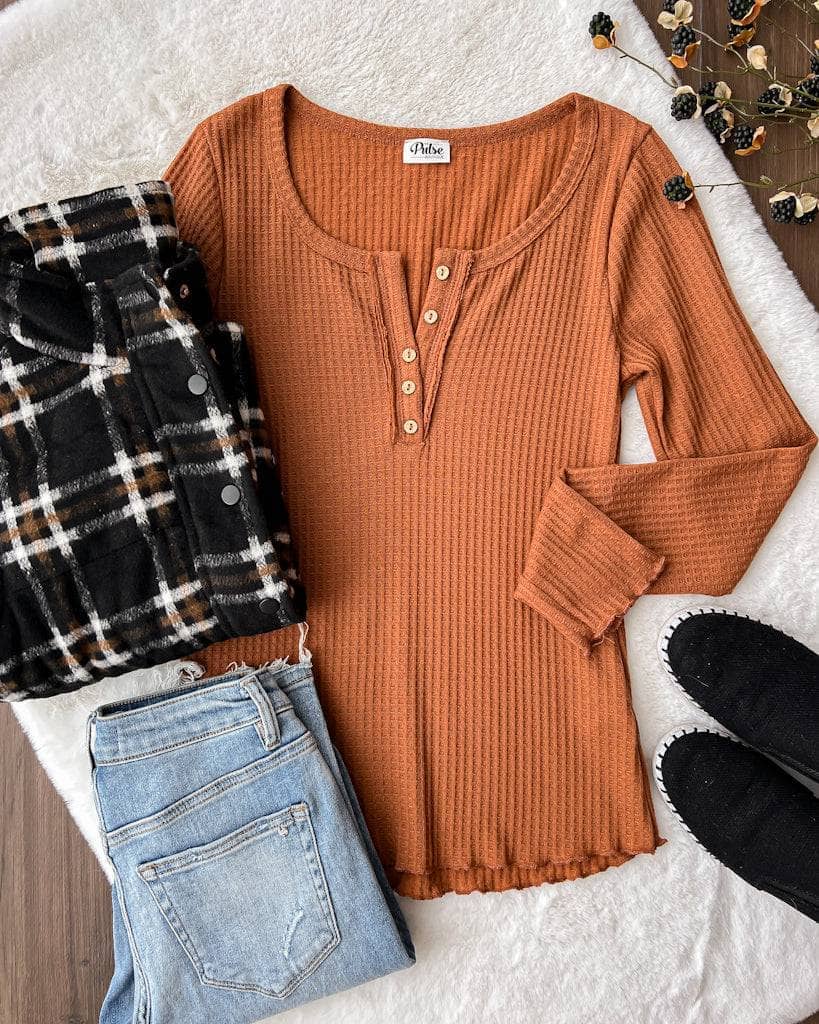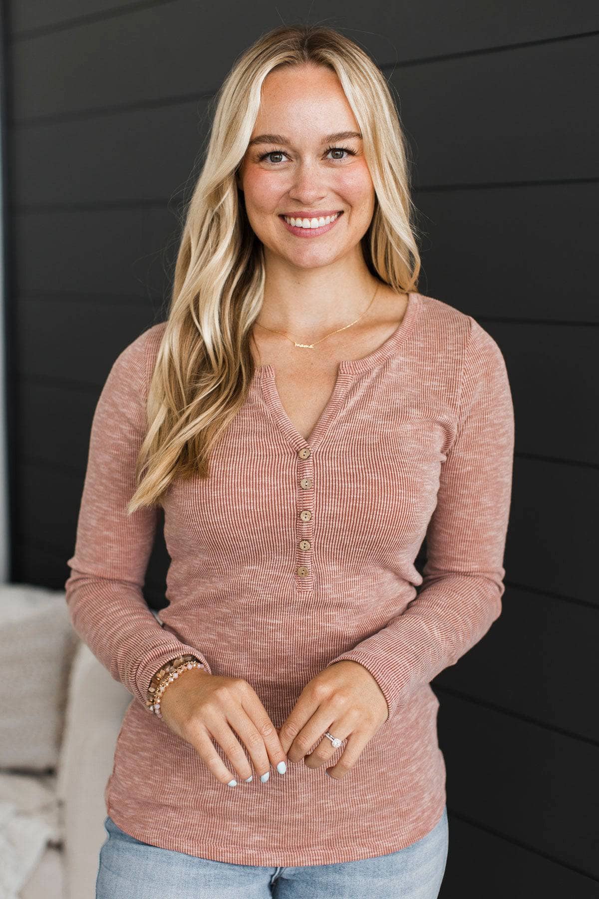 Laugh More Long Sleeve Ribbed Top- Dusty Peach