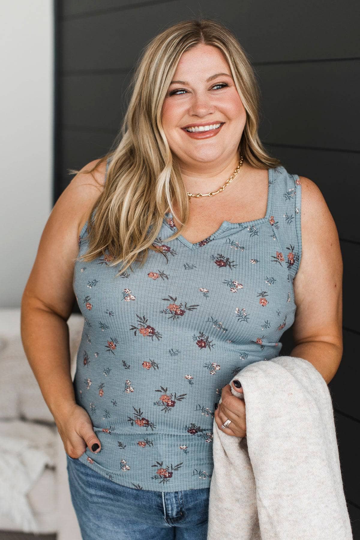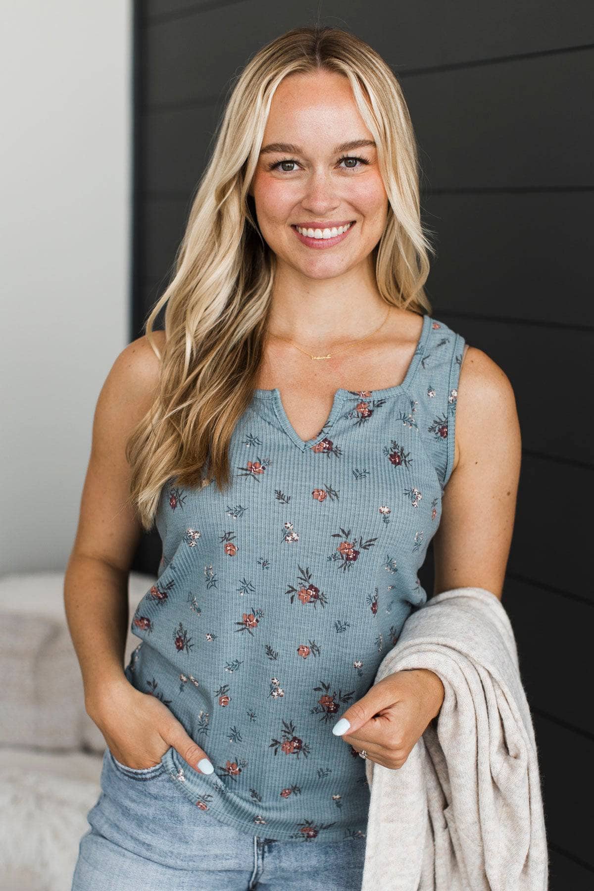 Being Myself Floral Tank Top- Denim Blue