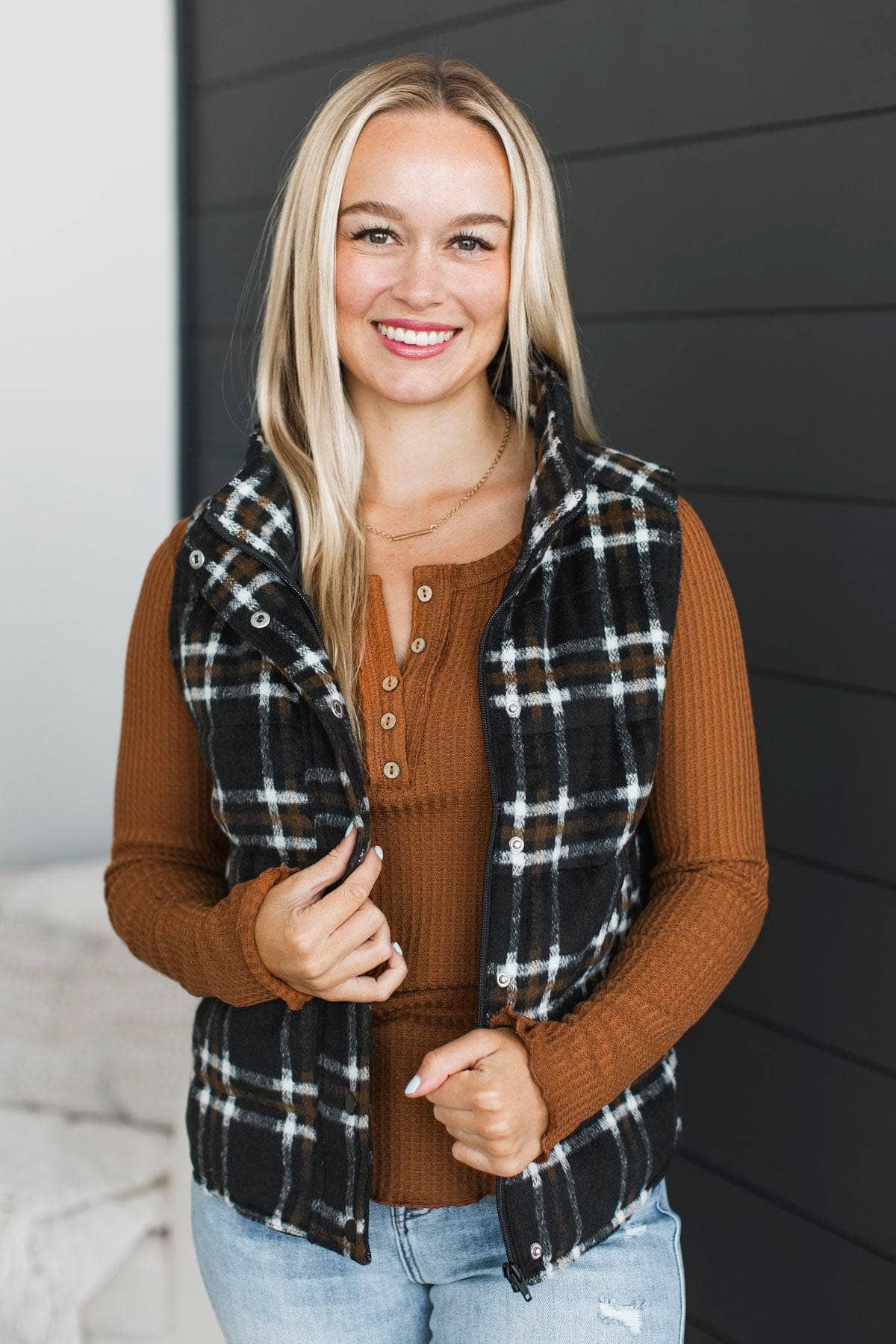 For You Always Plaid Puffer Vest- Black & Rust