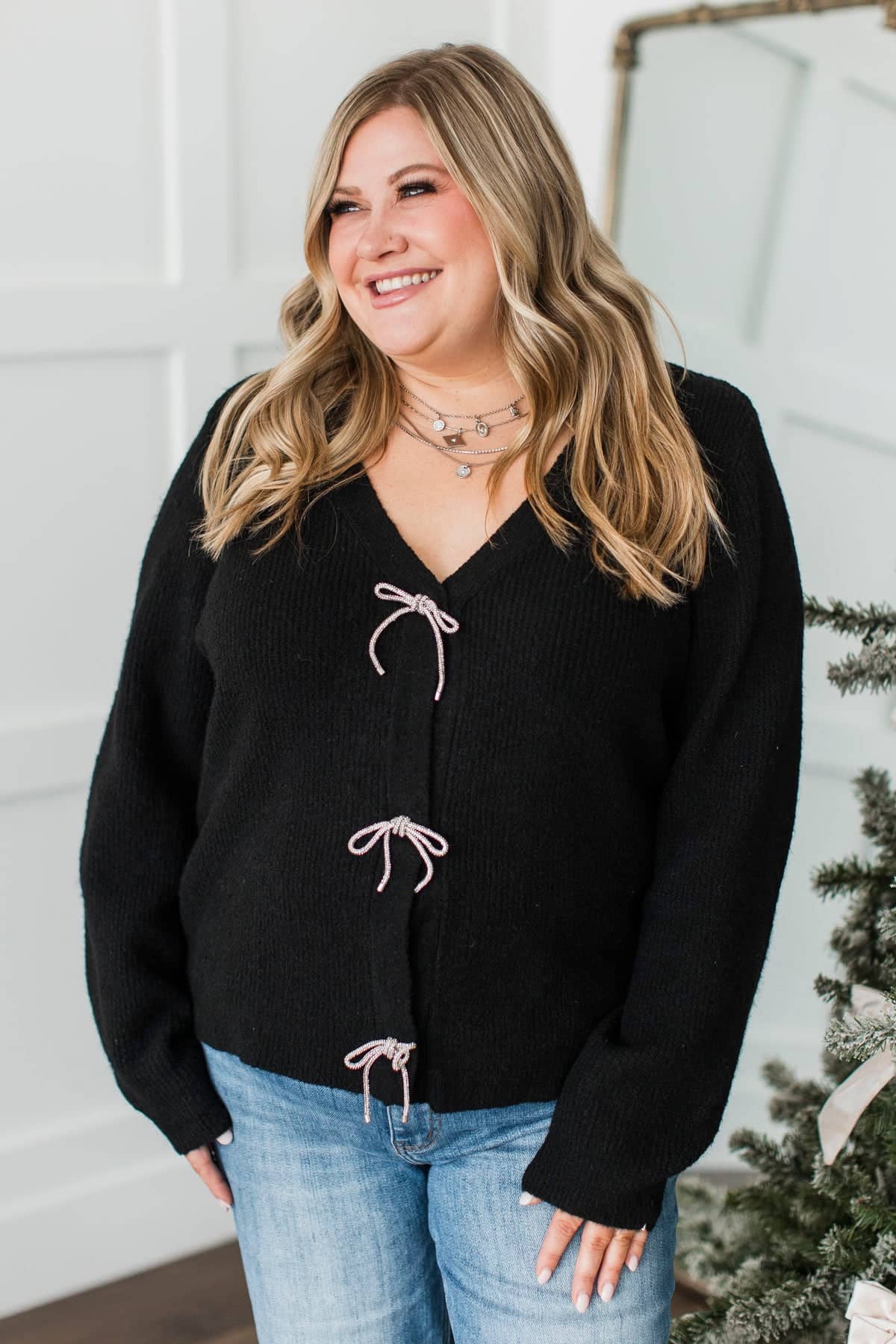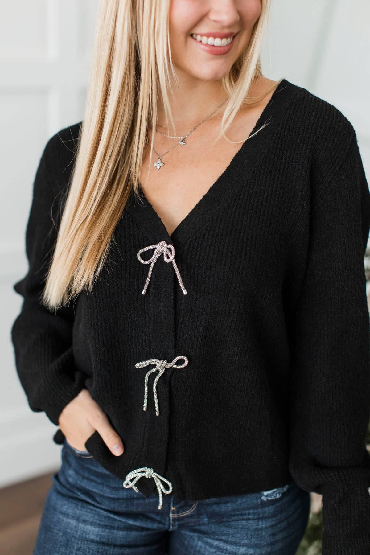 Best Memory Knit Bow Button Cardigan- Black