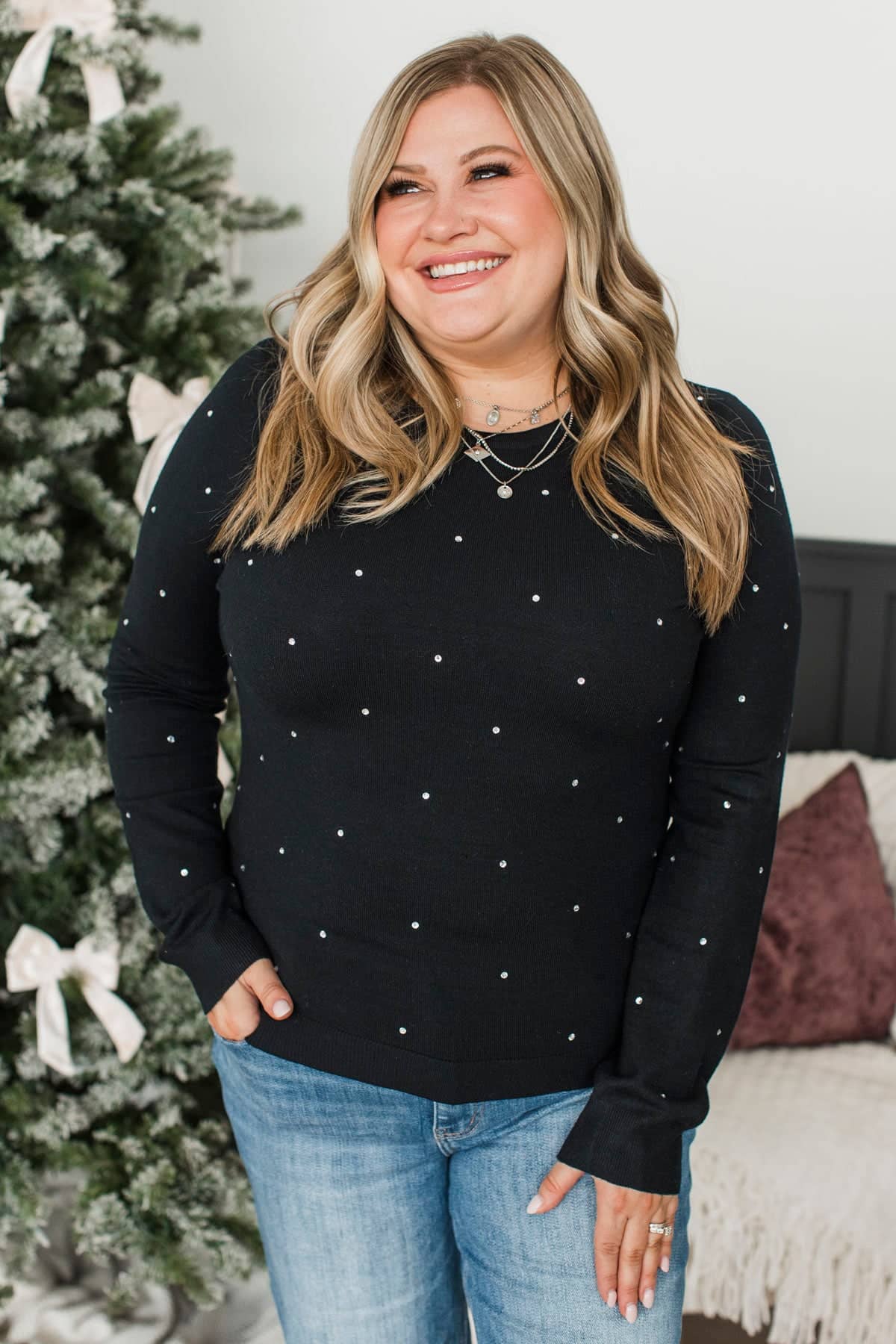 Enamored By You Rhinestone Knit Sweater- Black