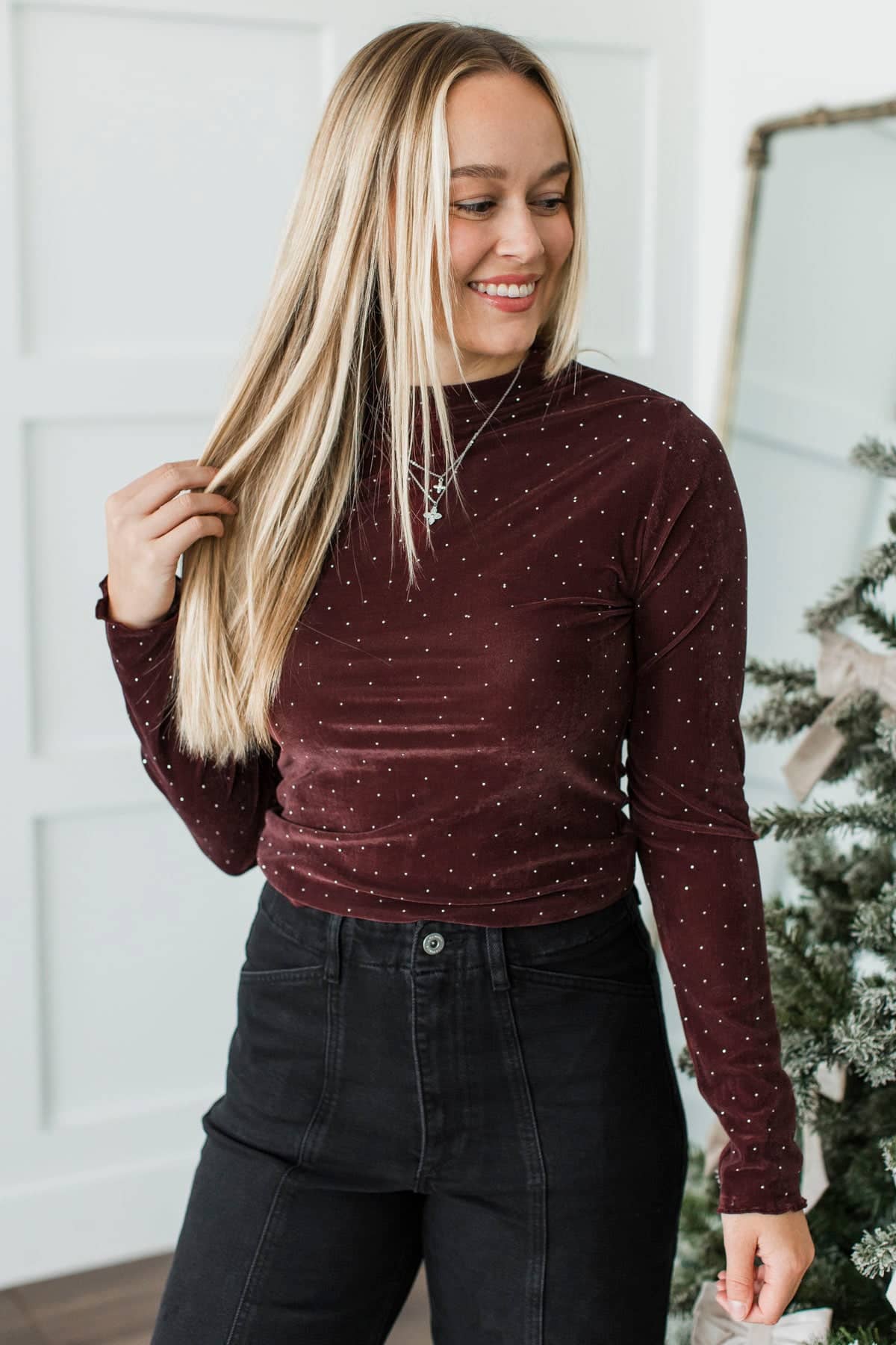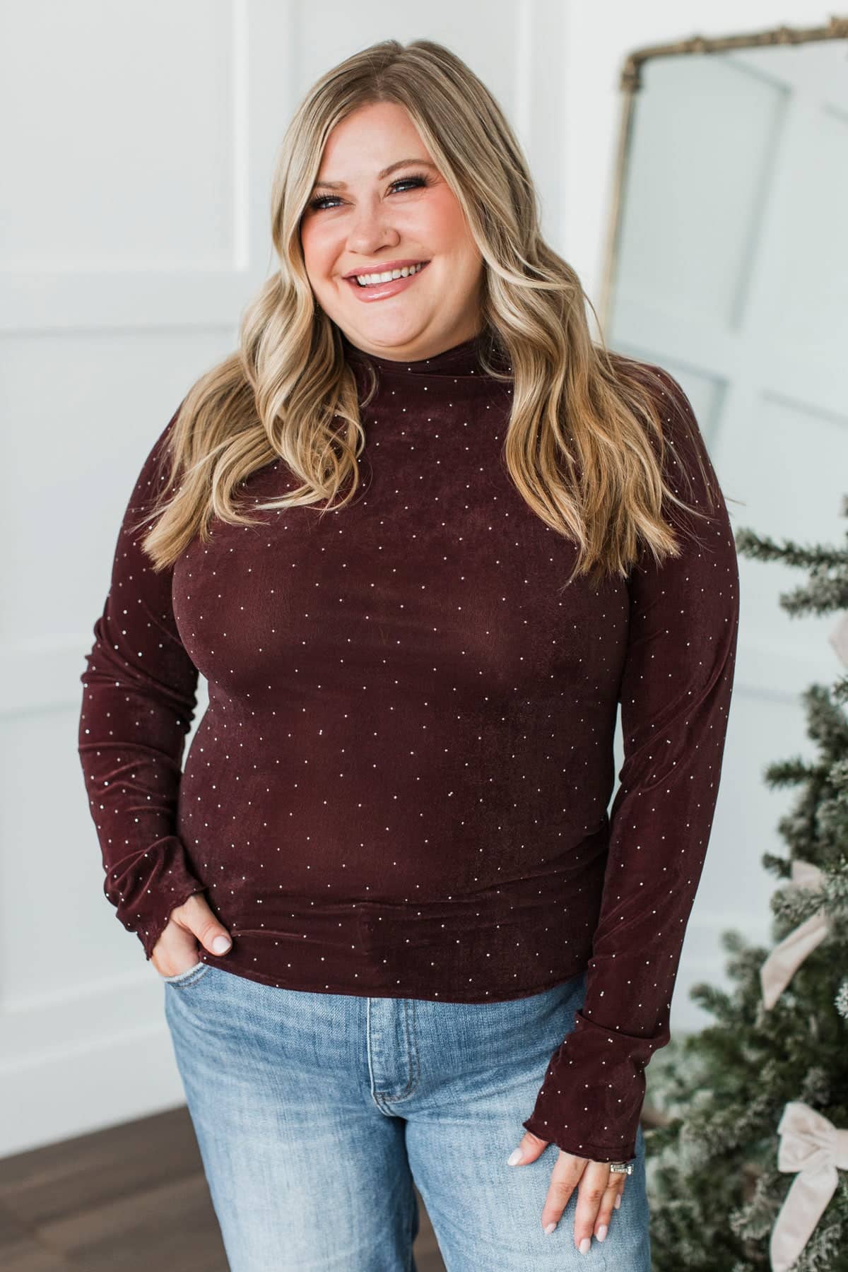 Devine Looks Velvet Rhinestone Top- Wine