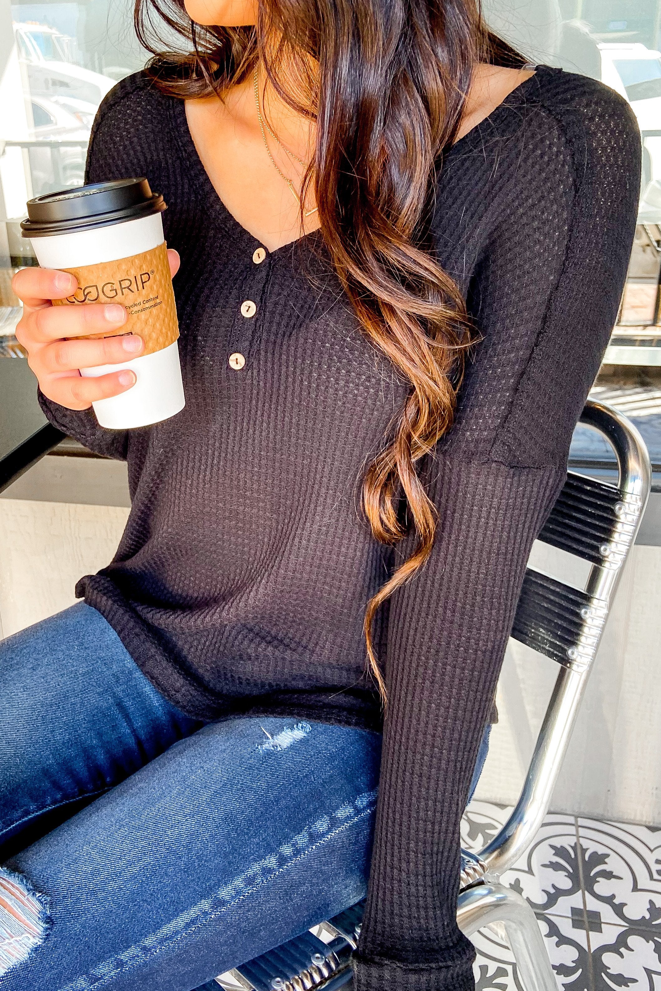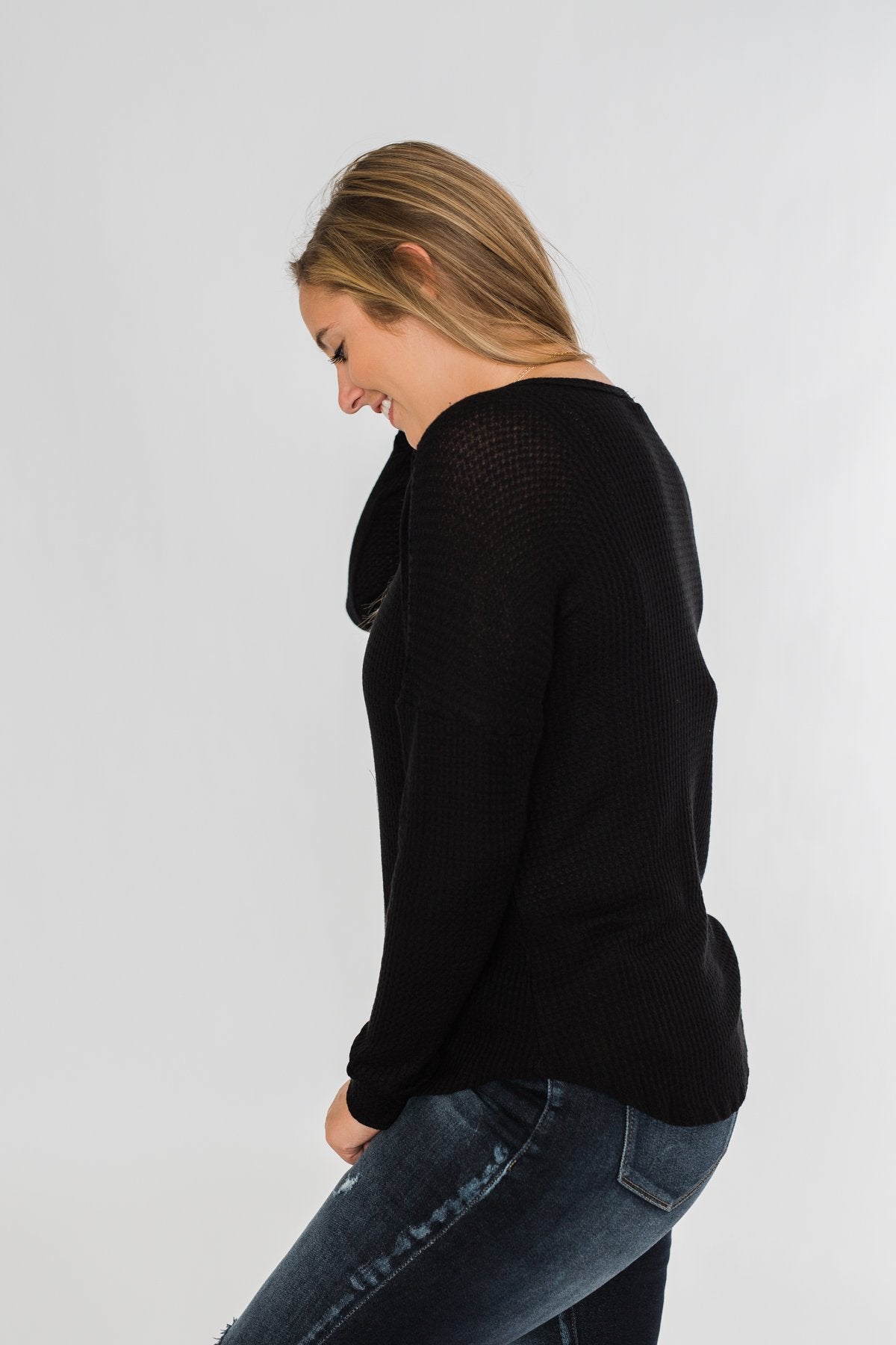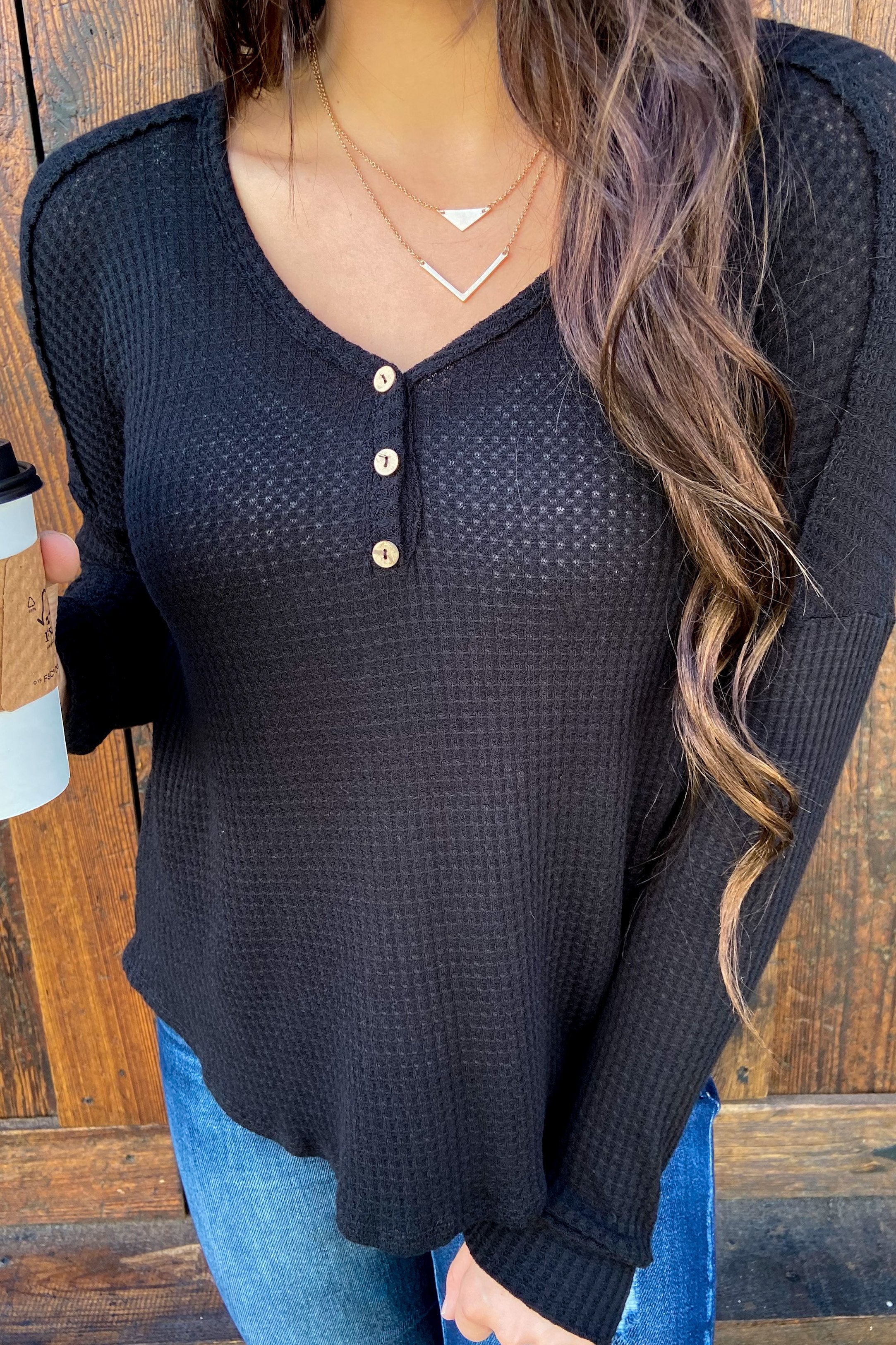 Knowing You V-Neck Thermal Top- Black