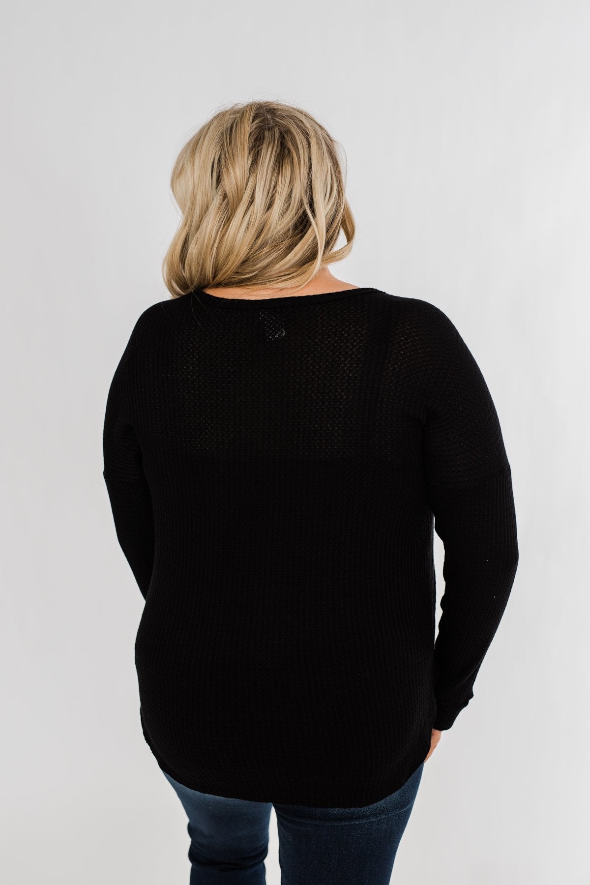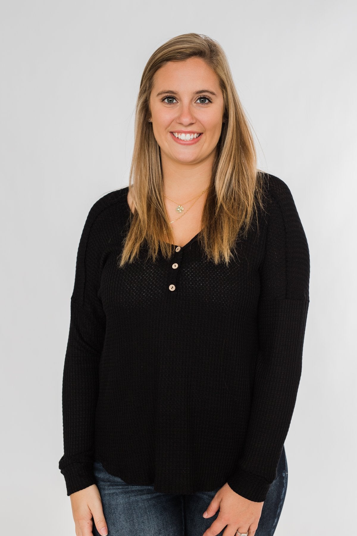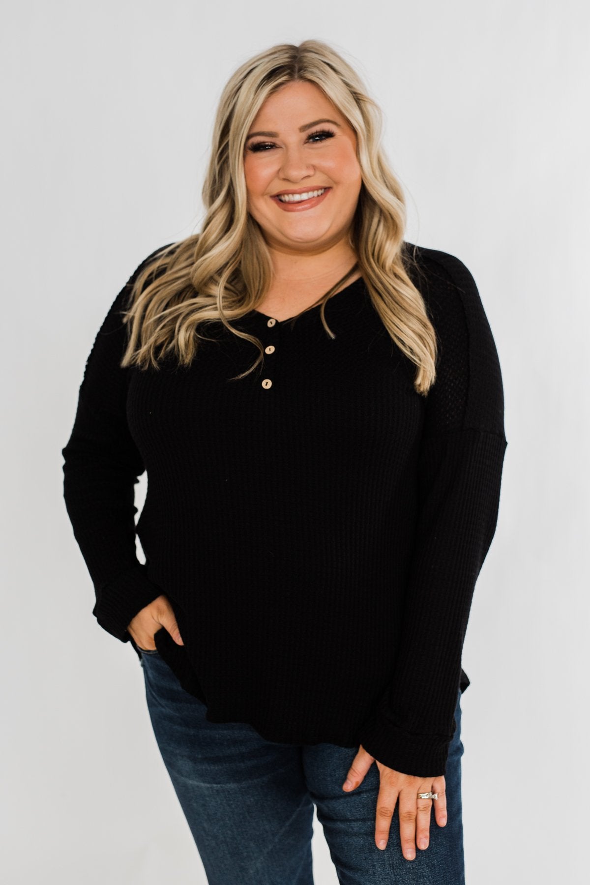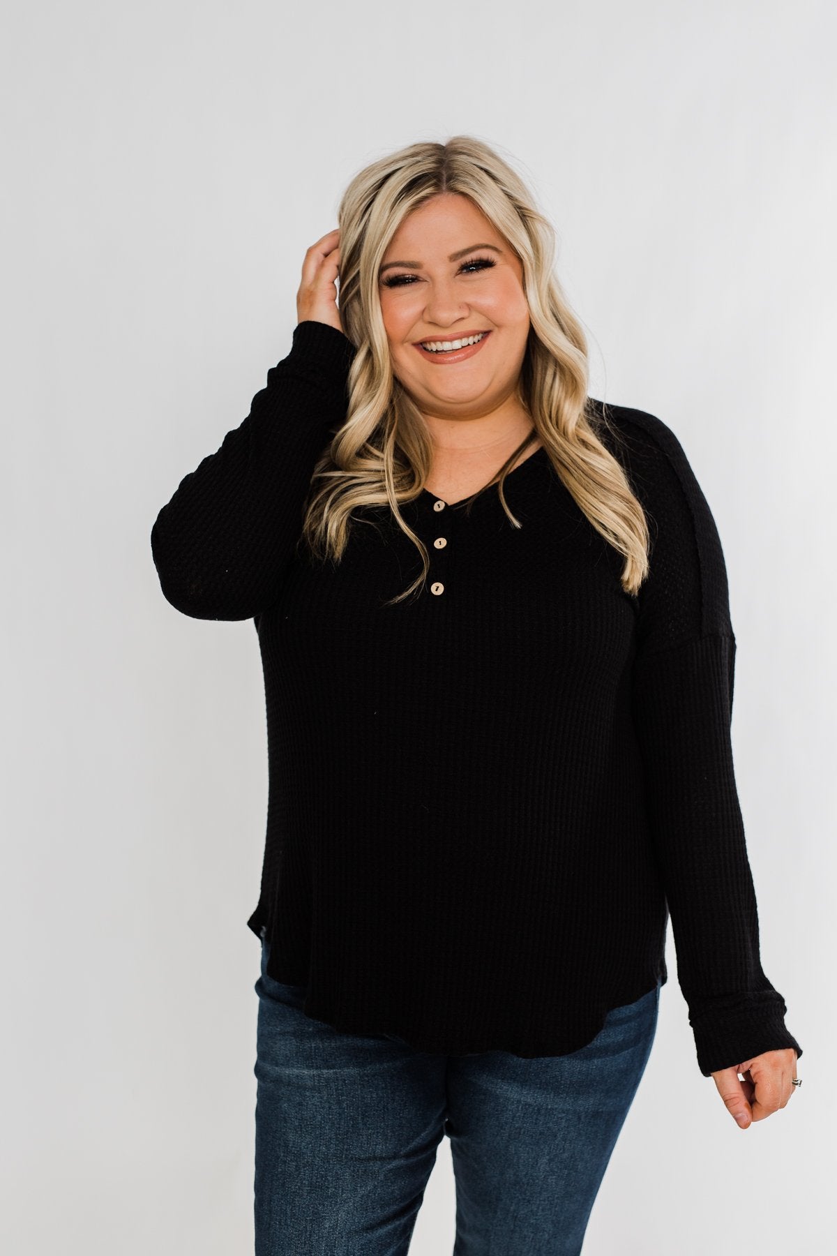 Take on the day with this cute and casual long sleeve top! Featuring a non-functional button neckline on a soft, breathable waffle knit material that is sure to keep a smile on your face all day long. Pair this with a denim jacket and some bold booties for the ultimate outfit for the upcoming seasons! This charming top is the perfect mixture of cute and casual making it the ideal top to add to your seasonal wardrobe!